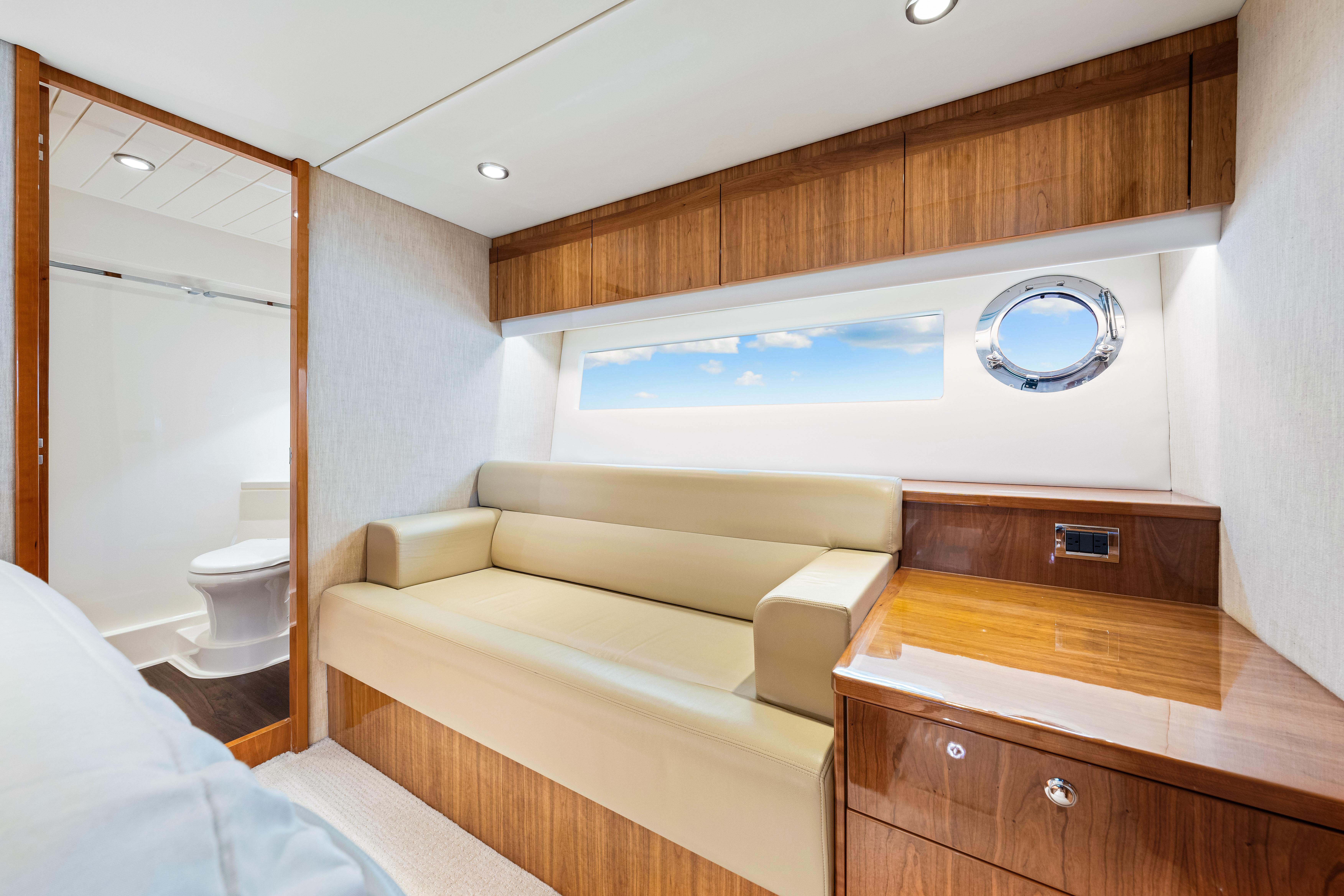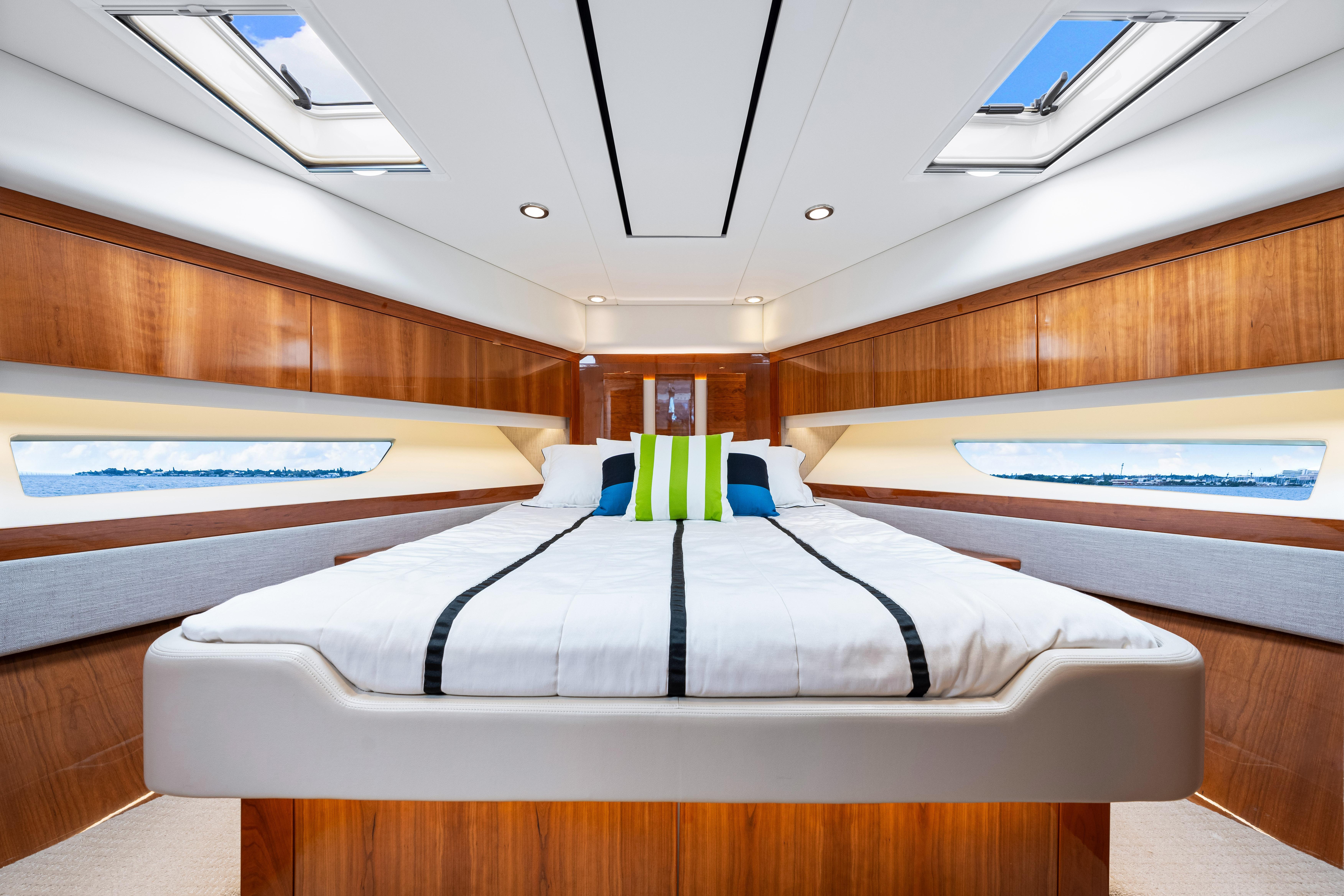 Natural light filters into the VIP stateroom courtesy of fixed hull windows with tinted, tempered glass with blinds for privacy, while light and fresh air are delivered through two hatches, which can also be screened for privacy. There is also convenient reading and overhead lighting.