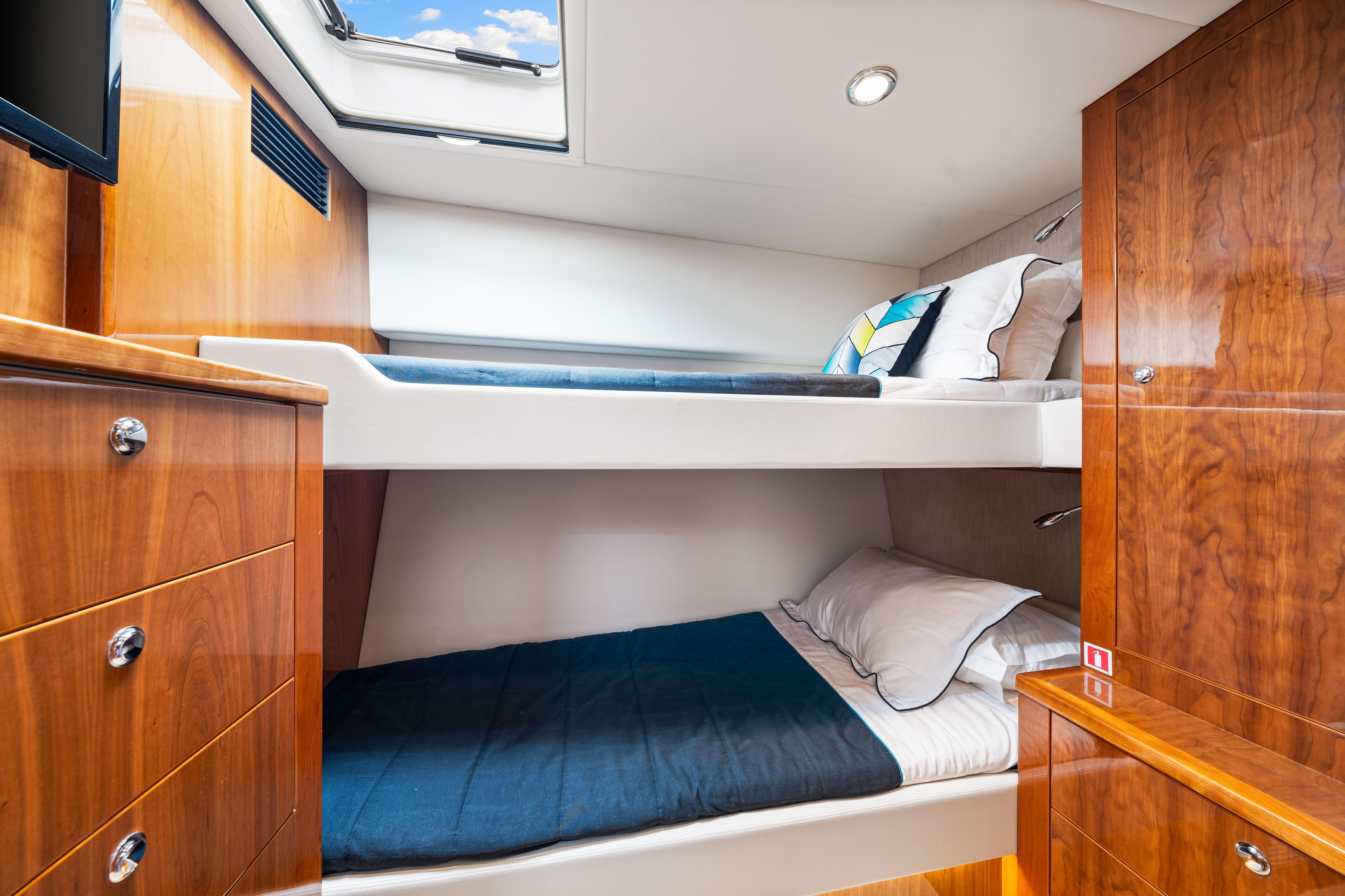 The starboard stateroom is also air-conditioned and features adult-sized upper and lower beds, also with innerspring mattresses. This stateroom also has a mirror and drawers, a hanging locker with LED lighting and drawers below, a hatch with Oceanair blind, reading and overhead lighting. Here there’s the option for a large LED TV/DVD combination unit and stereo with Bluetooth interface, including two speakers ... a fun retreat for the kids.