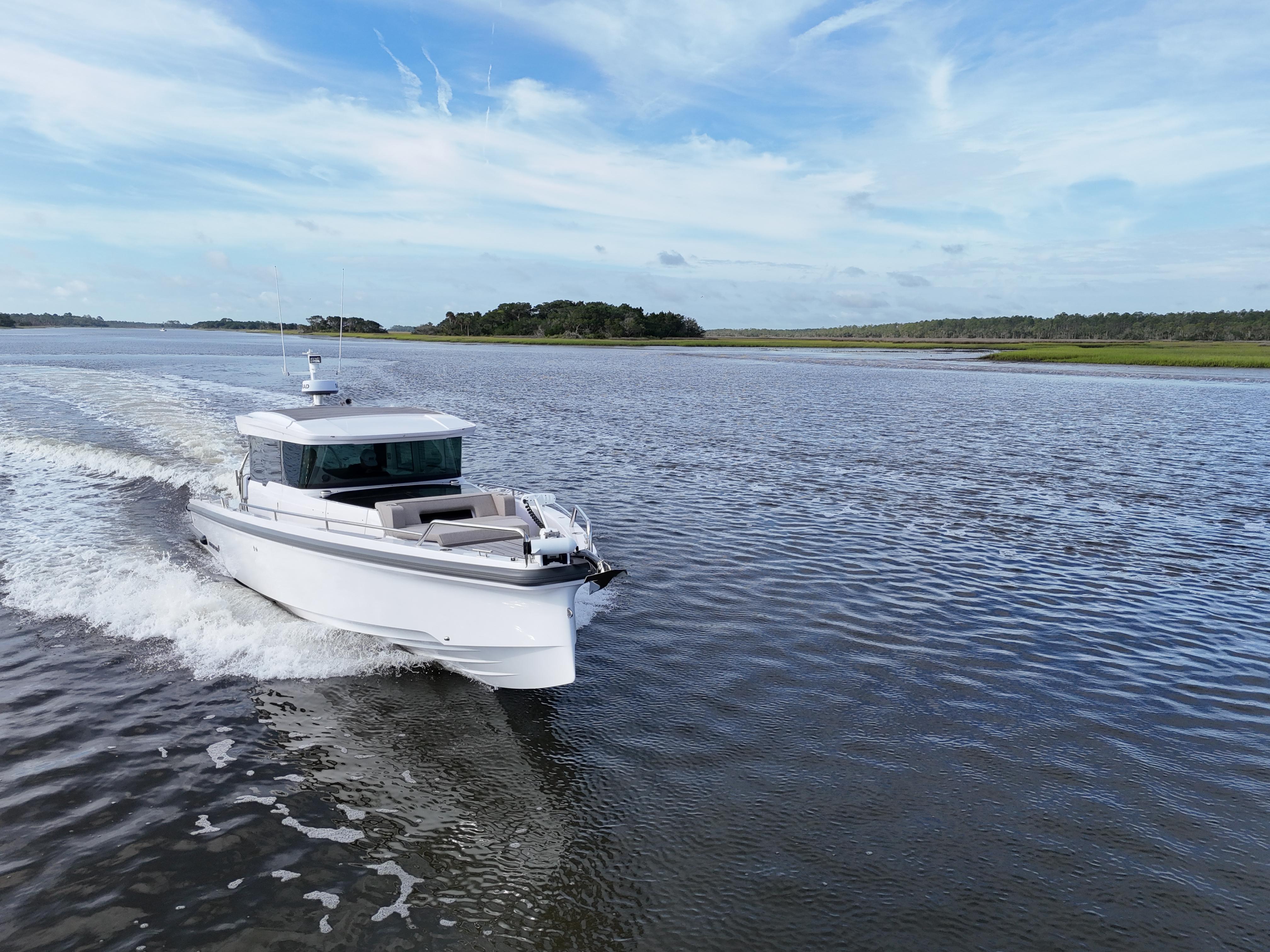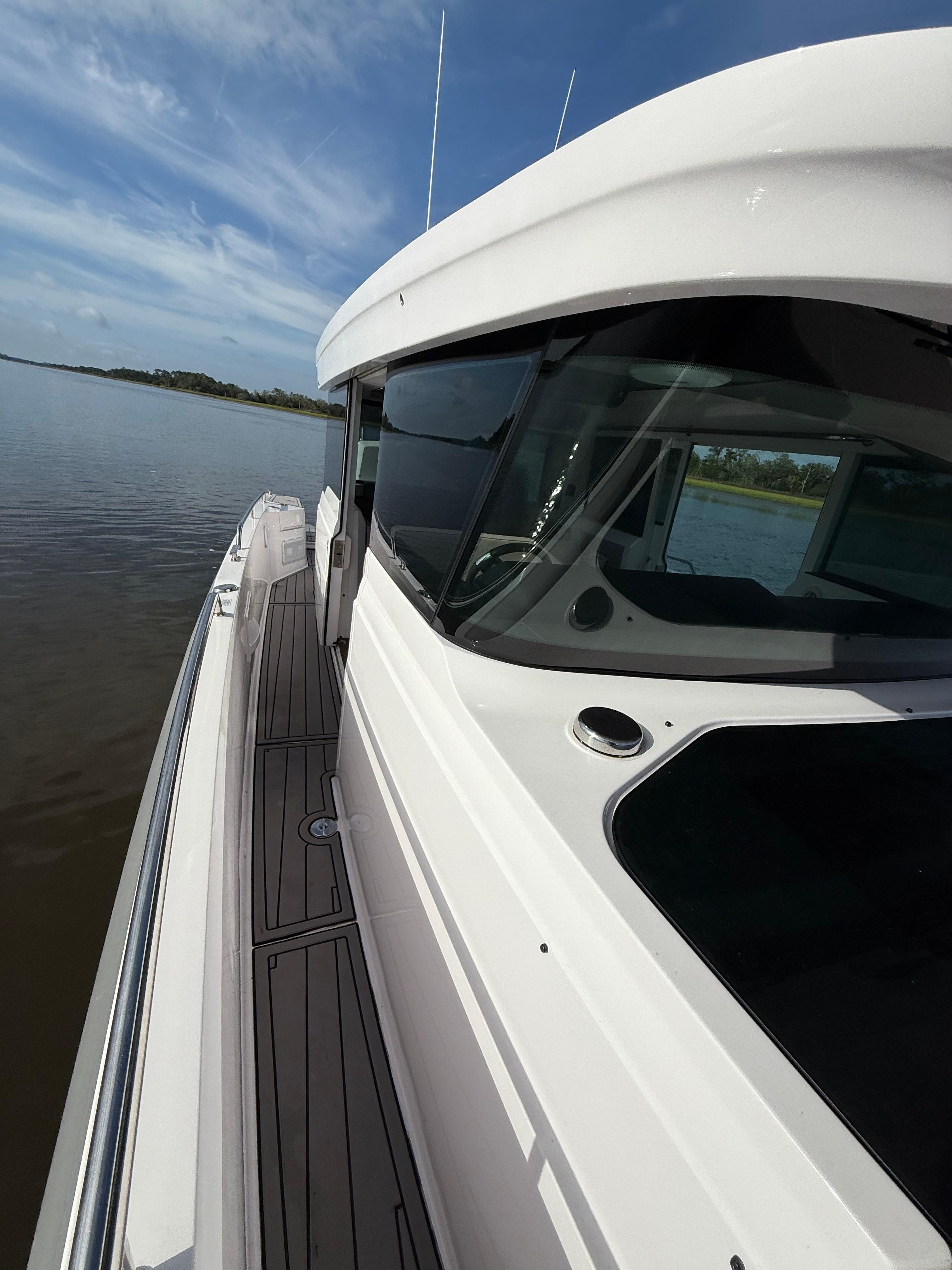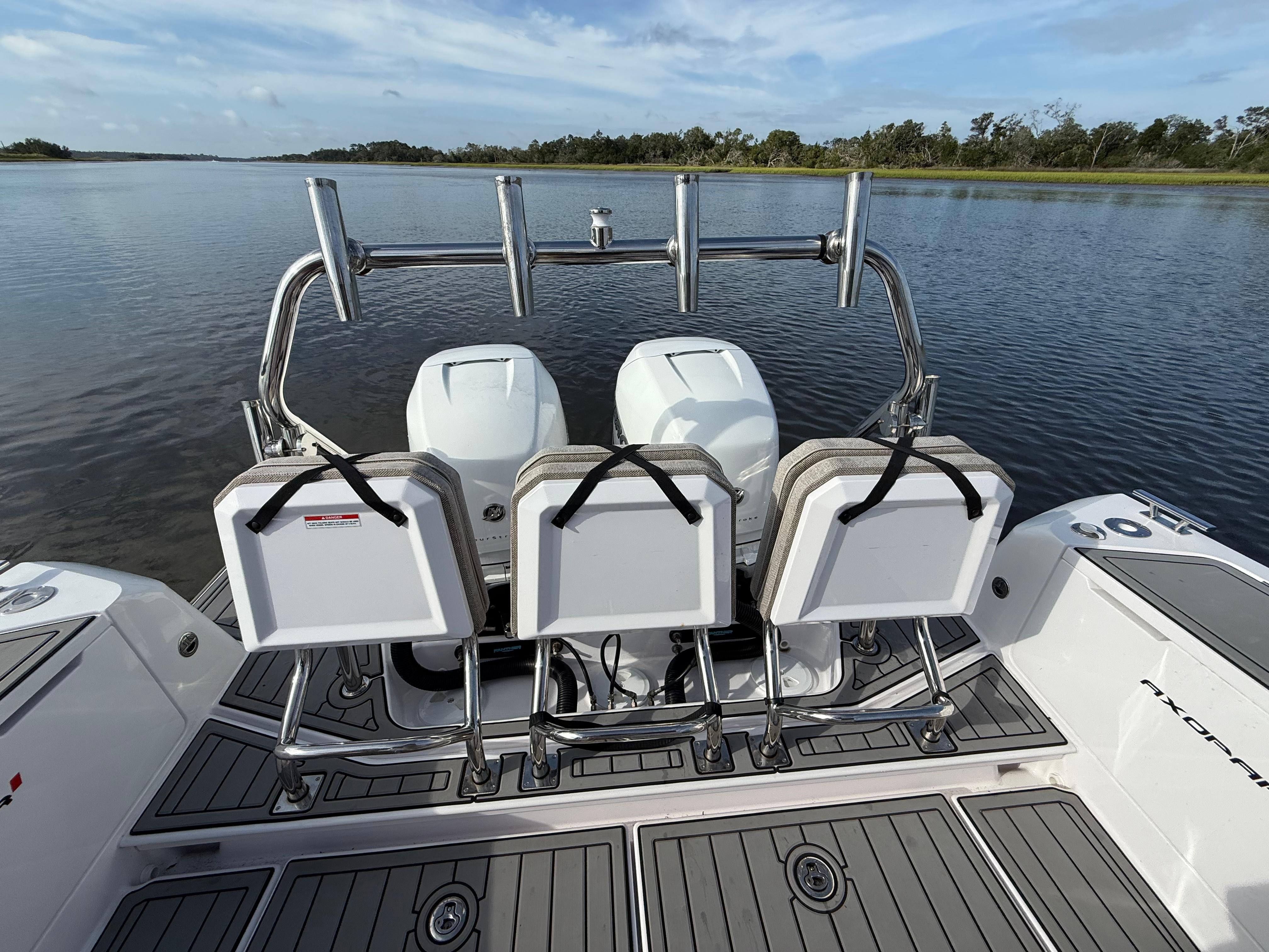 Introducing the 2023 Axopar 37 Cross Cabin, a remarkable center console boat that combines style and performance. With an overall length of 37 feet, this vessel is designed for both adventure and comfort on the water. Crafted from durable fiberglass, it boasts a sleek hull that enhances its agility and stability. Powered by three Mercury V8 Verado outboard engines, each delivering an impressive 300 hp, this boat achieves a cruising speed of 38 knots and a maximum hull speed of 48 knots, ensuring exhilarating rides. The stainless steel 4-blade propellers provide exceptional maneuverability, making it perfect for both leisurely outings and thrilling excursions. With 235 hours of use, this used model is in excellent condition, ready for new adventures. The Axopar 37 Cross Cabin is not just a boat; it's an invitation to explore the open waters with confidence and style.NOTABLE FEATURESTwin Mercury Verado 350's low hoursFull Simrad electronics suiteBow Thruster side power Minn Kota trolling motorTriple axle aluminum trailerBoat is stored in a covered lift.Windlass with remote.Rocket launcher/ski pylon In the market for a super clean ,well maintained fishing, cruising or Island hopping look no further this beauty will do it all in comfort.