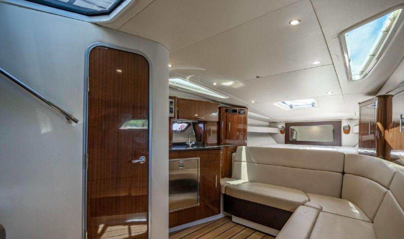To starboard is an entertainment center/wet bar. Our test boat had a number of options at this location, most notably an electric grill, a cockpit refrigerator (that can be replaced with an ice maker), and a flatscreen TV that drops down from the overhead (which is a great use of space.