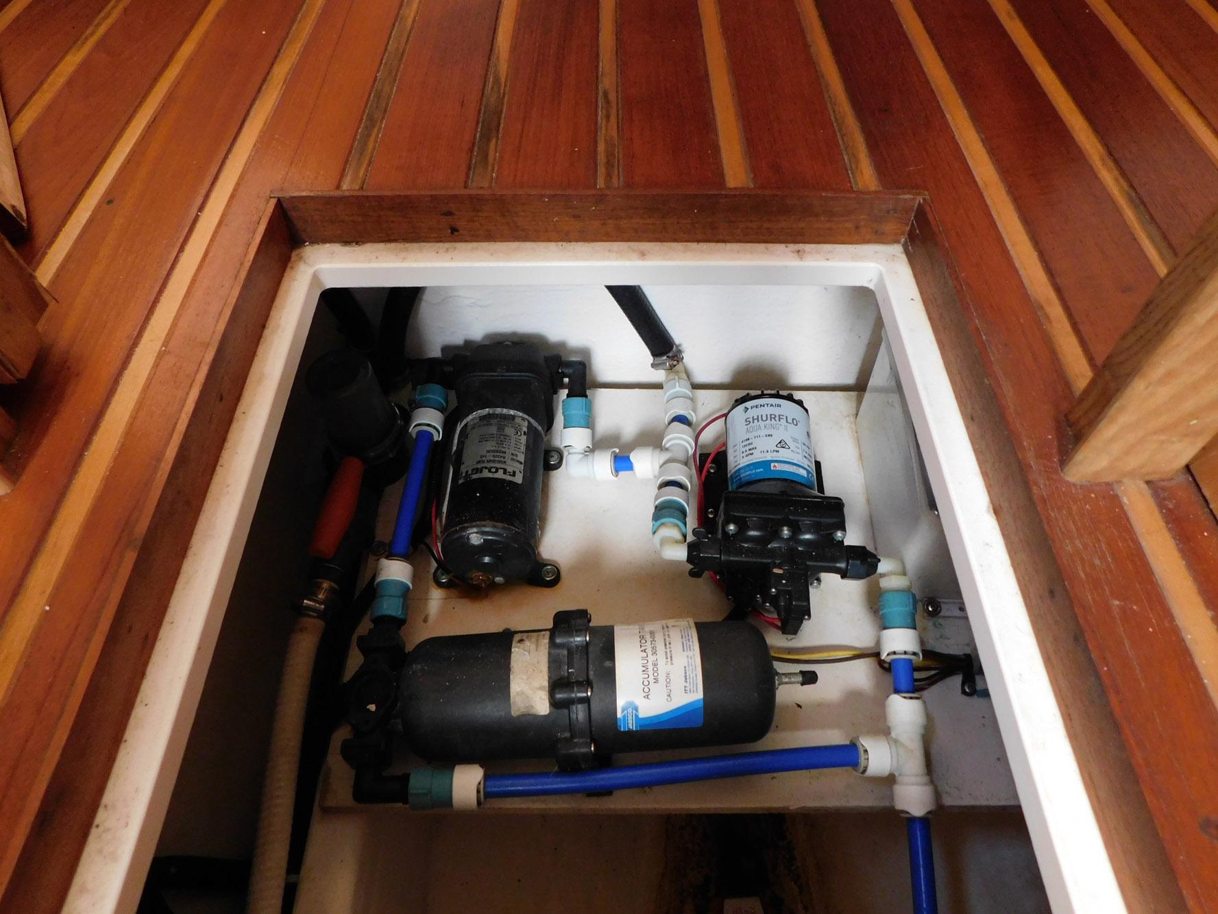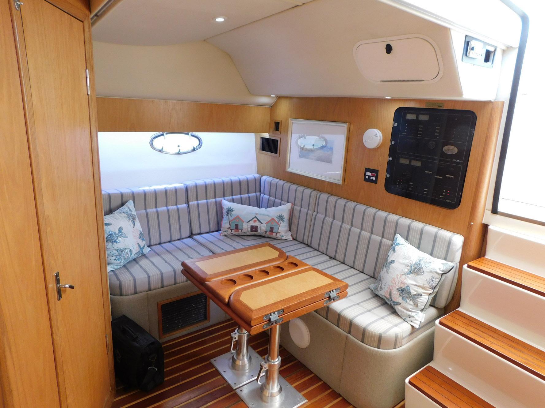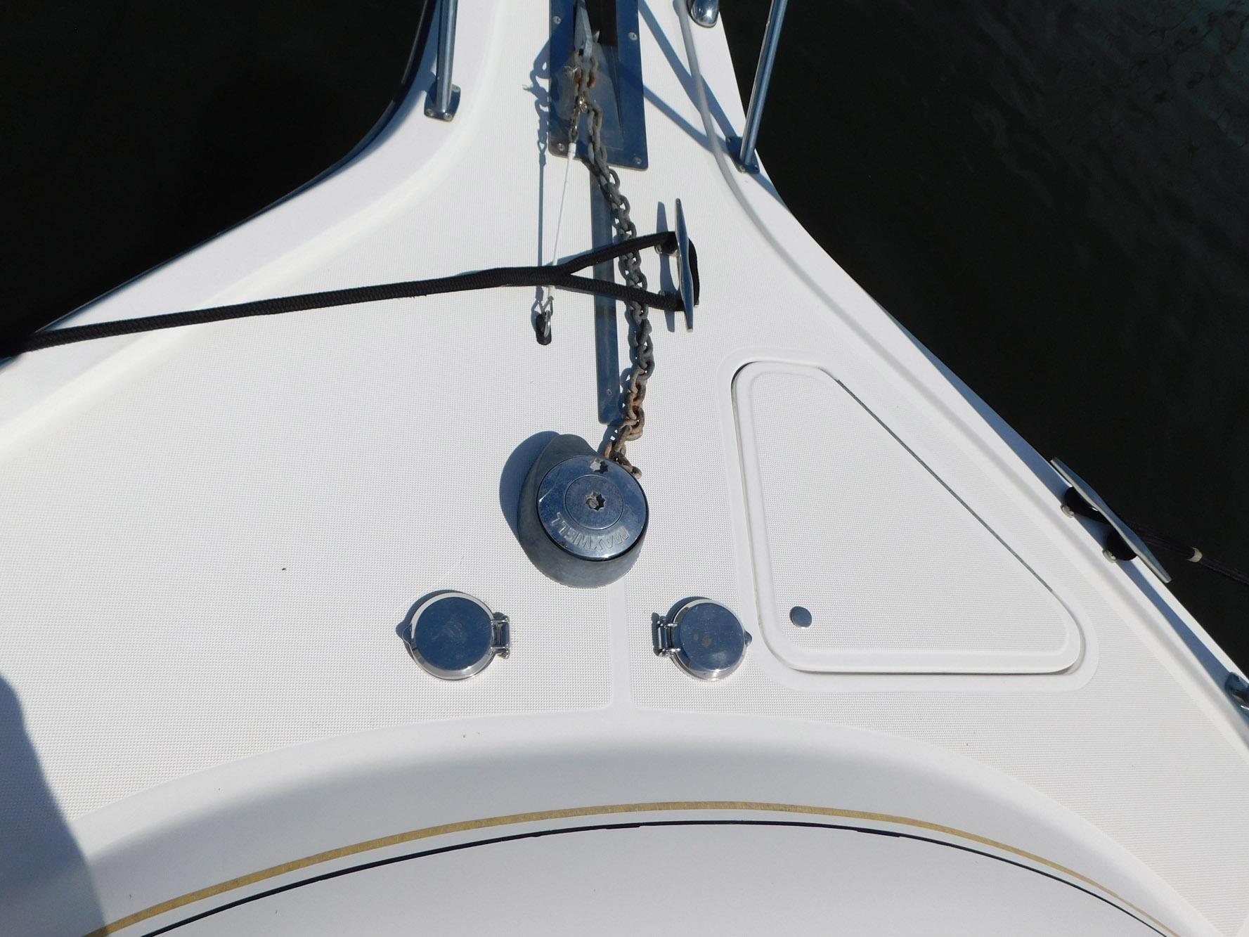 Sleeps a total of 2-4. Impressive interior space with large centerline stateroom forward, hanging lockers, drawers and reading lights. Next aft is an enclosed head with stall shower, followed by the comfortable L-Shaped settee to starboard. This seating can convert to double berth with a privacy curtain. Opposite, the large L-Galley offers stove top, refrigerator, a double stainless steel sink, hot and cold pressure water and ample counter and storage space. A large hanging locker is aft of the galley. The interior is maple with opening ports and a Teak and Holly cabin sole. Steps lead up to the pilothouse with large helm seating.