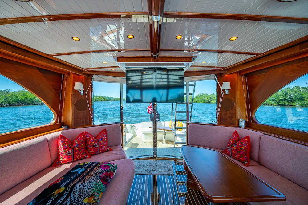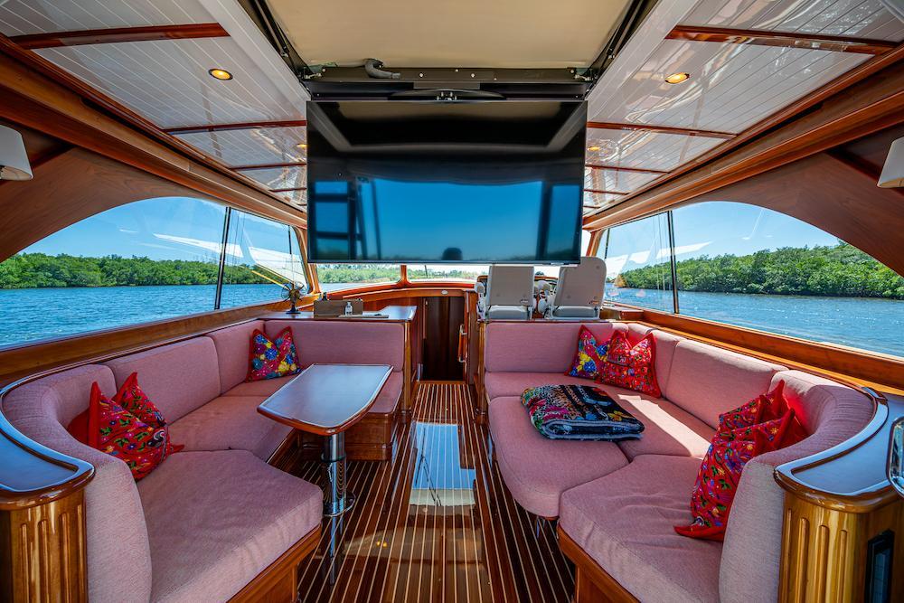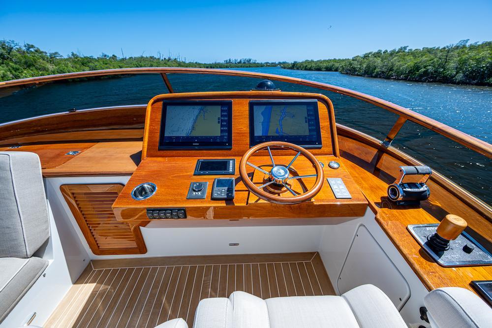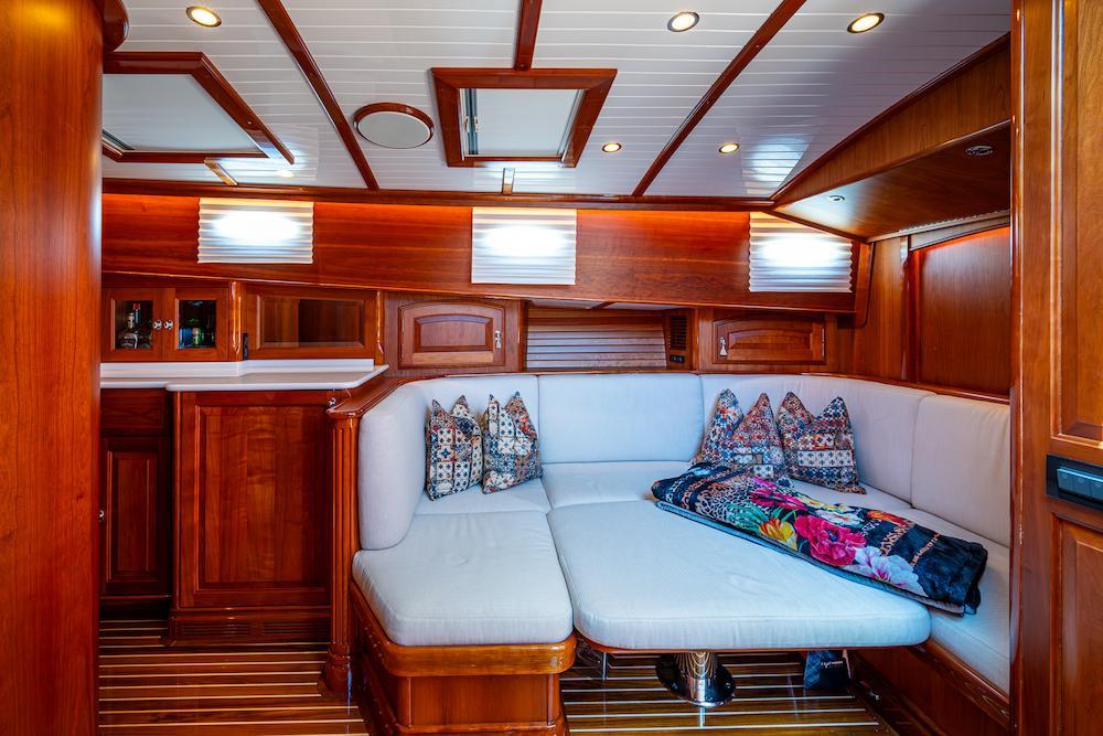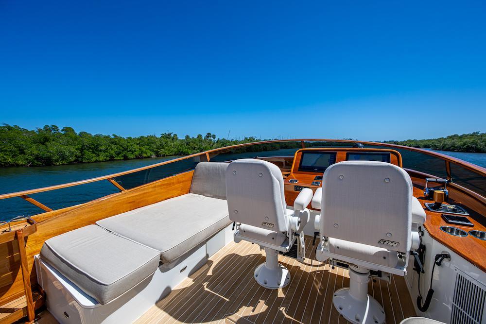Upgraded Carpentry Items1. Teak sole in cockpit (Owner’s choice of traditional black, white or grey seams). $ 18,870. 2. Double door access to galley locker from pilothouse side $ 2,260. 3. Stainless steel hand rails on exterior in lieu of varnished teak N/C 4. Stidd chairs to have powered fore and aft adjustment on companion seats 5,570. 5. FRP Hardtop and support structure in lieu of mast $ 62,755. 6. Cockpit coaming boarding door (port side), starboard side is standard. $ 6,400. 7. Pilothouse table to convert to bunk with Crown polished stainless steel manual pedestal, including filler cushion and custom tailored sheets. $ 8,250. 8. Varnished teak cap rails, dash and helm pod on Flybridge. $ 21,550. 9. Top load refrigerated ice box for Flybridge $ 7,785. 10. Teak decking on Flybridge sole. (Owner's choice of traditional black, white, or grey seams). $ 18,500.