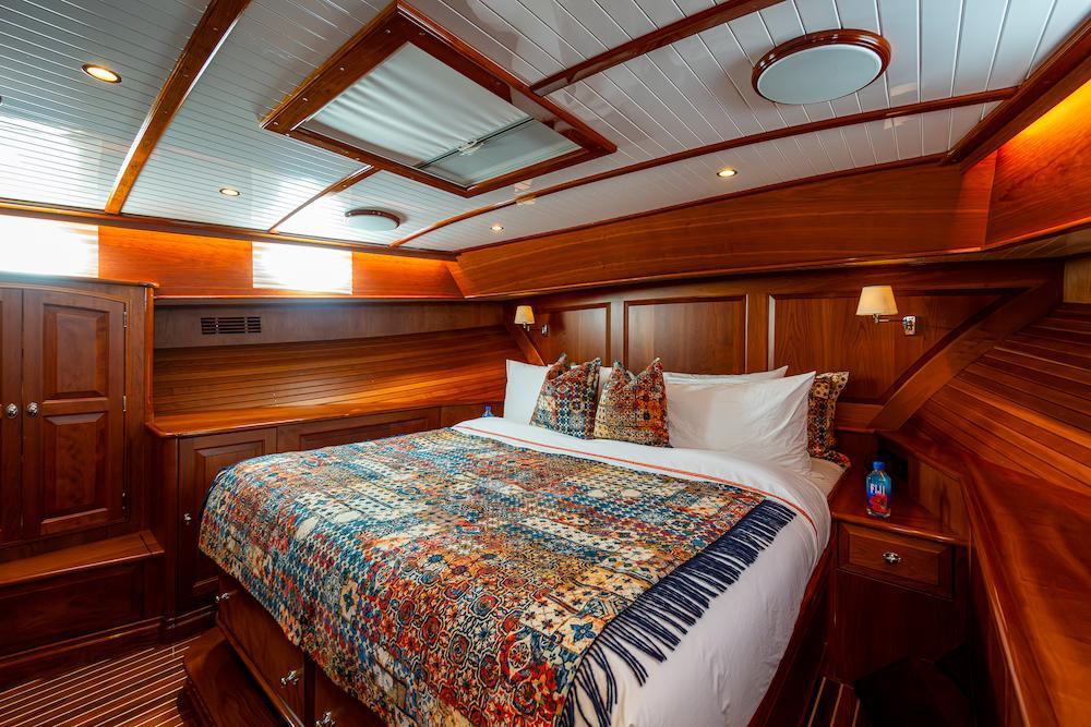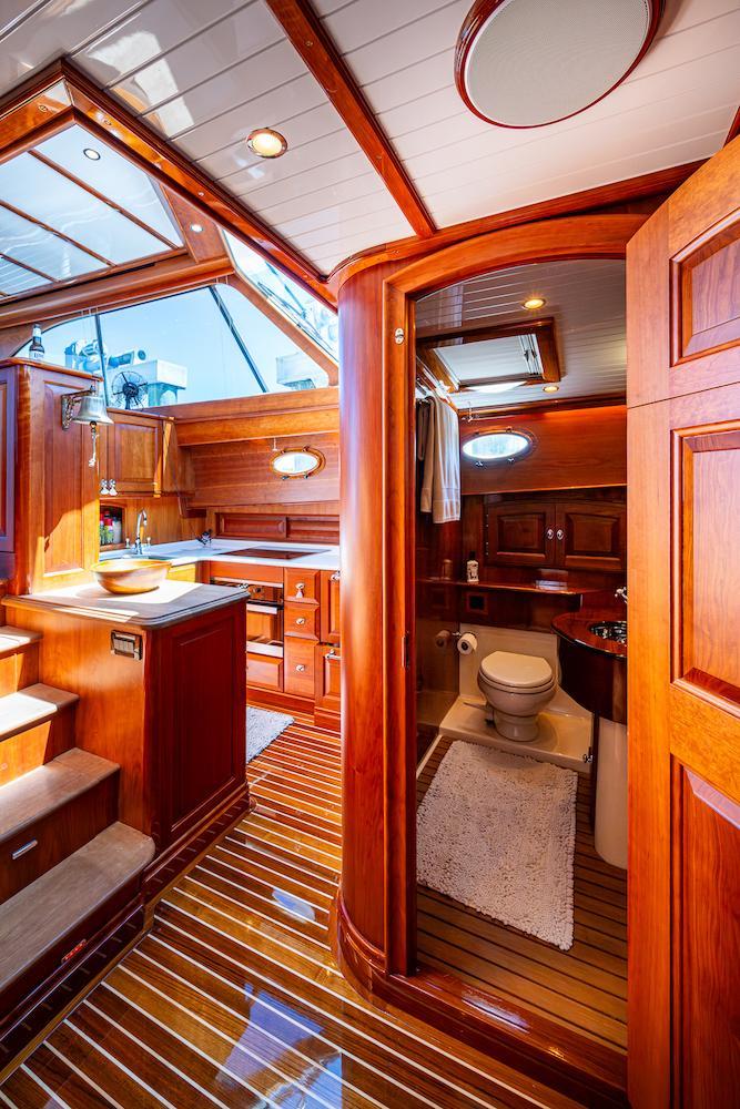InteriorInterior Finish: Satin varnished cherry bulkheads and corner posts. Cabin Sole: Gloss varnished teak and tulipwood. Cabin Sole Covers: Sunbrella® cabin sole covers. Locker Doors: Hinged cherry raised panel locker doors. Cabin Doors: Custom Hinckley cherry raised panel doors. Mirror: Full length, in owners head.