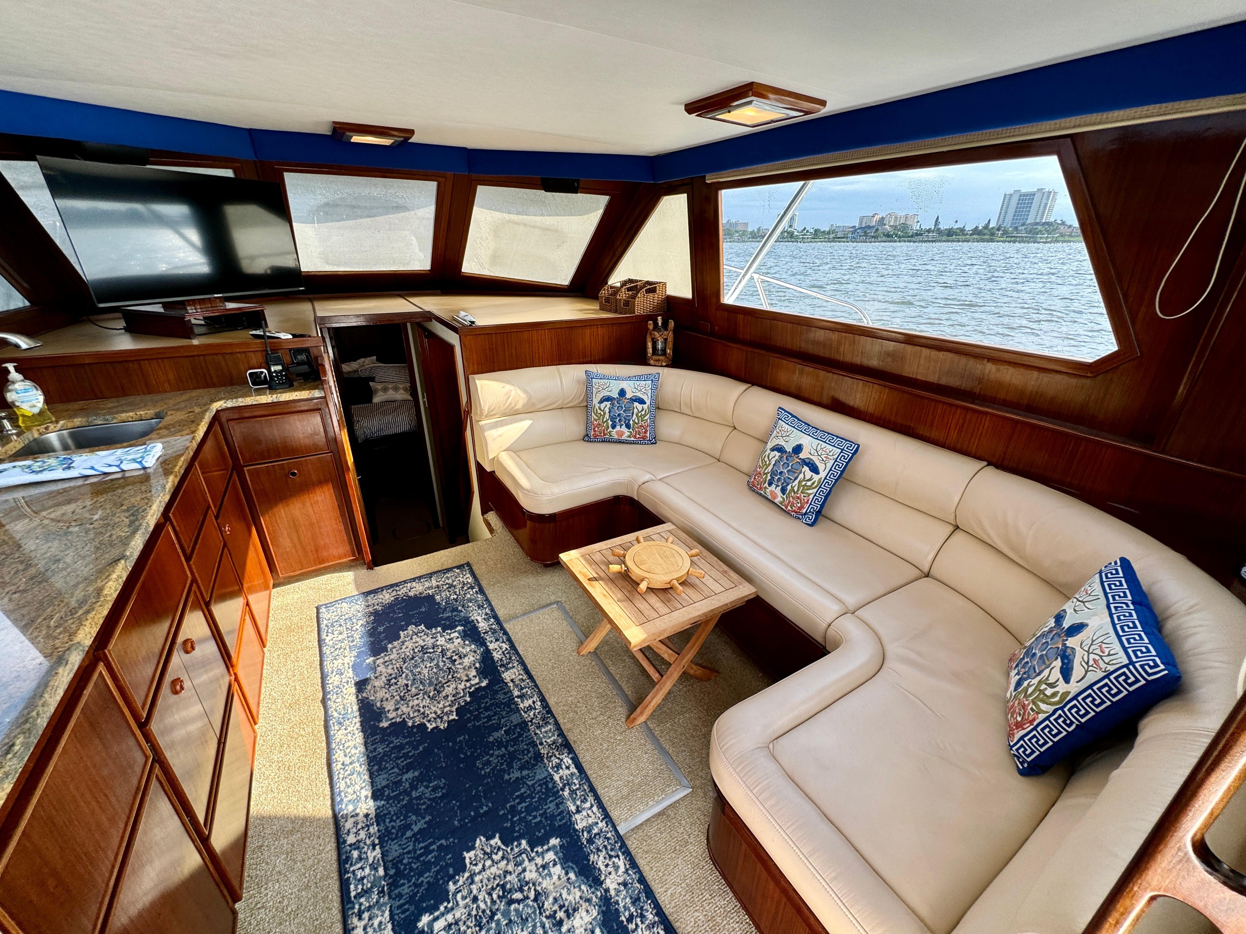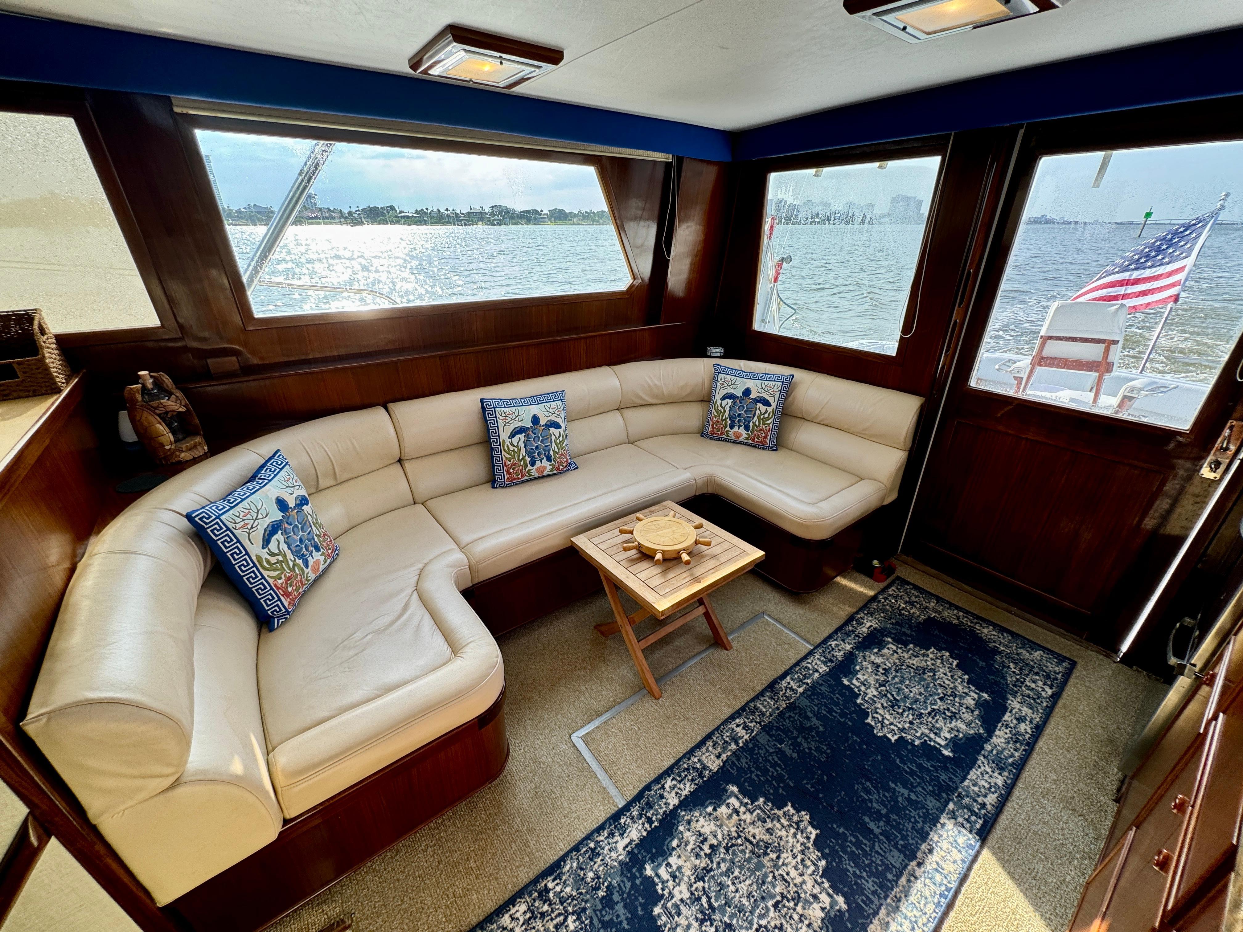 Entry through teak sliding door into a quiet, comfortable salon