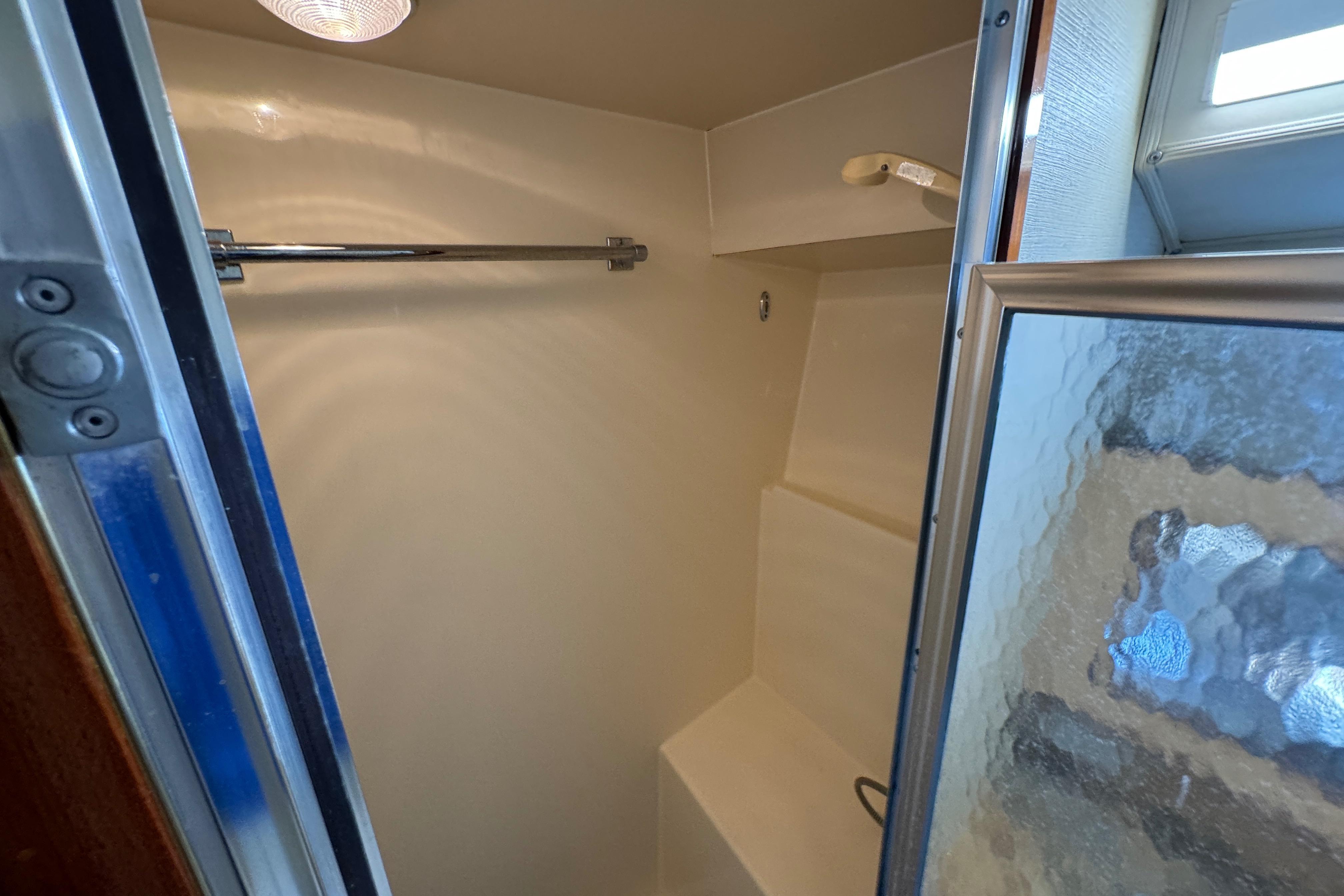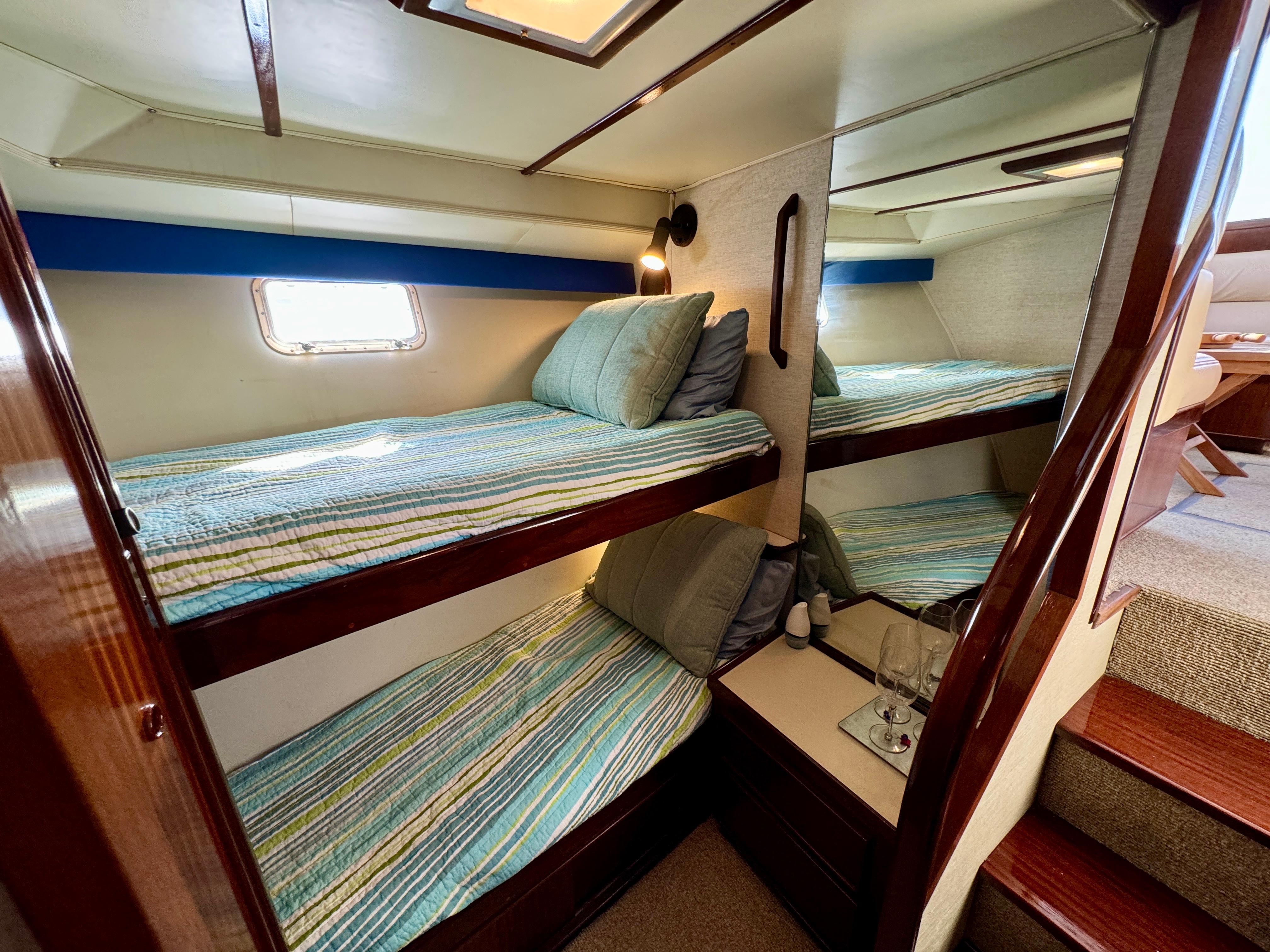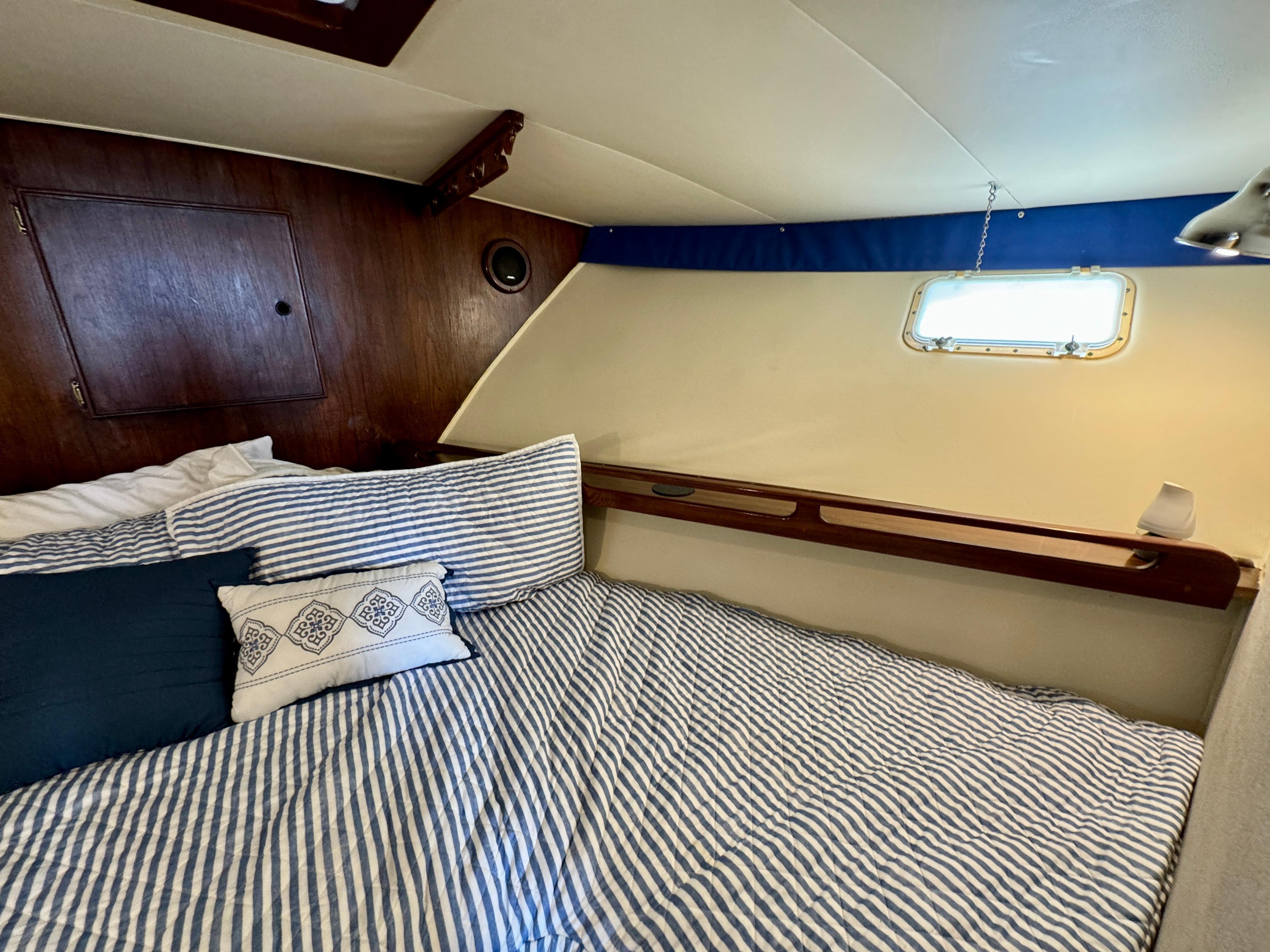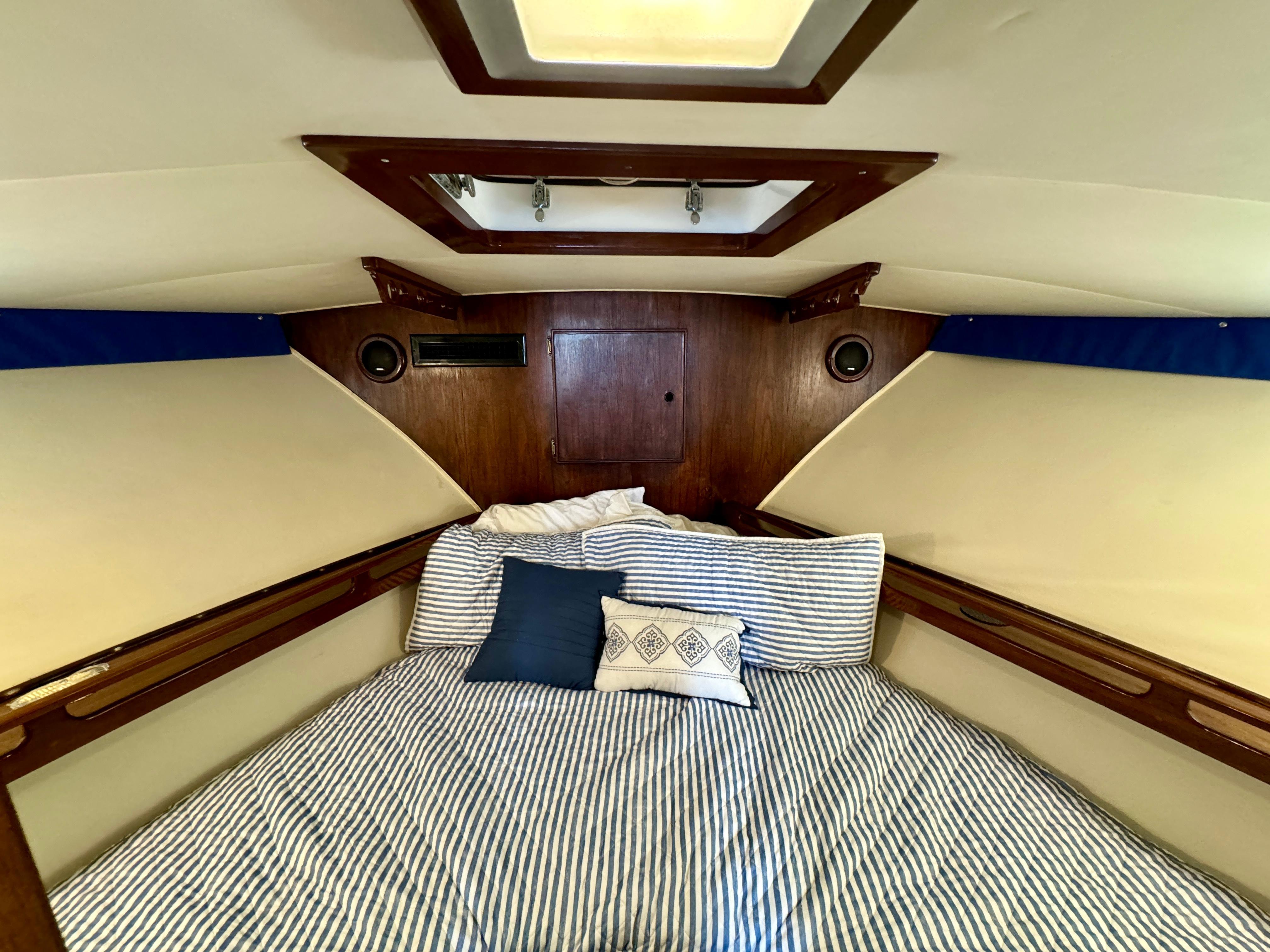 Bow V-berth stateroom: versatile sleeping setup for family/friends, hanging locker, and overhead hatch