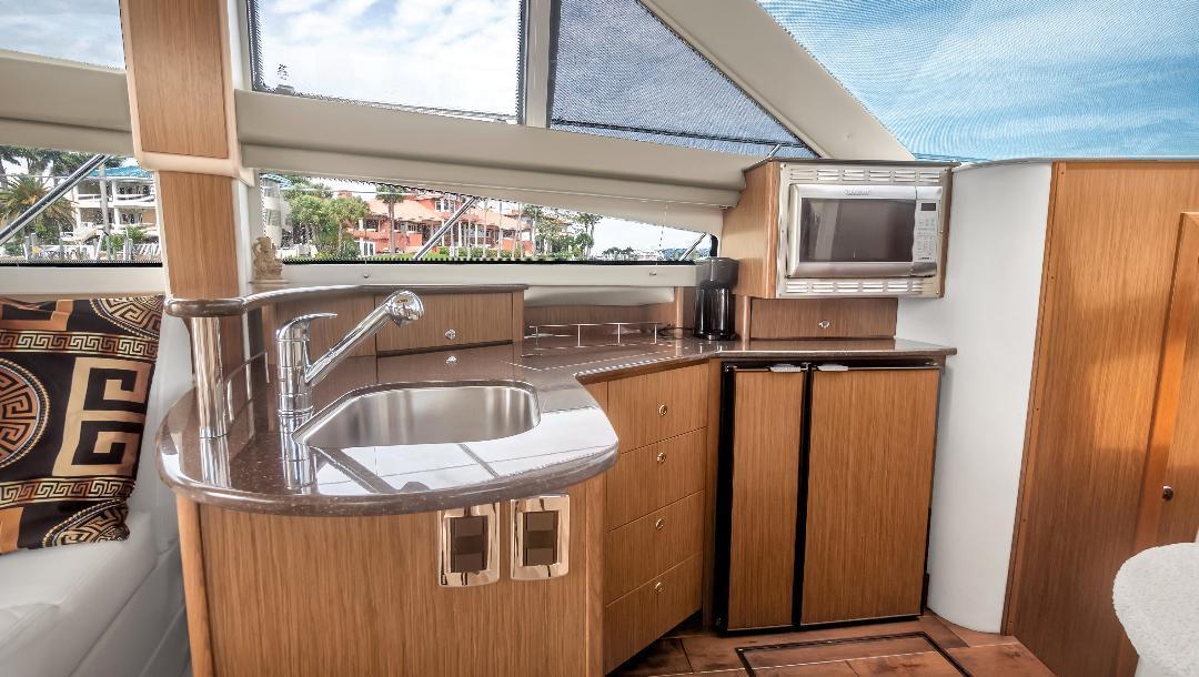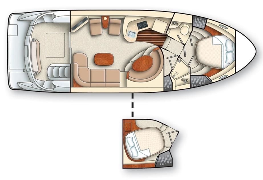 Knowing that some family cruisers look like minivans, Meridian designed its 391 Sedan to bring the styling and performance of a sportscar to the class without losing any practical features. This attractive yacht's sleek profile conceals a wide-open salon with warm cherry-wood interior, premium-gloss finish, homelike seating arrangements and 360-degree views of the horizon. She also features a dedicated dinette and fully-equipped galley that are seamlessly integrated into the main living space, two large staterooms and separate shower and head compartments, each with its own vanity and sink. The flybridge's distinctive overhang offers more space topside as well as cockpit weather protection, and its molded-in steps are hinged to provide direct engine-room access. Why settle for a floating box on the water when you can enjoy all the style, performance and comfort of the 391.