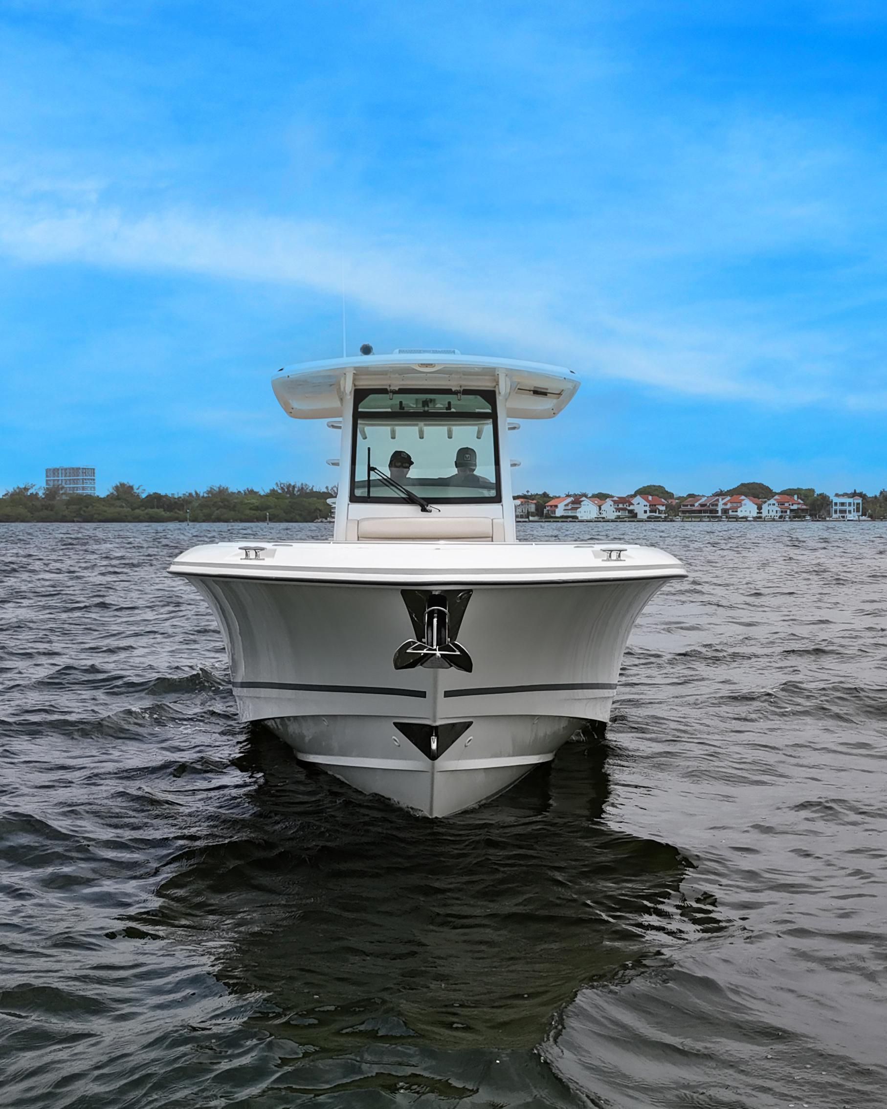 - Freshwater system (40 gallons) with sink in console, transom shower and anchor washdown