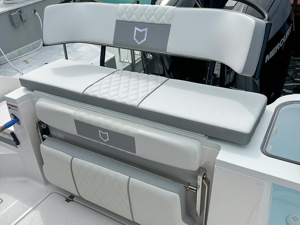 - Aft jump seat with below deck bucket storage – folds down for an easy access walkthrough transom