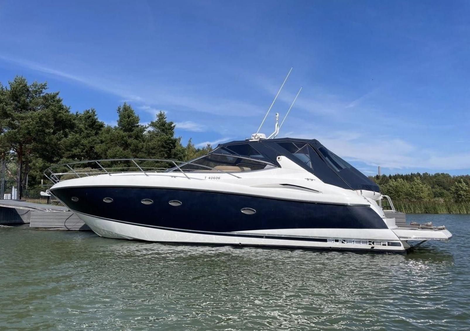 2003 Sunseeker Portofino 46 – HOTANLocation: Miami, FLLength: 46 ft | 2 Cabins | 2 Heads | ⚙️ Twin Yanmar 420 HP | ⛽ 346 gal DieselOverviewIntroducing HOTAN, a well-maintained 2003 Sunseeker Portofino 46 located in Sunny Isles Beach, Florida. With her striking profile, signature Sunseeker styling, and a 13’9” beam, HOTAN offers a surprisingly spacious layout with elegant accommodations and a massive deck ideal for entertaining, sunbathing, and coastal cruising.Powered by twin Yanmar 6LY2M STE 420 HP diesel engines with only 600 hours, she delivers solid offshore performance with a smooth ride and a cruising range of up to 200 nautical miles. Perfect for weekend getaways or day cruising, this is an exceptional opportunity to own a pedigree British yacht with timeless appeal.Vessel HighlightsTwin Yanmar 6LY2M STE 420 HP Inboard Diesel EnginesOnly 600 hours – Direct Drive2 Stateroom / 2 Head LayoutLarge Cockpit with Teak Sole, Table, Cushions, and Hydraulic GangwayFull Beam Forward SunpadGenerator & Shore PowerAir Conditioning throughoutBow Thruster for easy dockingElectronics Suite: GPS, Radar, Autopilot, VHF, Depthsounder, CompassEntertainment System: TV, CD Player, Exterior SpeakersInterior Galley with Microwave, Refrigerator, and Hot WaterStylish Interior Finishings with a classic Sunseeker feelSwim Platform & Ladder for easy water accessDimensions & PerformanceLength Overall: 46 ftBeam: 13 ft 9 inMax Draft: 3 ft 6 inBridge Clearance: 8 ft 9 inDry Weight: 32,300 lbsFuel Capacity: 346 galFresh Water Capacity: 99 galRange: ~200 miHull Shape: Modified VeeConstruction: FiberglassAccommodationsMaster Stateroom with island berthGuest Cabin with twin berthsTwo full heads with showersConvertible salon dinetteAir-conditioned interiorLuxurious wood finishes and ample storageElectronics & ElectricalGeneratorShore Power InletAutopilotGPSRadarCompassDepthsounderVHFTV & CD PlayerBattery ChargerDeck & ExteriorTeak cockpit flooringHydraulic gangwayCockpit cushions & tableSwim platform with ladderFull bow sunpadGlass windshield with wiperStainless steel handrails