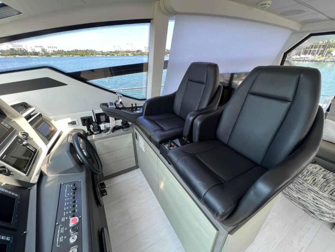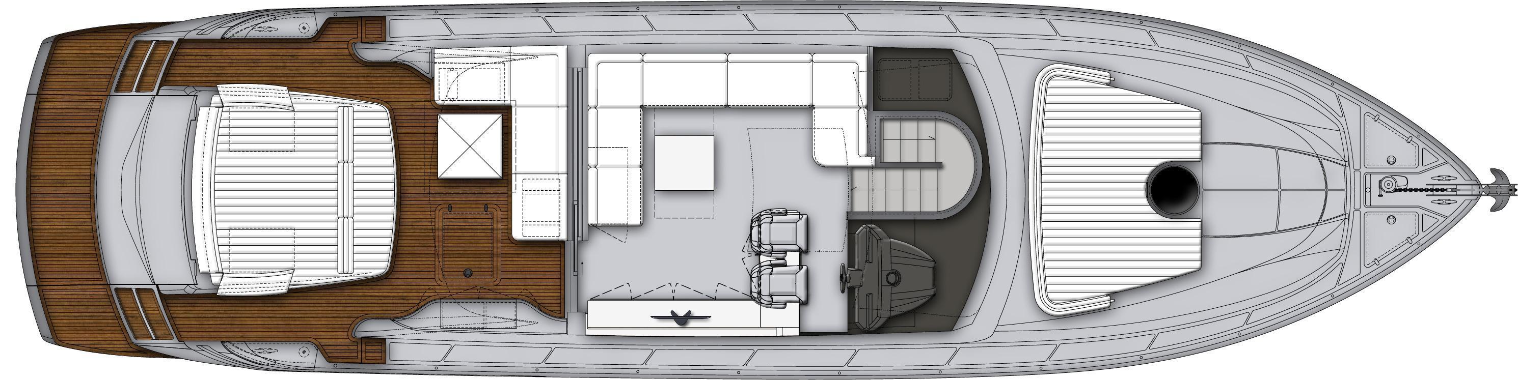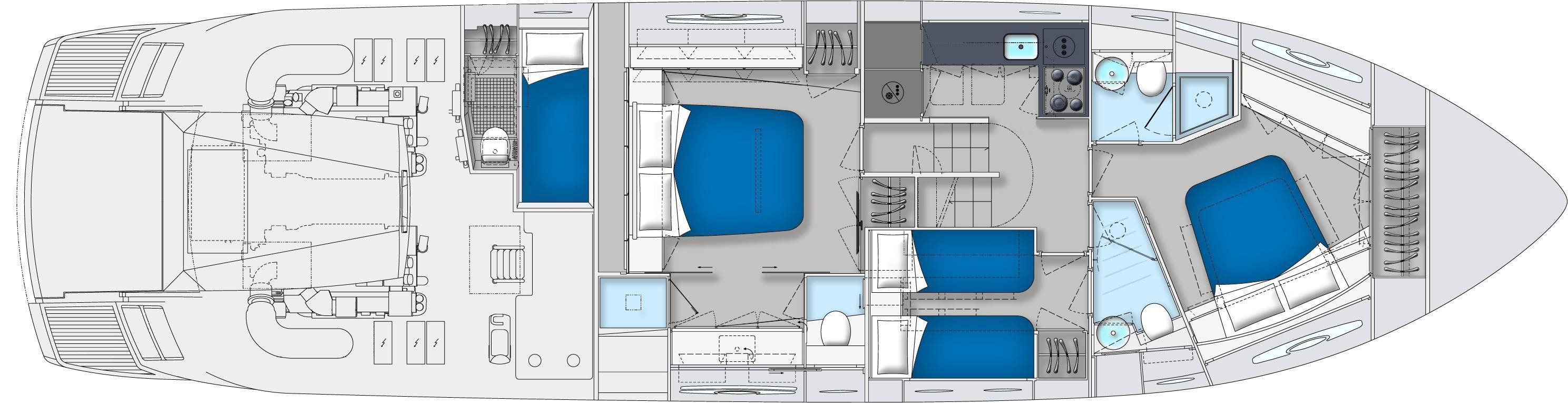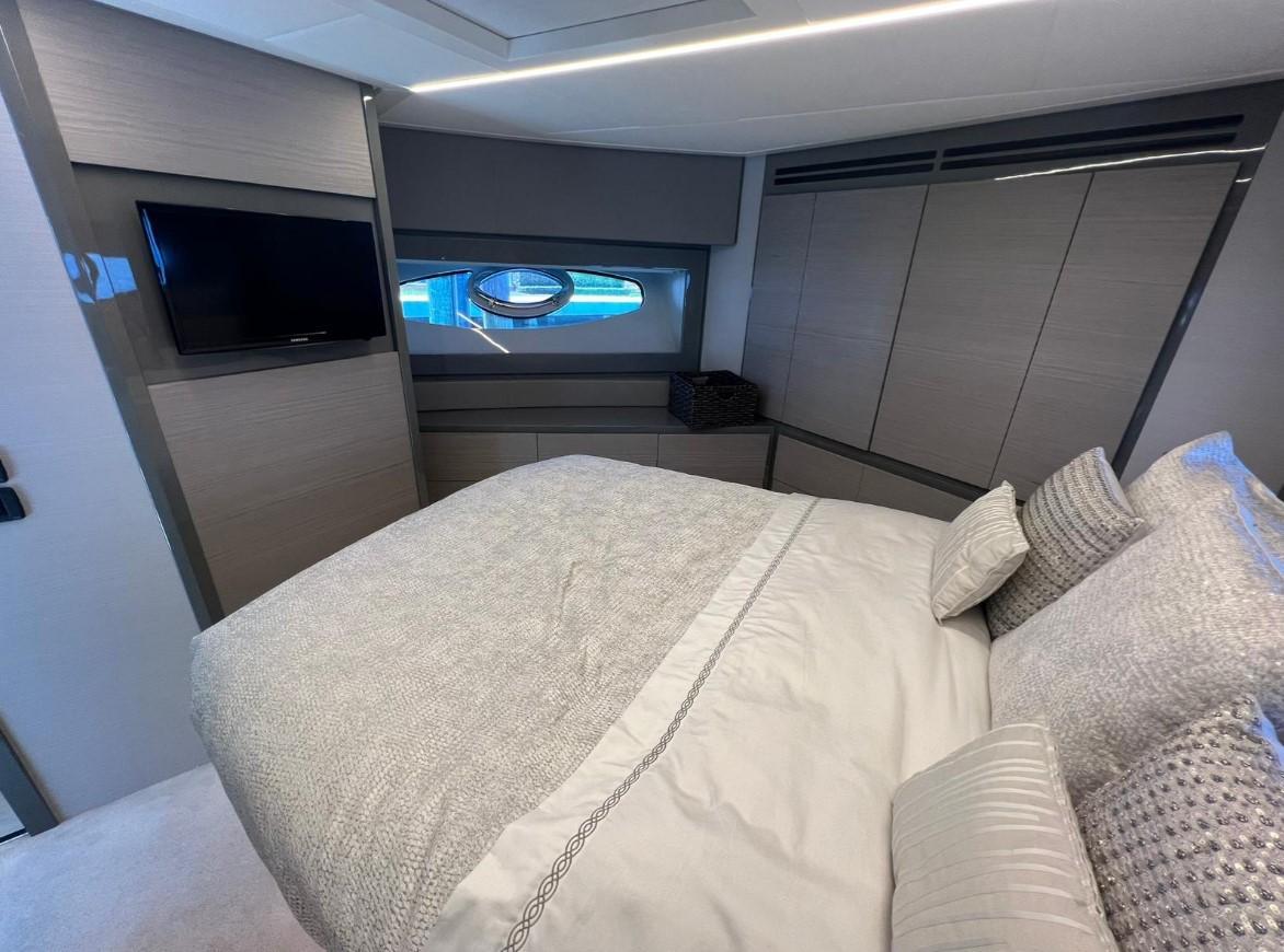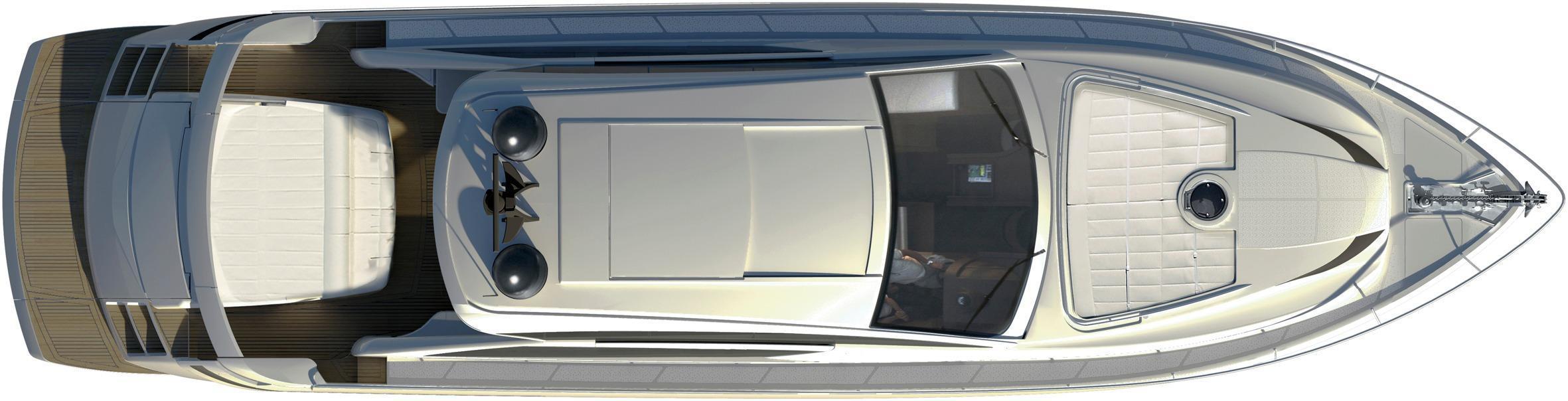 The Pershing 62 immediately grabs the attention for its sleek and slender profile: the hull line and the superstructure have indeed been designed to obtain a slim, fast yacht characterized by aggressive lines and a sporty personality, also thanks to the unique shape of the hull glazing. These windows in the hull are a typical feature in Pershing's new era, which can be found in this model too, preserving the family feeling and ensuring great brightness in the full-beam master cabin located amidships. The VIP cabin too benefits from two windows with portholes, providing plenty of natural light. The Pershing 62 is available in two versions: with three cabins and three heads with separate shower box or with two cabins - the master stateroom and the VIP cabin - while the guest cabin is replaced by a living area.