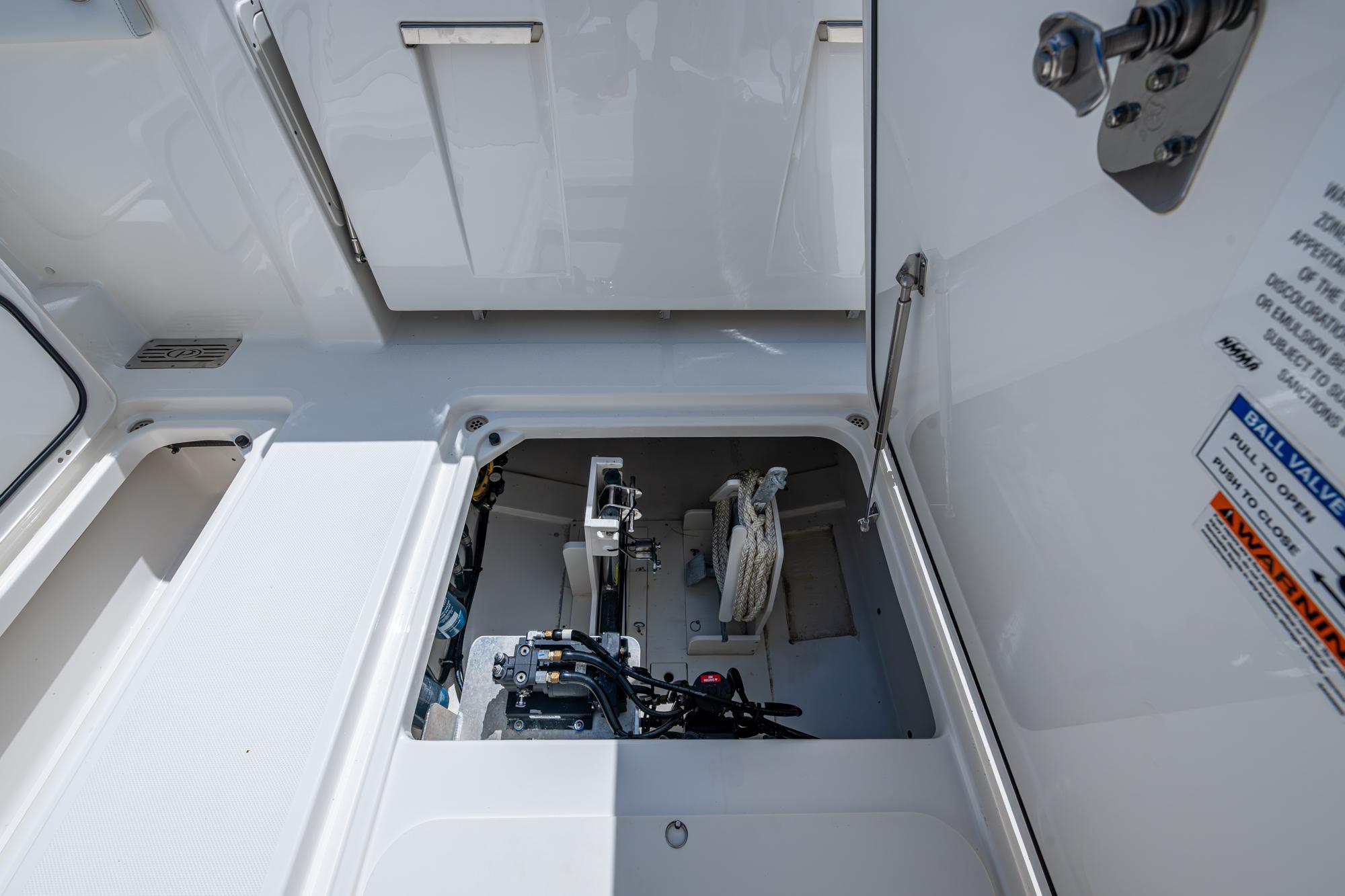 - Flush Mounted Integral Anchor Locker with Fiberglass Lid including: Horizontal Anchor Windlass with Switch at Helm and Remote at Anchor Locker with Fresh and Raw Water Washdown