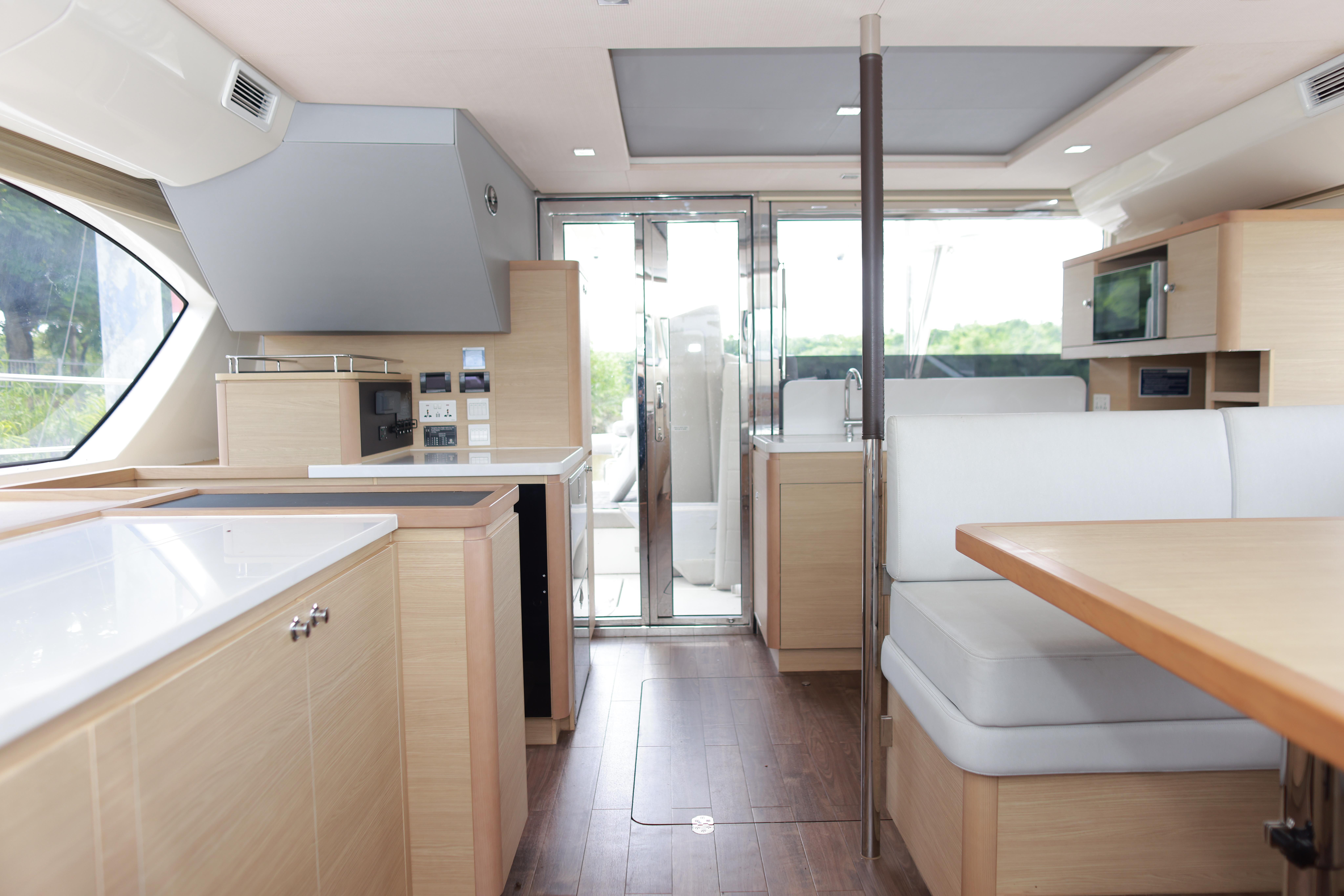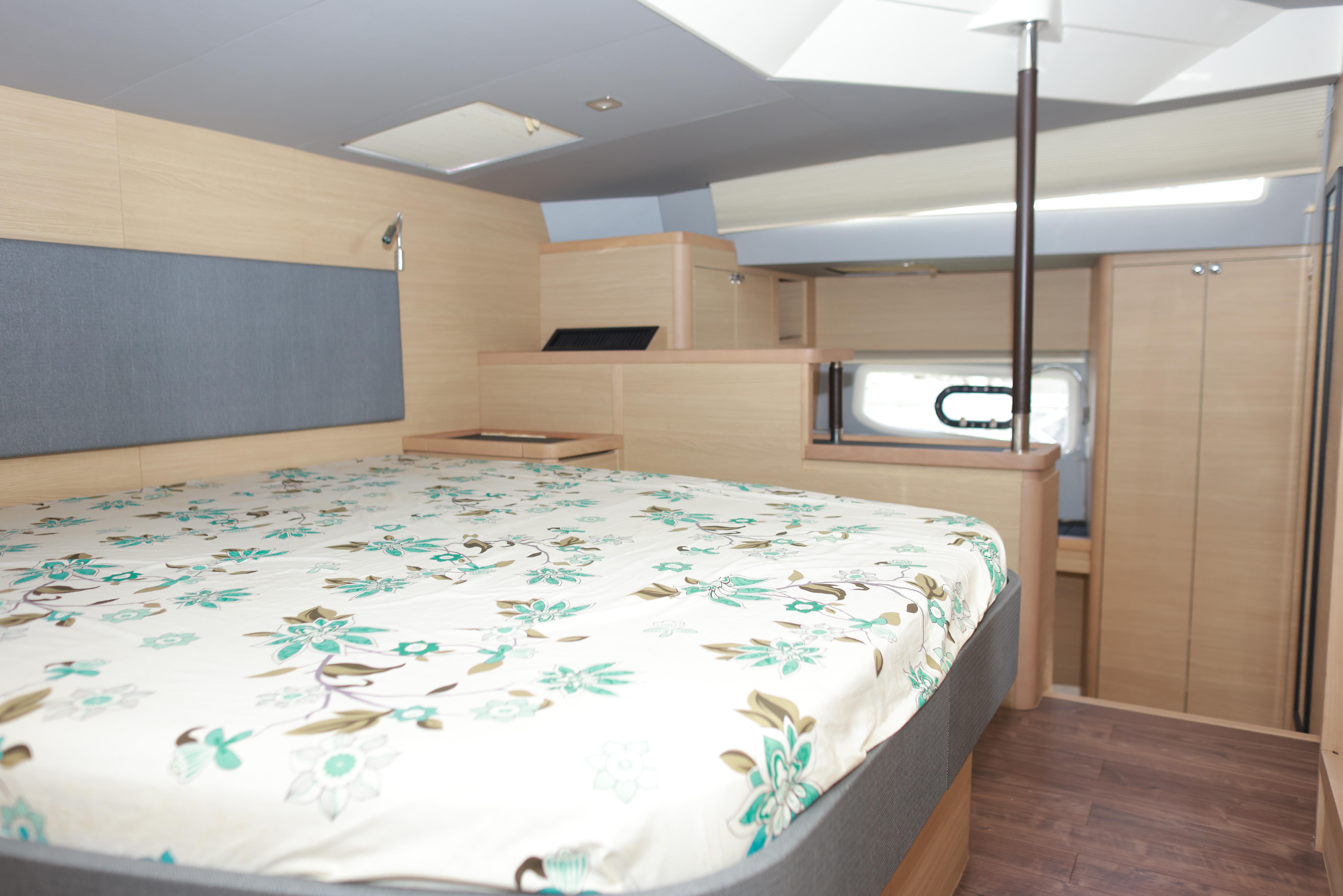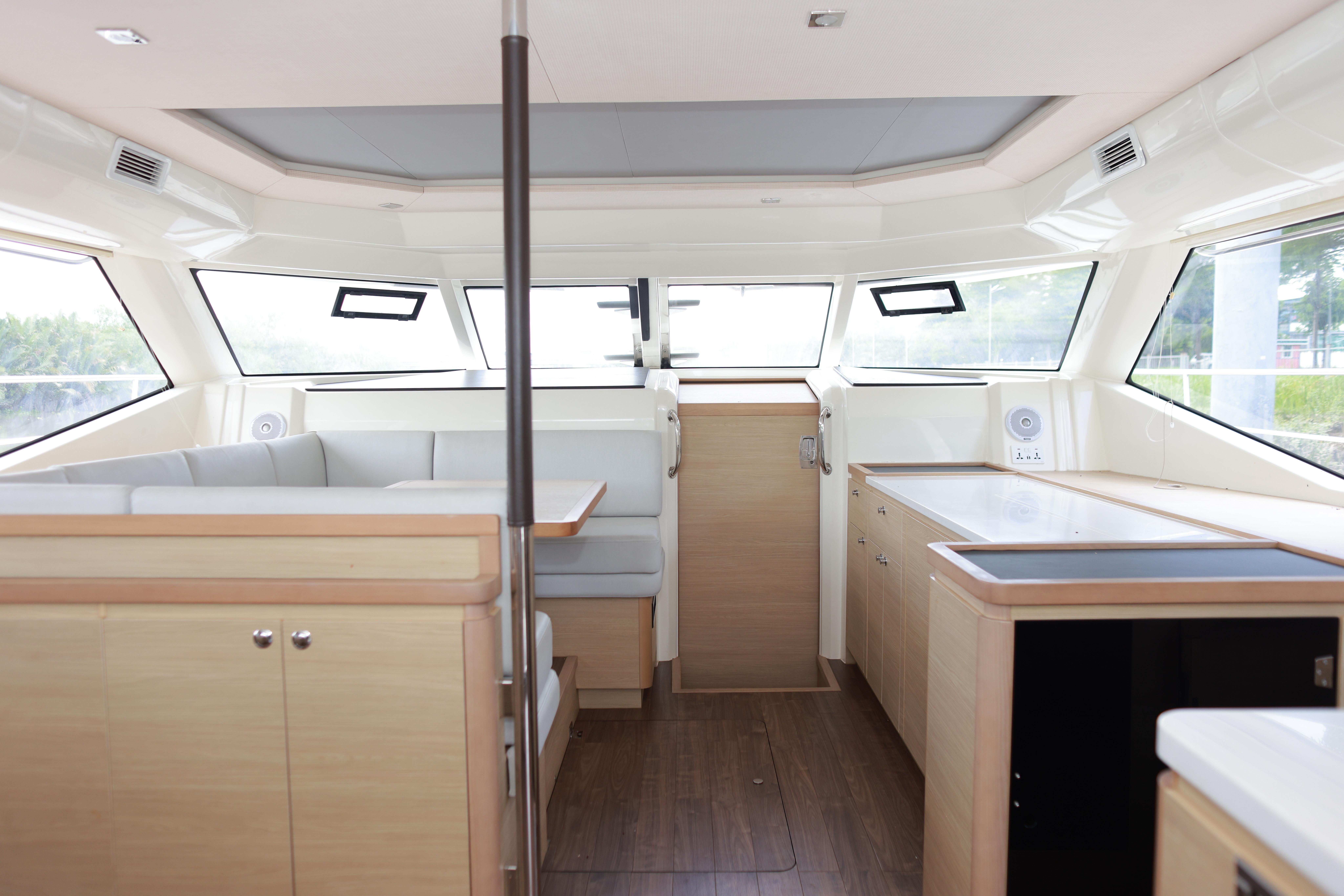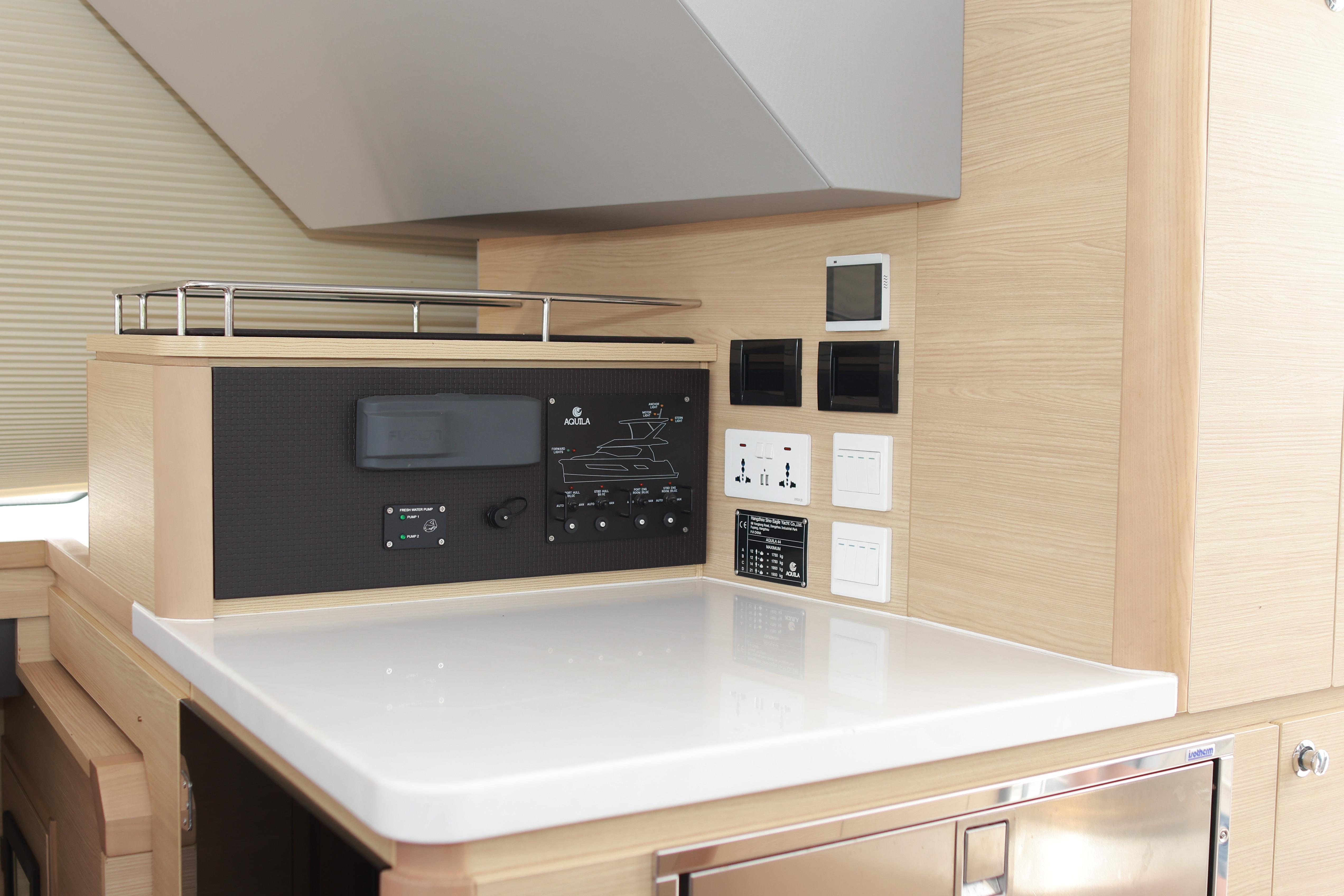 Born of innovation and experience, the luxurious Aquila 44 Yacht Power Catamaran is a world leader in its class. Designed to be both a long distance cruising yacht and a highly social platform, the highly experienced Aquila design and engineering team created the Aquila 44 Yacht to optimize performance. Two Volvo Penta diesels are situated aft behind the living compartments reducing noise and vibrations. Bulbous bows increase the waterline for greater efficiency while reducing pitching moments. Multifunction displays, digital controls, joystick operation, engine monitoring displays, thrusters, and widely spaced main engines make operating the Aquila 44 Yacht easily accomplished by a single couple.With an enormous amount of attention to detail and knowledge of how owners use their boats, both the exterior and interior spaces are perfected to serve those utilizations. The stairway from the flybridge to the foredeck gives safe easy access to the ground tackle locker and forward cleats when anchoring or docking. Wide side decks and safety handrails are another example of the Aquila 44’s commitment to owner’s and guests’ comfort and safety. Available with a 3-cabin layout featuring a salon and galley with 360° views and an extensive flybridge, the layout of the Aquila 44 Yacht makes entertaining a crowd aboard easy. Boarding from the port or starboard swim platforms, guest step up to the aft deck with an al fresco dinette. The window partition between the aft deck and the interior galley lifts and the countertop folds out to create a service bar. The galley is strategically placed between the aft deck and the salon and dinette on the main deck making it easy to serve guest inside and outside. A summer kitchen is centrally located to attend to guests in the aft mounted dinette and those on the flybridge can enjoy panoramic views along with the operator while underway.