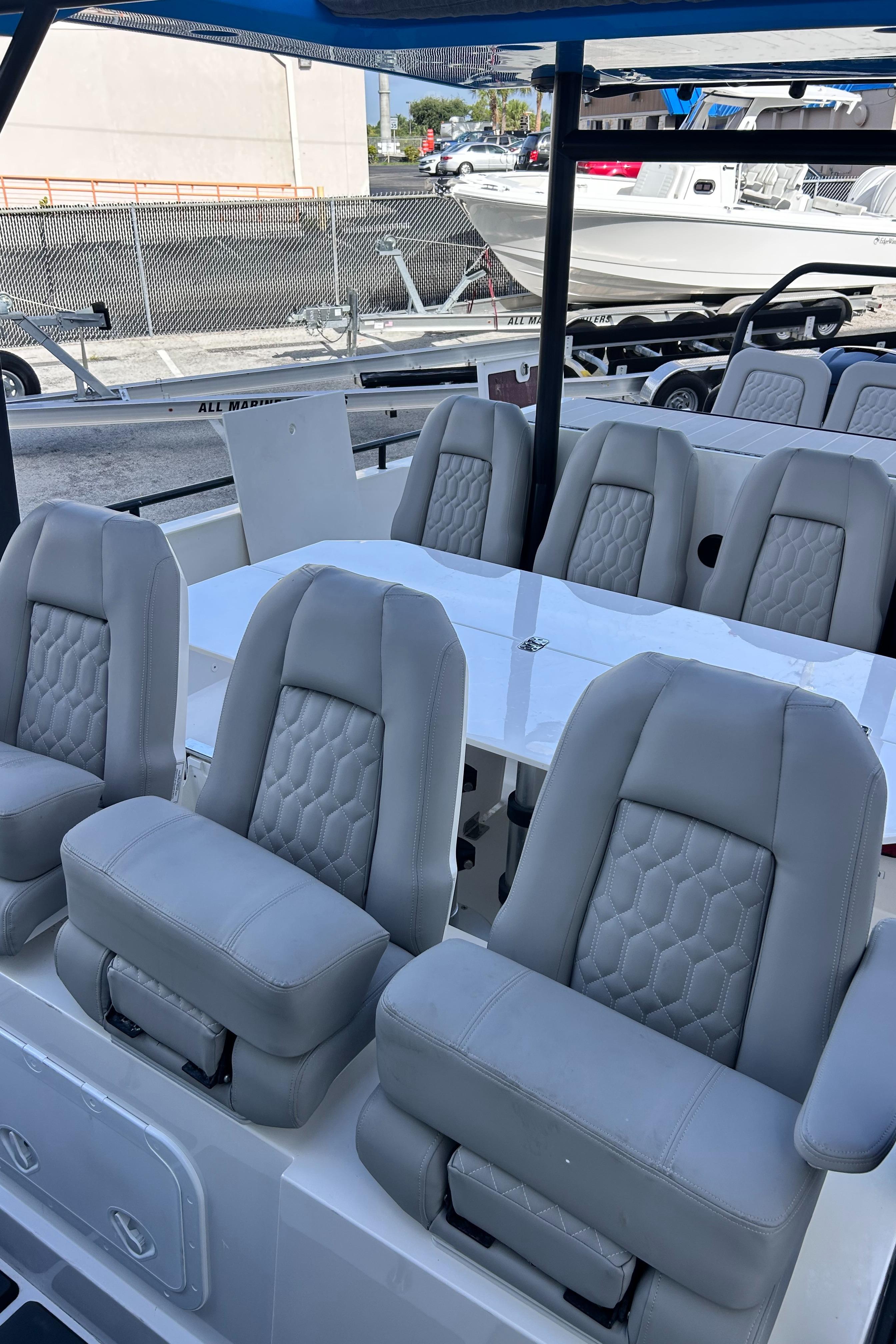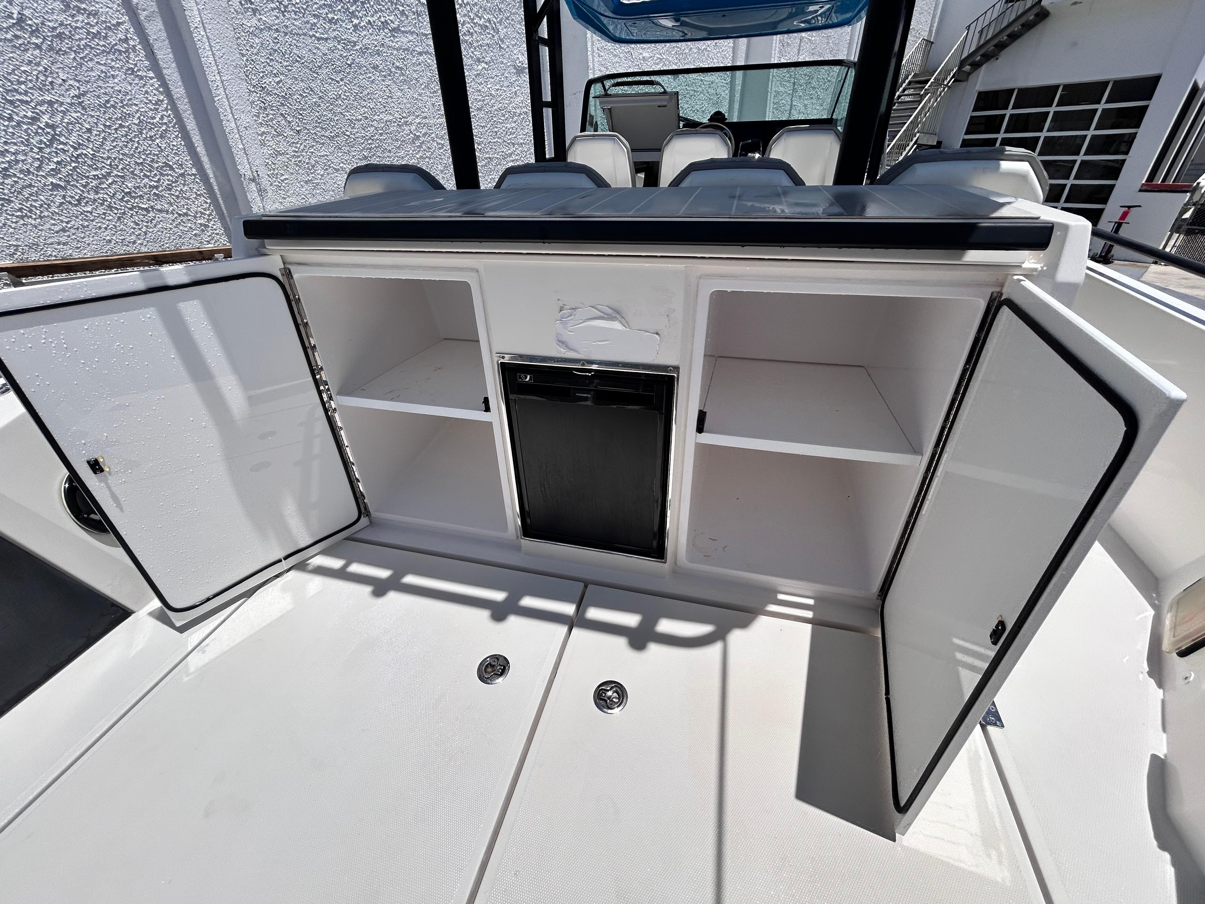 Available in Store: Palm Beach - HIN: AXOB7231G919 2019 Axopar 37 Sun TopTwin Mercury 350hpTrailer Not IncludedThis 2019 Axopar 37 Sun Top is fully loaded and powered by twin Mercury 350 HP Cold Fusion engines, including a 7" Vesselview.This vessel features the Brabus line trim package with Miami Blue hull color and the retractable Sunbrella canvas T-Top. Electronics include Garmin GPSMap 1222 Touch, Sonar Module Garmin with DownVu/SideVu, the Garmin VHF300i, and the upgraded Fusion Audio unit. Other notable features include 120V shore power, and bow thrusters.Exterior features include the bow lounge, a wet bar, a targa arch, a waterski pole, two cockpit refrigerators, underwater lights, starboard aft livewell, side rails, cockpit speakers, a windscreen, windscreen wipers, a cockpit shower, a swim platform, swim ladder, port aft fender storage, an anchor and anchor locker, a cockpit table, and a gray rub rail.Seating includes a bow sun pad with additional bow cushions and a bow table, three seats at the helm with swivel function, four seats aft of the helm, and three transom seats, all in Silvertex Sterling. The helm seats swivel to face aft, creating a dinette area. The cockpit table can then lower to accommodate a filler cushion and create a berth for two, or fold to be out of the way. The bow lounge features a removable table for another dining and entertaining area.The forward cabin entryway is located at the helm. The cabin features a V-berth to accommodate two, a berth curtain, a bench seat, a sink with a cabinet, storage cabinets, courtesy lights, wood floor, blinds, and a toilet that is hidden by a folding cushion to create a bench seat.Canvas includes foredeck covers, a wet bar cover, transom seat covers, and a forward sun shade with stainless steel poles,