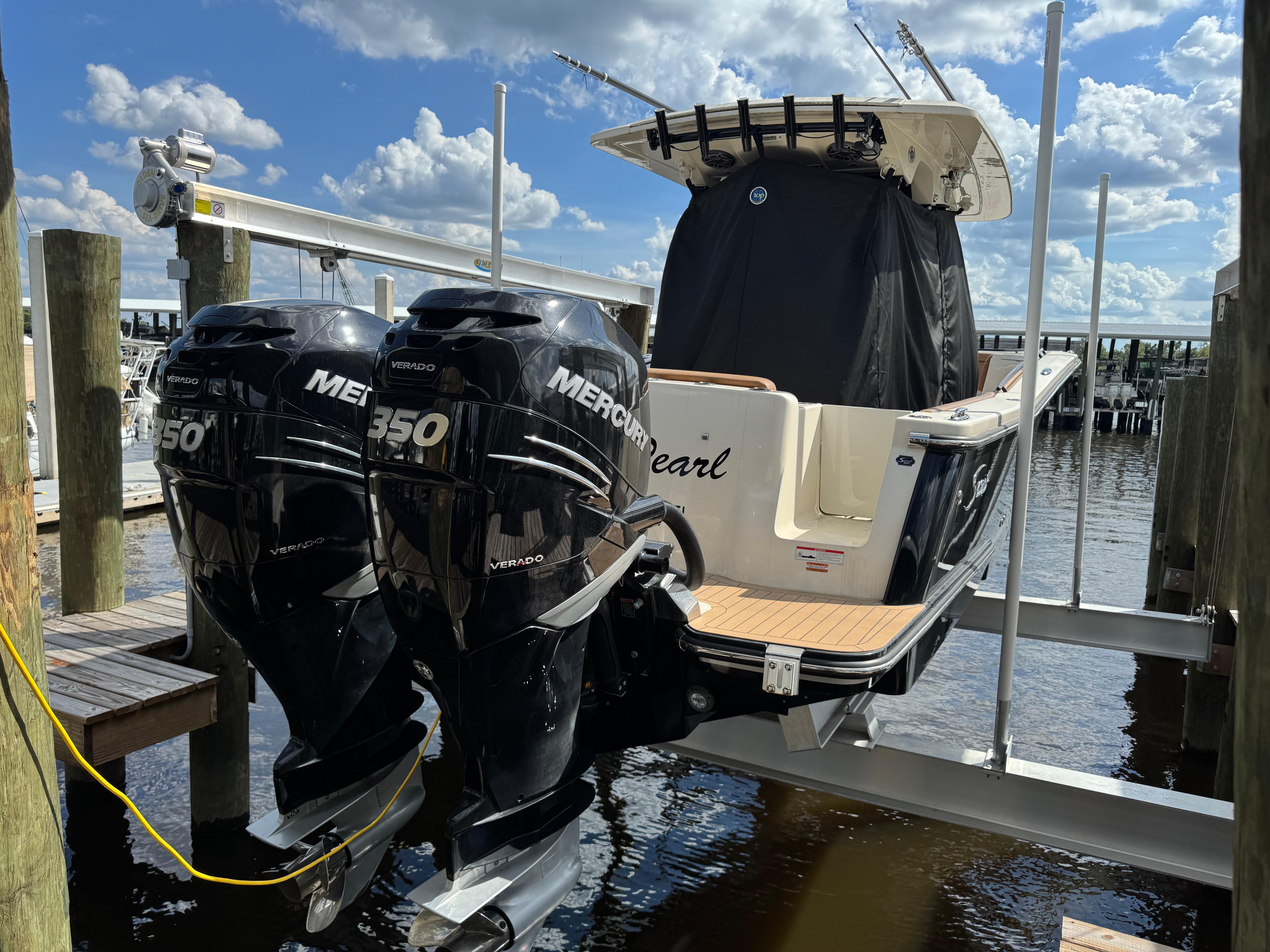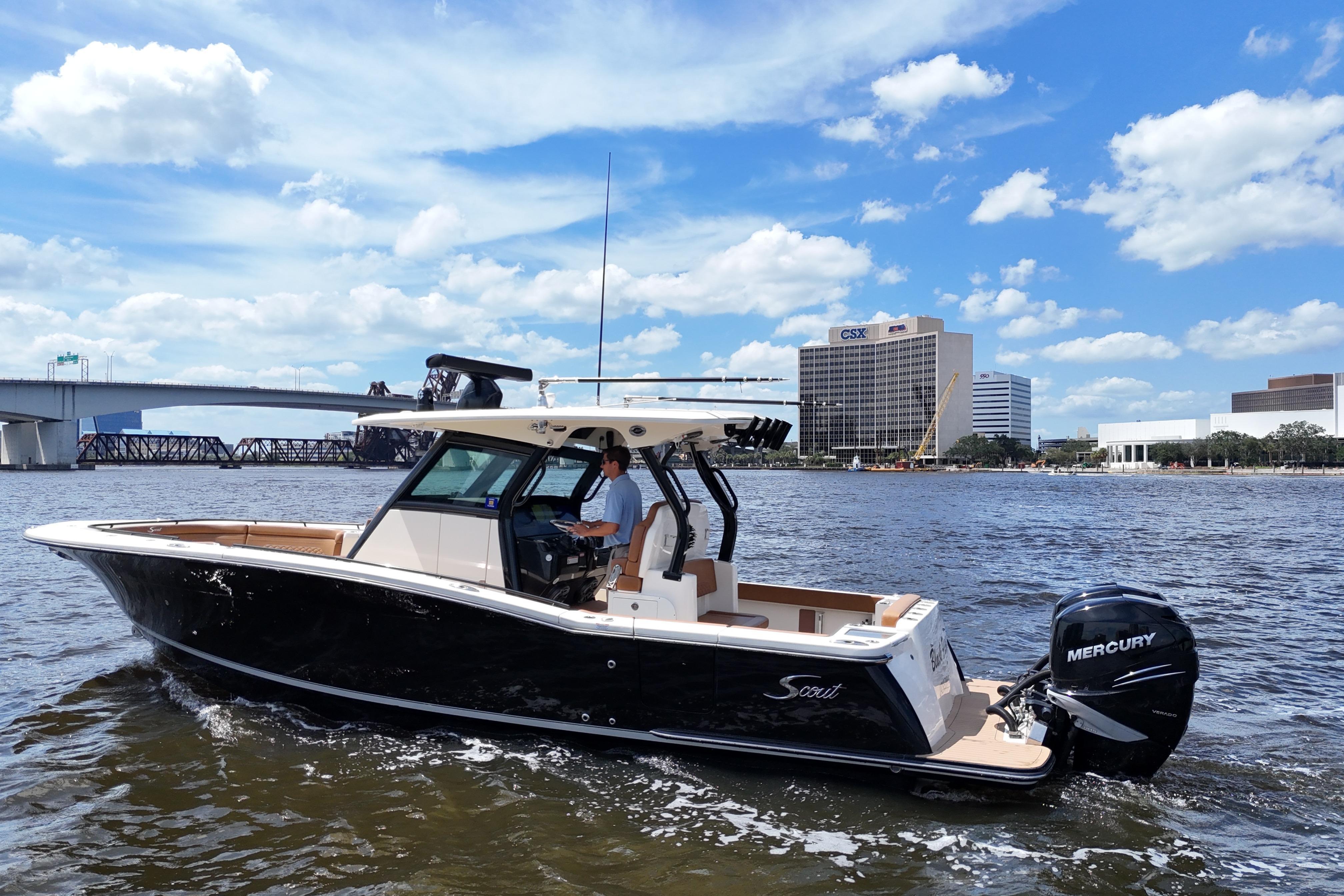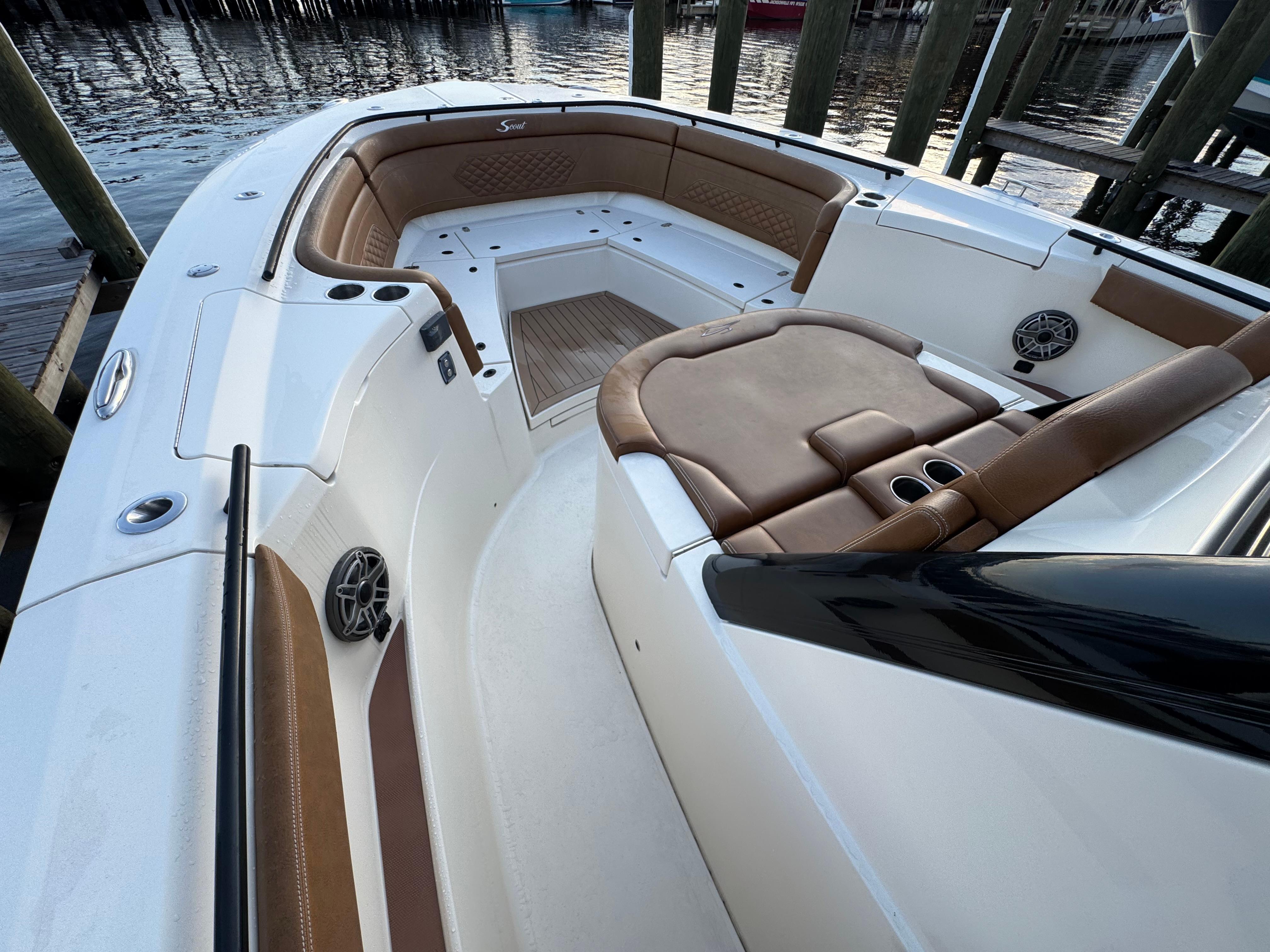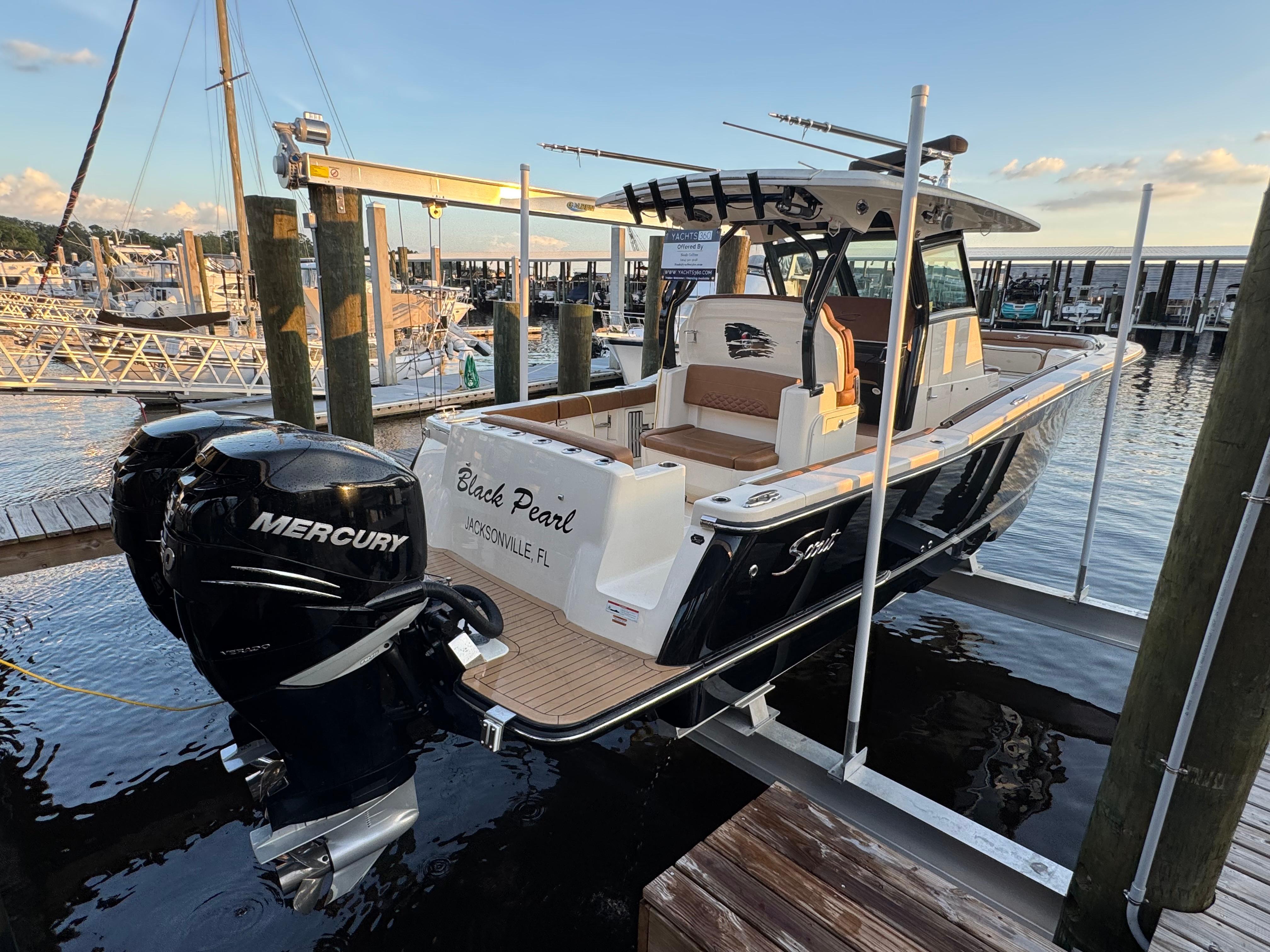 ALL TRADES WELCOME!!!! -The 330 LXF " Black Pearl" is the perfect meld of superior craftsmanship and ingenuity. Smartly-designed and ready for entertaining, cruising, or fishing. Ample storage throughout, plush seating options, and an inner console berth below with an electric marine head and overhead lighting.-The Scout 330 LXF proved more luxurious than other center-consoles. Amenities like twin high-back helm seats, posh forward loungers, a retractable bow dining table and a lounger on the forward console can spoil the saltiest of mariners.-There’s also Scout’s reputation for style reflected in a sweeping sheer line, Carolina-style bow flare and tumblehome of the stern quarters. Twin Mercury Verado 350 outboards vault the 330 LXF to plane in 5 seconds and top speed of over 60 mph. boat equipped with Joystick and Garmin Auto Pilot. Deluxe JL Audio Stereo. Sea-dek flooring through-out. -The 330 LXF handles with precision, and the hull rides silky smooth through wind-swept seas. The double-stepped hull lifts with little bow rise during hole shot. It maintained a near-level trim angle while underway. Advanced epoxy-infusion construction results in optimized weight and strength, and delivers a solid feel. Added Seakeeper 2 and a number of electronics upgrades like Garmin Marine Open Array Radar and FLIR camera both custom painted (Black) to match black powder coating on hardtop.Standard EquipmentDual Swims w/ Center Walk-Thru & EsthecOptimus EPS SteeringAmrstrong Dive Swim LadderTransom Door10” Pull-Up Stern/Bow Cleats(2) Spring Line 8” Cleats(10) SS Flush Mount Gunnel Rod Holders(2) Horizontal Under Gunnel Rod StorageAft Under Deck Systems Station w/ Storage50 Amp Battery Charger w/ Deck PlugPort Transom BaitwellPort & Stbd Aft Floor FishboxesRaw/Fresh Water Washdown w/ 22 Gallon TankLeaning Post w/ 3 Tackle Drawers Port Side, Trash Unit Stbd Side, 65 Quart YETI Slide-Out Aft Cooler, Sink Port Side Countertop, Cutting Board Starboard Side Countertop, Fiberglass Cooler Box Countertop and Twin Bucket Helm Seats w/ Armrest BoxHelmFusion Bluetooth Stereo System w/ (10) JL 7.7” SpeakersPowder Coated Patented T-Top Hardtop w/ Full Windshield, (6) Rocket Launchers & LED Rope LightingCompassCourtesy & Navigation LightsUnder Gunnel LED Rope LightingMolded-In Fwd & Aft Spreader LightsDigital SwitchingSeakeeper 2Solar Panel Charging System (Mounted flush mount on hardtop)Zipwake Trim TabsOpen Array Garmin Marine RadarFLIR Night vision cameraInner Console BerthElectric Marine Head w/ 12 Gallon Holding Tank w/ Overboard Discharge & Dockside Pump OutOverhead LightsHull, Deck and CockpitStbd Console Storage Closet for Brush, Gaff, Lines, etc360 Degree Bolster CushionsRecessed Stainless Steel Coaming RailForward Console Storage BoxBow Glovebox StorageFwd Bow Seating w/ Underside StorageLewmar Windlass, Anchor, Chain & Rode w/ Bow Foot Controls & Helm ControlsHide Away Transom SeatGarmin 8612 DisplayPatented Anchor Camera in BowPort Side Swing-In DoorZipwake Interceptor System(5) Lumitec (multi-color) LED Underwater Lights
