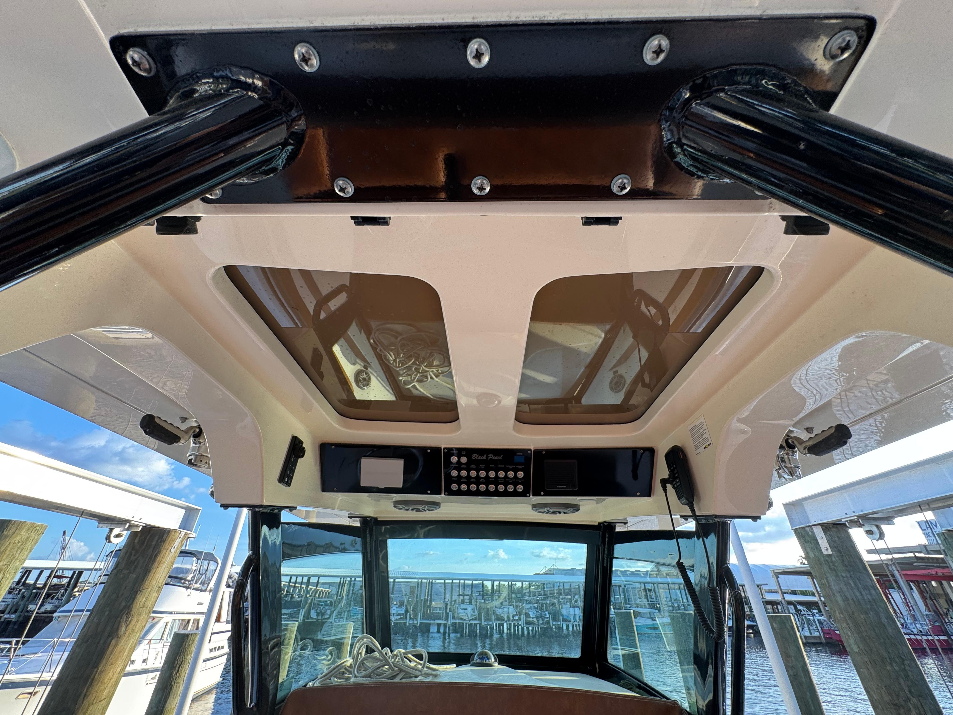 - Leaning Post w/ 3 Tackle Drawers Port Side, Trash Unit Stbd Side, 65 Quart YETI Slide-Out Aft Cooler, Sink Port Side Countertop, Cutting Board Starboard Side Countertop, Fiberglass Cooler Box Countertop and Twin Bucket Helm Seats w/ Armrest Box