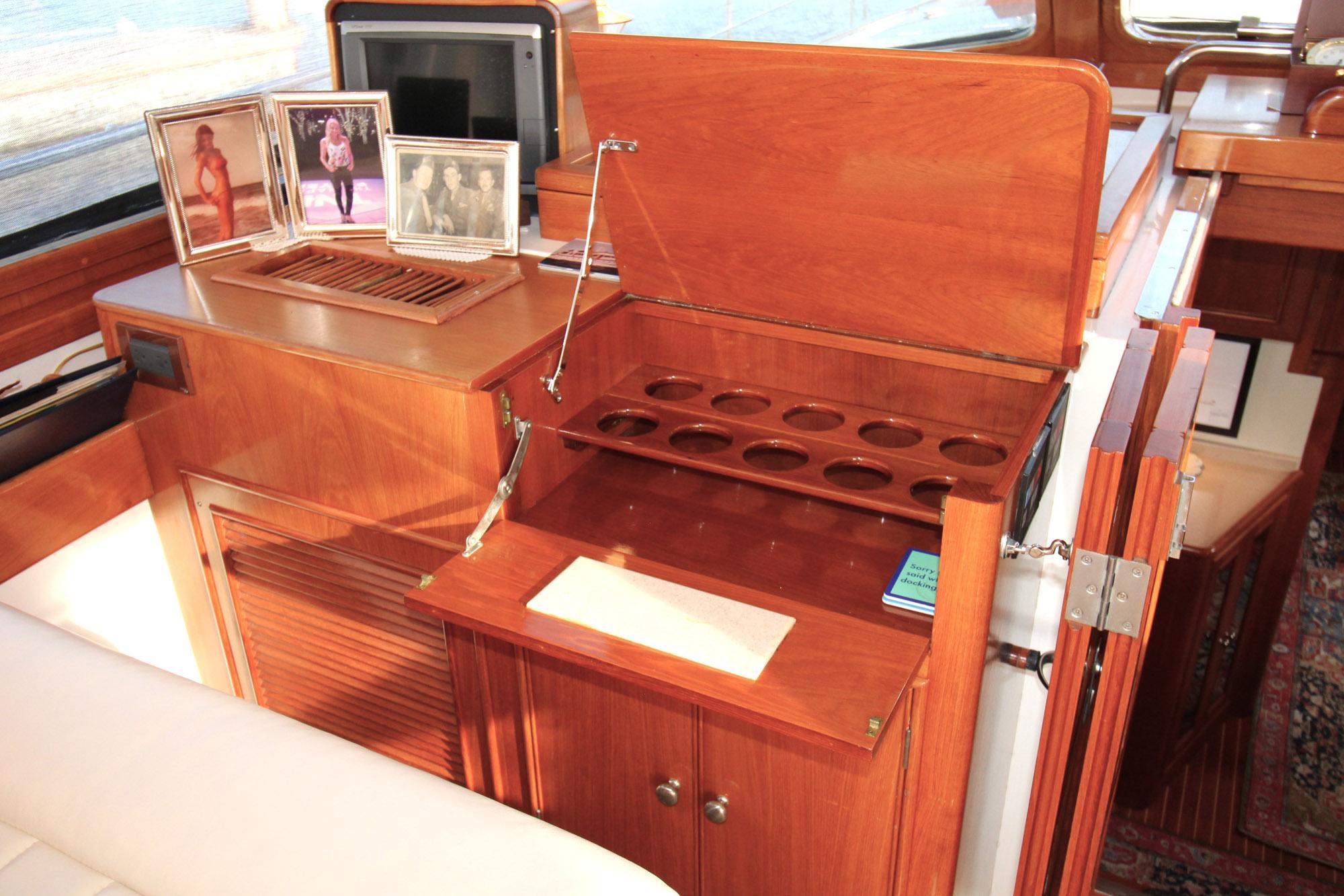 Three wide steps on starboard lead to the fully air-conditioned aft salon and helm area. Next going forward there is an “L” shaped dinette on port and bench seat on starboard. Helm station on starboard has a bench seat with room for two, dual Garmin MFD screens and more great electronics (details to follow). On port is an outstanding navigator station with a bench seat for two, a hidden bar area, several storage cabinets, and its’ own Garmin MFD display.
