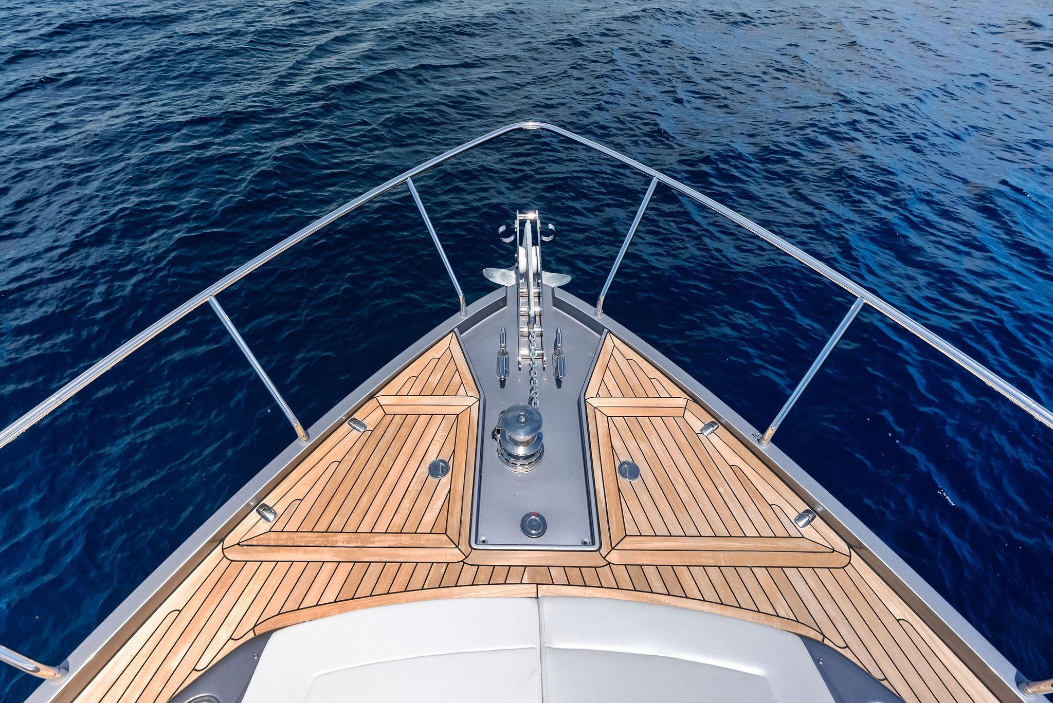 Access to bow locker with double hatch and closure (2) • Chain basket Bow anchor fitting • Courtesy LED lights • Electric windlass 2300W with waterproof control pad • Galvanized anchor with joint (1 x 30kg) • Galvanized chain 75m 10mm • Stainless steel mooring cleat bow (2)