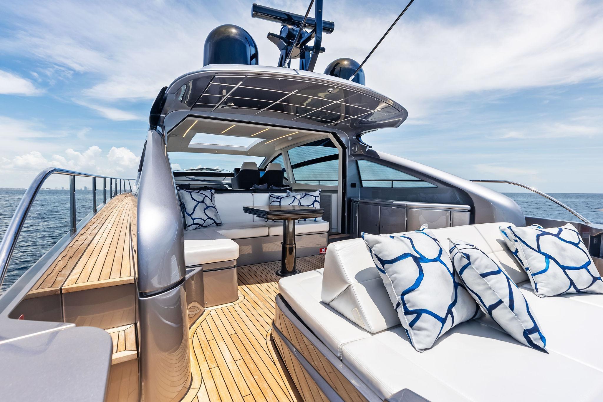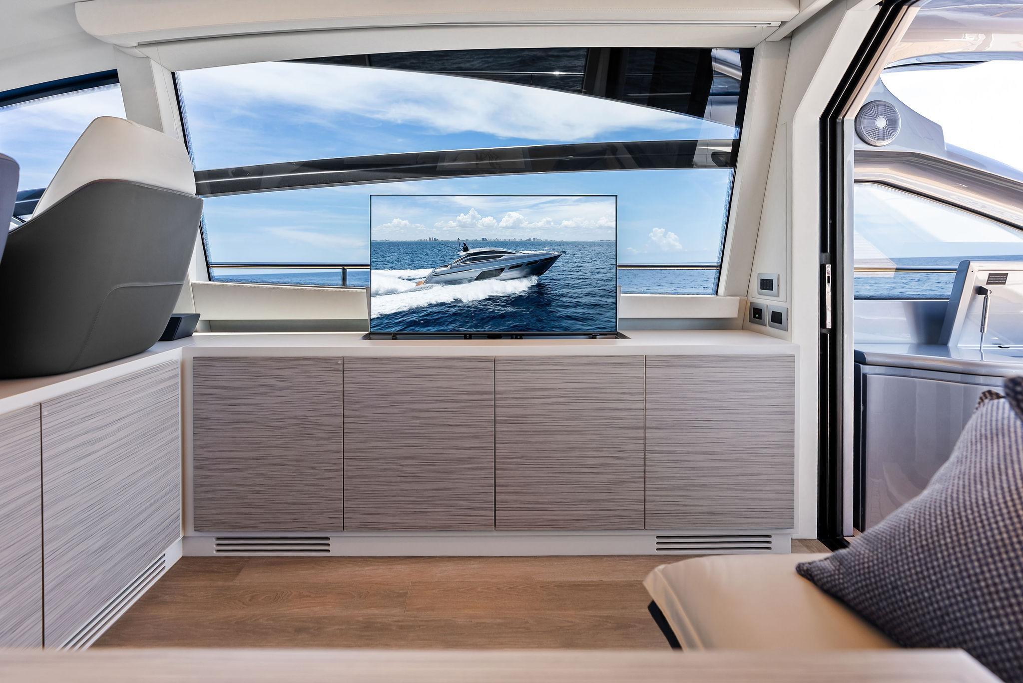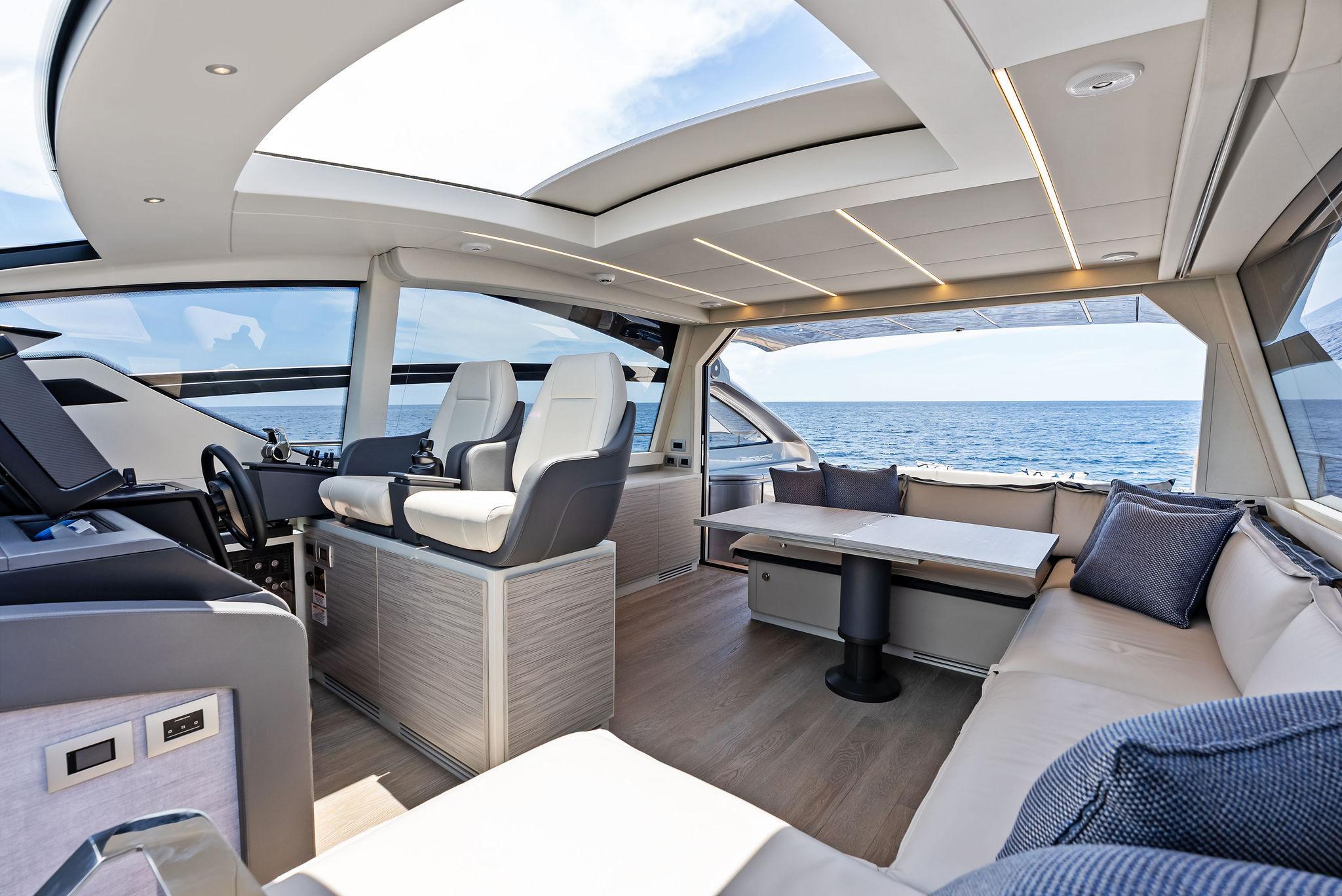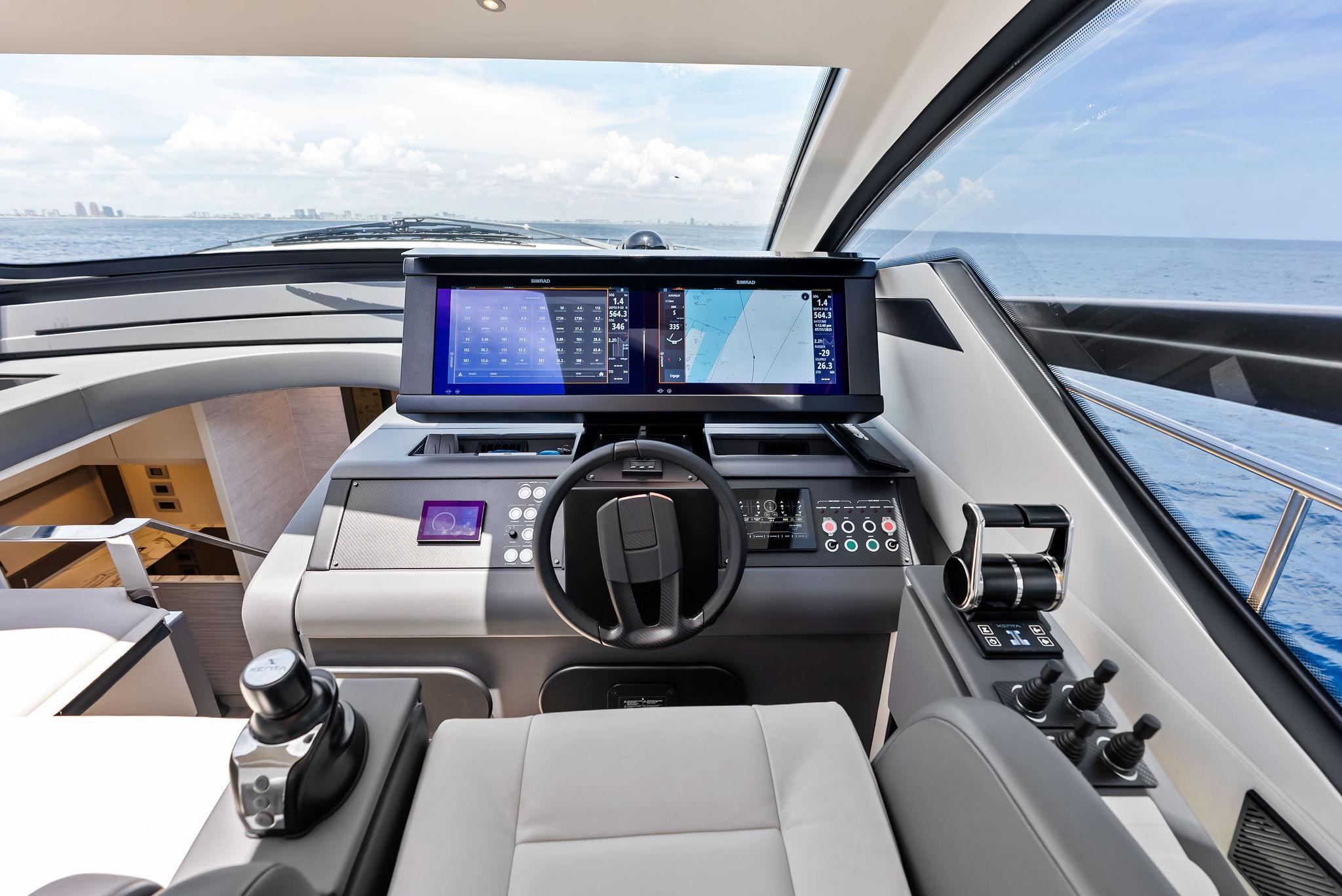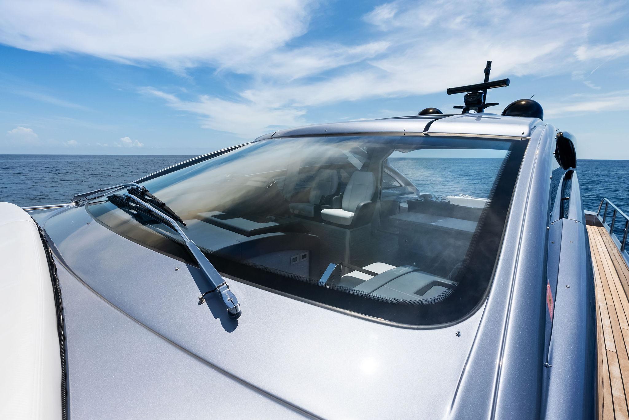 Ceiling LED lights • Co-pilot seat upholstered with Poltrona Frau leather • Dashboard painted and carbon look • Bow thruster joystick Built-in autopilot plotter Carbon look dashboard panels Compass Display 7" for surface drive system management Engine room remote camera on plotter screen Helm wheel in leather Multifunction touch display for navigation system (chart plotter, GPS, echo sounder, engines) (1x7", 1x12")Trim joystick Trim tabs joystick Windshield wiper/washer (2)Double USB watertight socket • Electronic levers for engine controls • Movable armrest with throttles at pilot's stbd • Pilot seat upholstered with Poltrona Frau leather • Sliding roof with electric movement • VHF radio • Windshield in transparent tempered glass