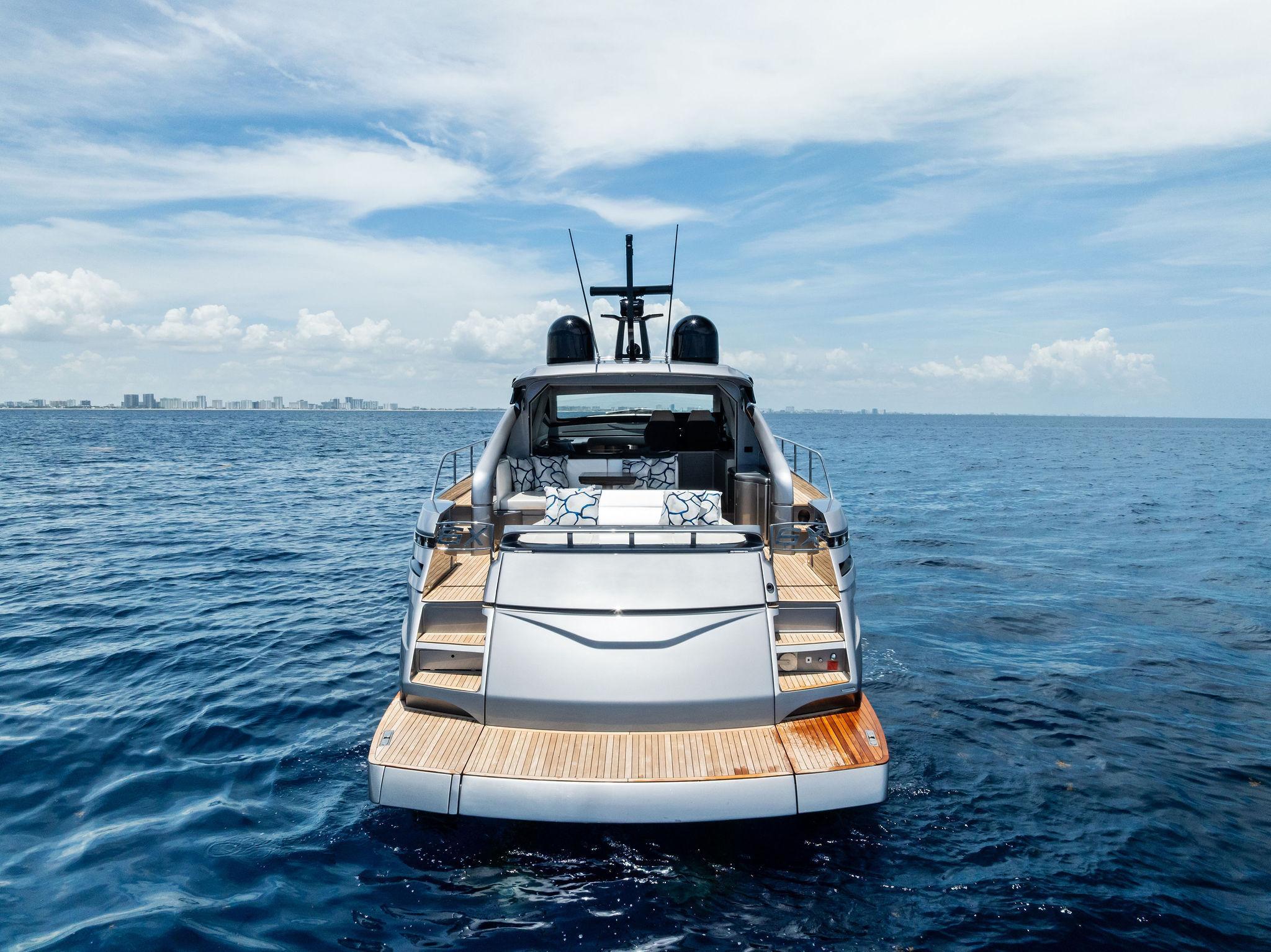 Aft teak steps port and starboard • External shower • LED lighting • Shore socket and loose cable 63A • Shore water inlet • Stainless steel gate for cockpit entry (2) • Swim ladder, hydraulic, hideaway with alarm • Swimming platform with hydraulic movement and waterproof control pad • Telescopic hydraulic hideaway gangway with (2) remote controls