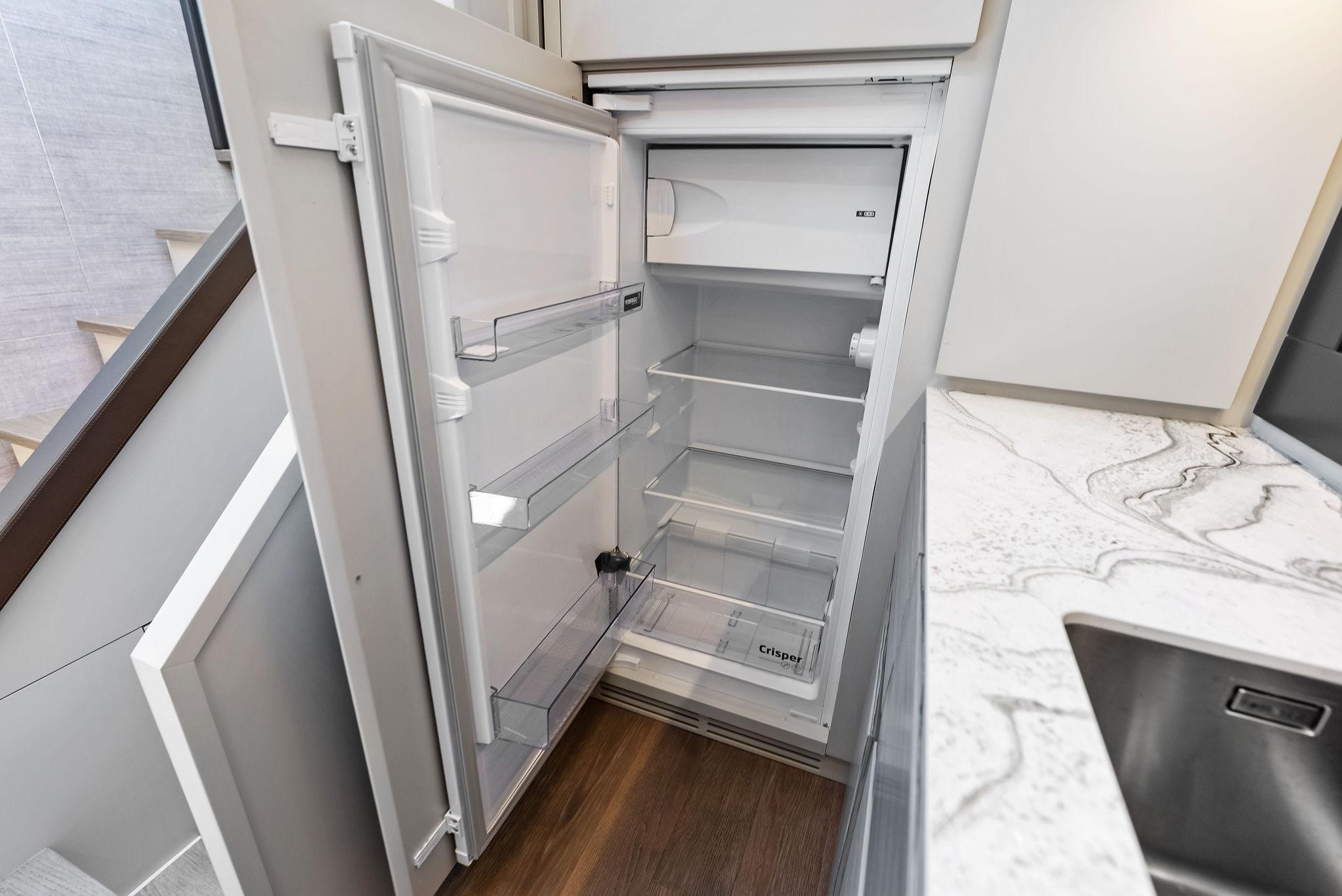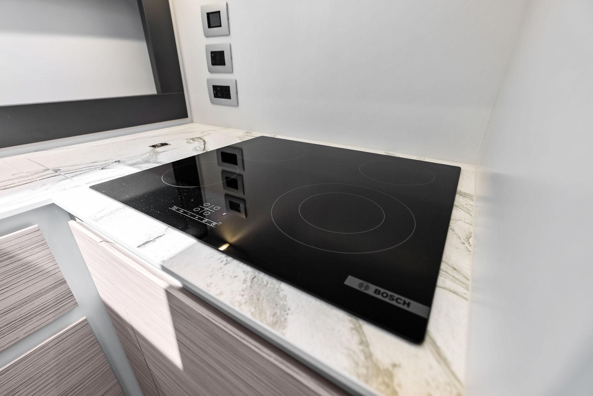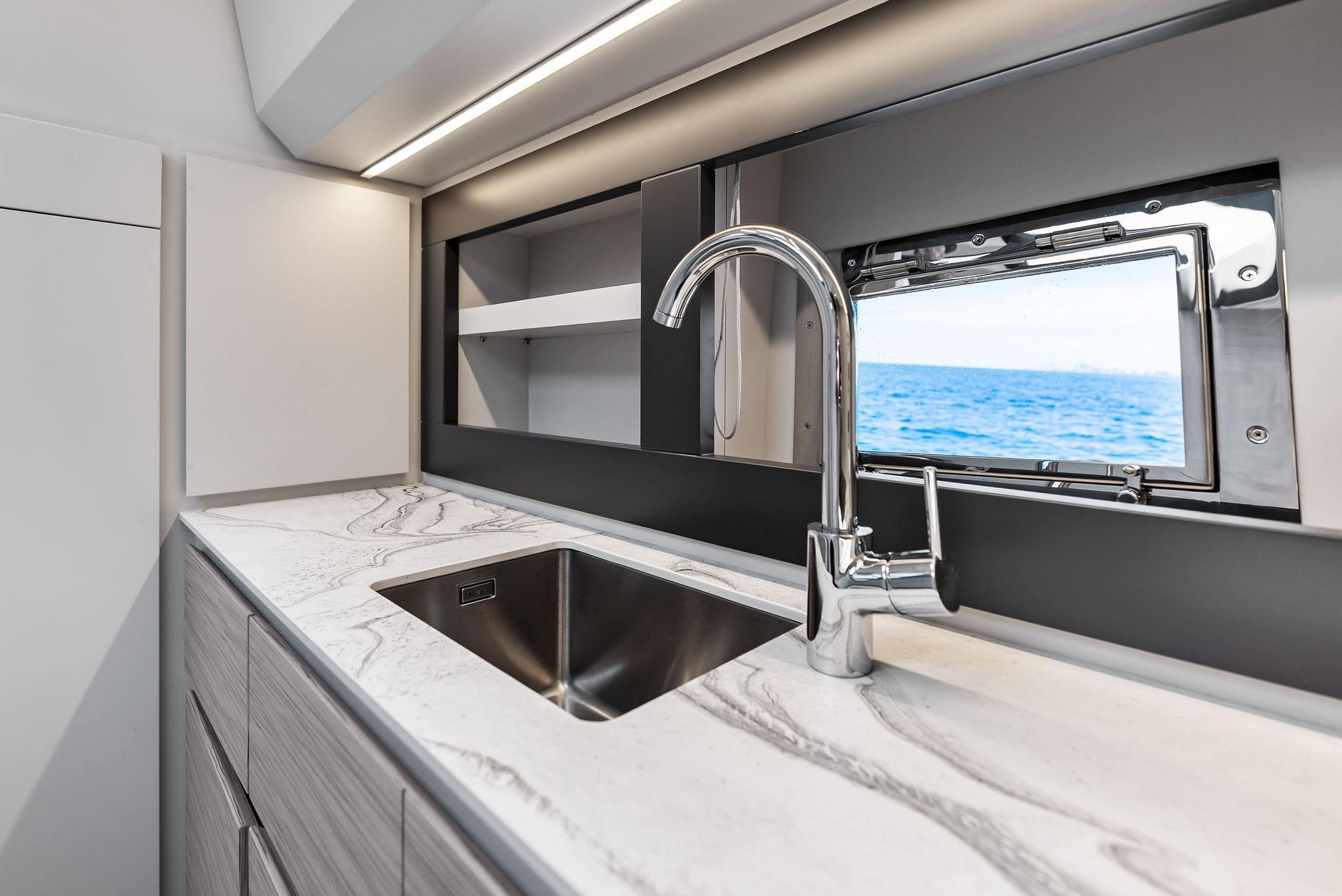 Ceiling skylight • Ceramic glass hob with 4 burners • Corian work top • Digitally controlled A/C system • Extractor hood 240V 60Hz • Faucet • Freezer top opening (53l) (24V and 230V) • LED ceiling lights • Light switches with soft touch panel • Lights under hanging lockers • Microwave oven • Refrigerator 190l (24V and 230V) • Rubbish bin • Stainless steel openable porthole • Stainless steel washbasin with 3 way valve • Structural GRP floor covered with parquet • Under top units lacquered with doors, internal shelves and drawers • Walls covered in laminate • White lacquered ceiling