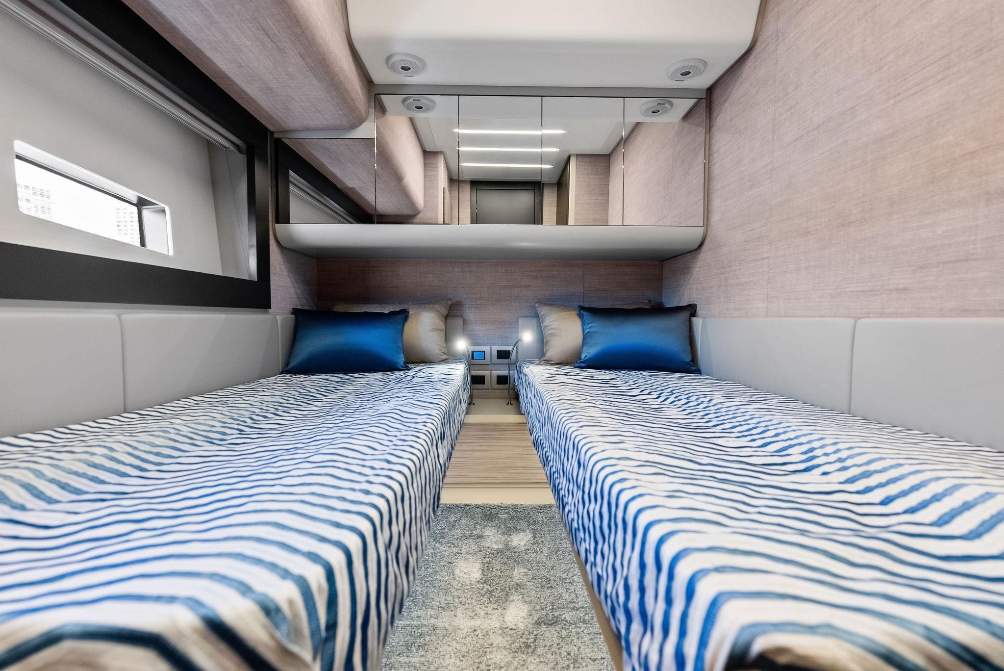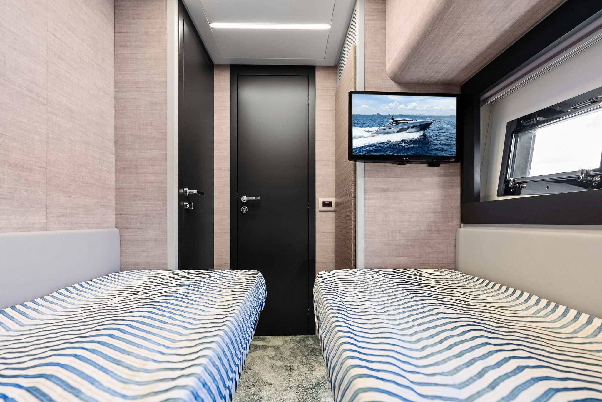 Ceiling panels covered with vinyl fabric and lacquered wood ceiling frame • Digitally controlled A/C system • Fixed side windows in tempered glass and opening porthole in stainless steel and tempered glass • Lacquered door • Door handle with thumb lock Lacquered nightstand with door • Lacquered wardrobe, internal light • Leather bed headboard (2) • LED ceiling lights • Light switches soft touch panel • Manual roll curtains in fabric • Mini Hi-Fi with speakers (2) • Mirror at aft bulkhead • Reading lights (2) • Structural GRP floor covered with carpet • Twin bed (2) • Bed frame upholstered in leather and underneath drawers Lighting strip underneath the bed Mattress, bedspread, pillow Walls covered in wallpaper