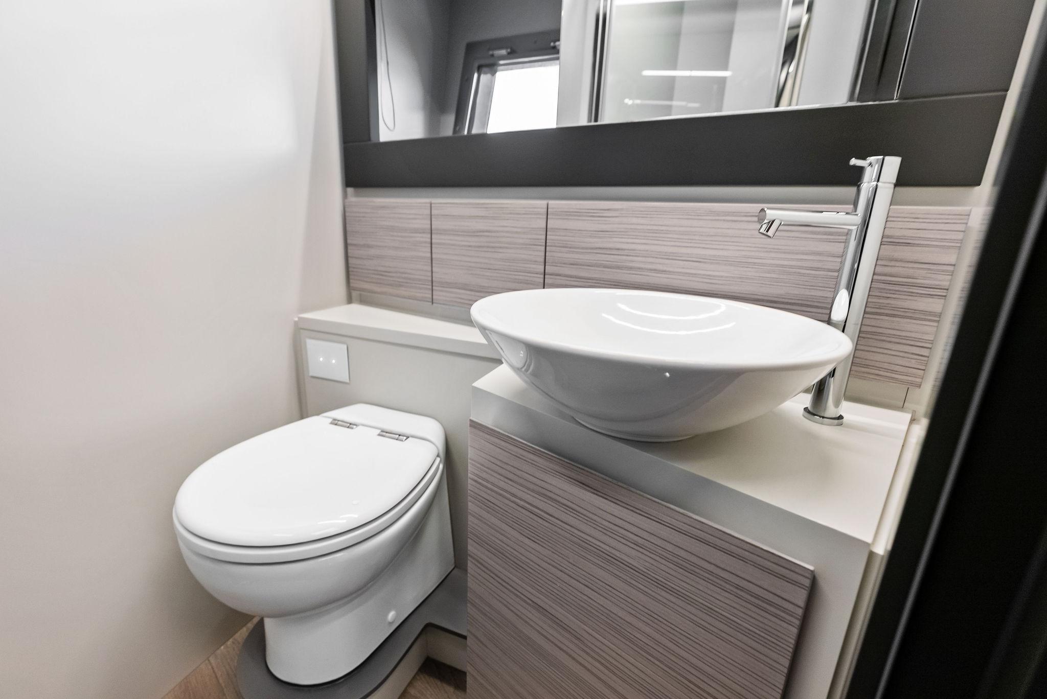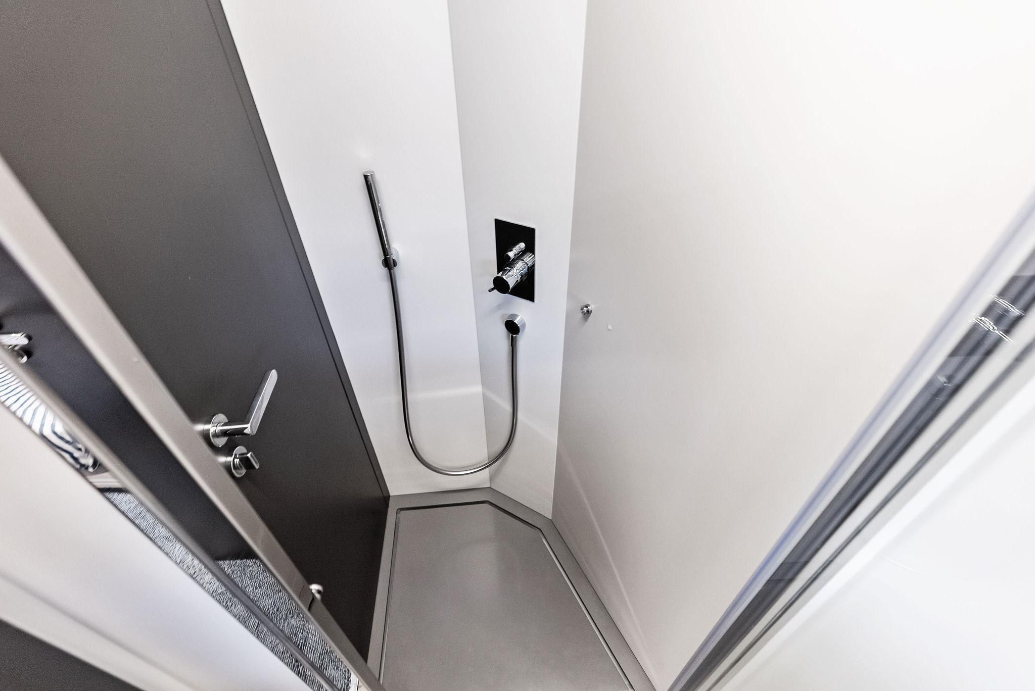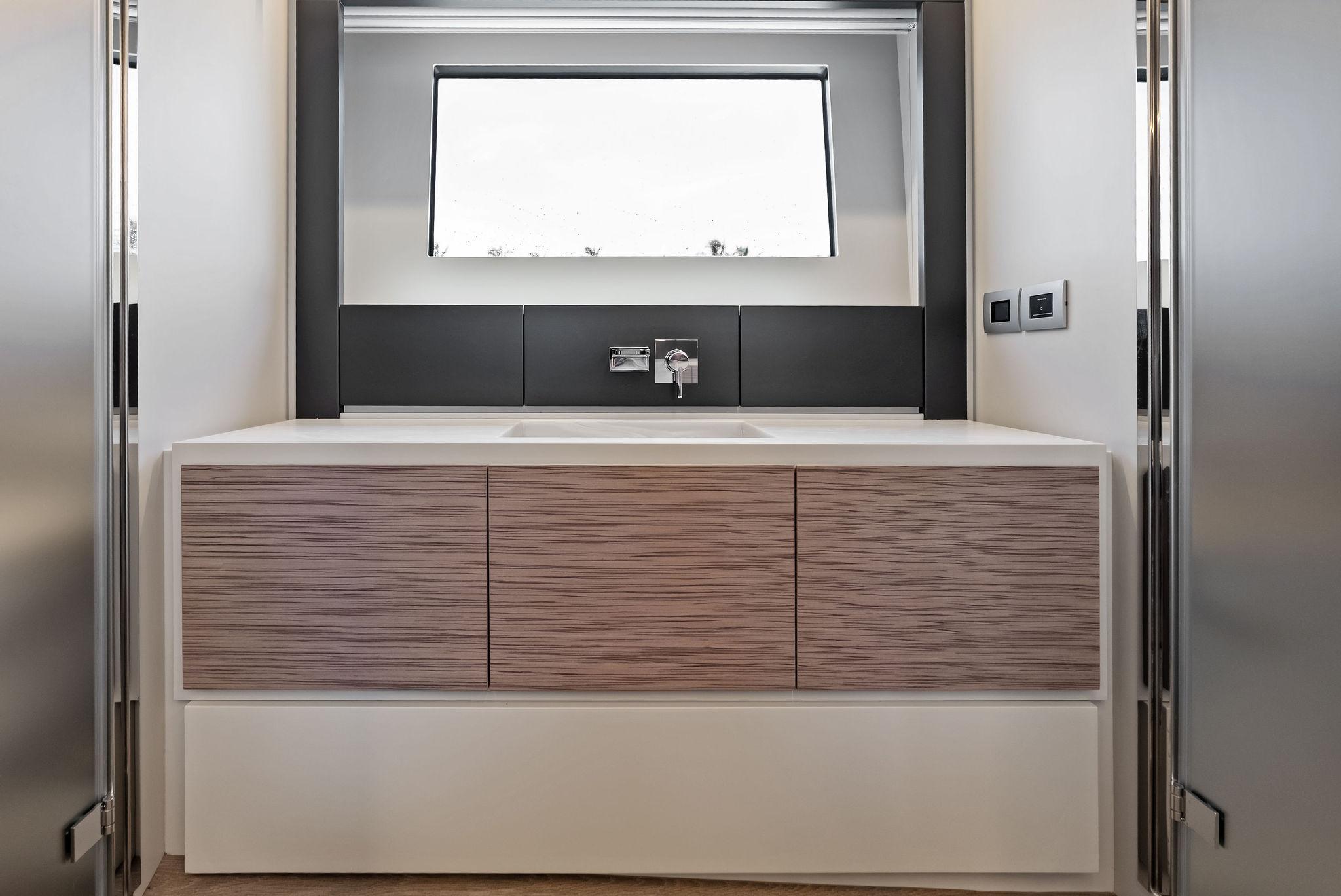 Built in LED ceiling lights • Clothes hook (2) • Electric WC • Fixed side windows in tempered glass and opening porthole in stainless steel and tempered glass • Hanging locker in unsealed lacquered, with mirror and internal shelves • Lacquered door • Chrome door stops for interiors Door handle with thumb lock Lacquered washbasin unit with opening doors in essence • Washbasin faucet Washbasin in porcelain Light switches soft touch panel • Manual aluminum Venetian blinds • Parquet floor • Shower • Glass shower door Shower box covered in laminate Shower faucet with double outlets with deviator Shower floor and seat in Corian Showerhead and shower handset Toilet roll holder • Towel rack • Walls covered in laminate • WC brush holder • White lacquered ceiling