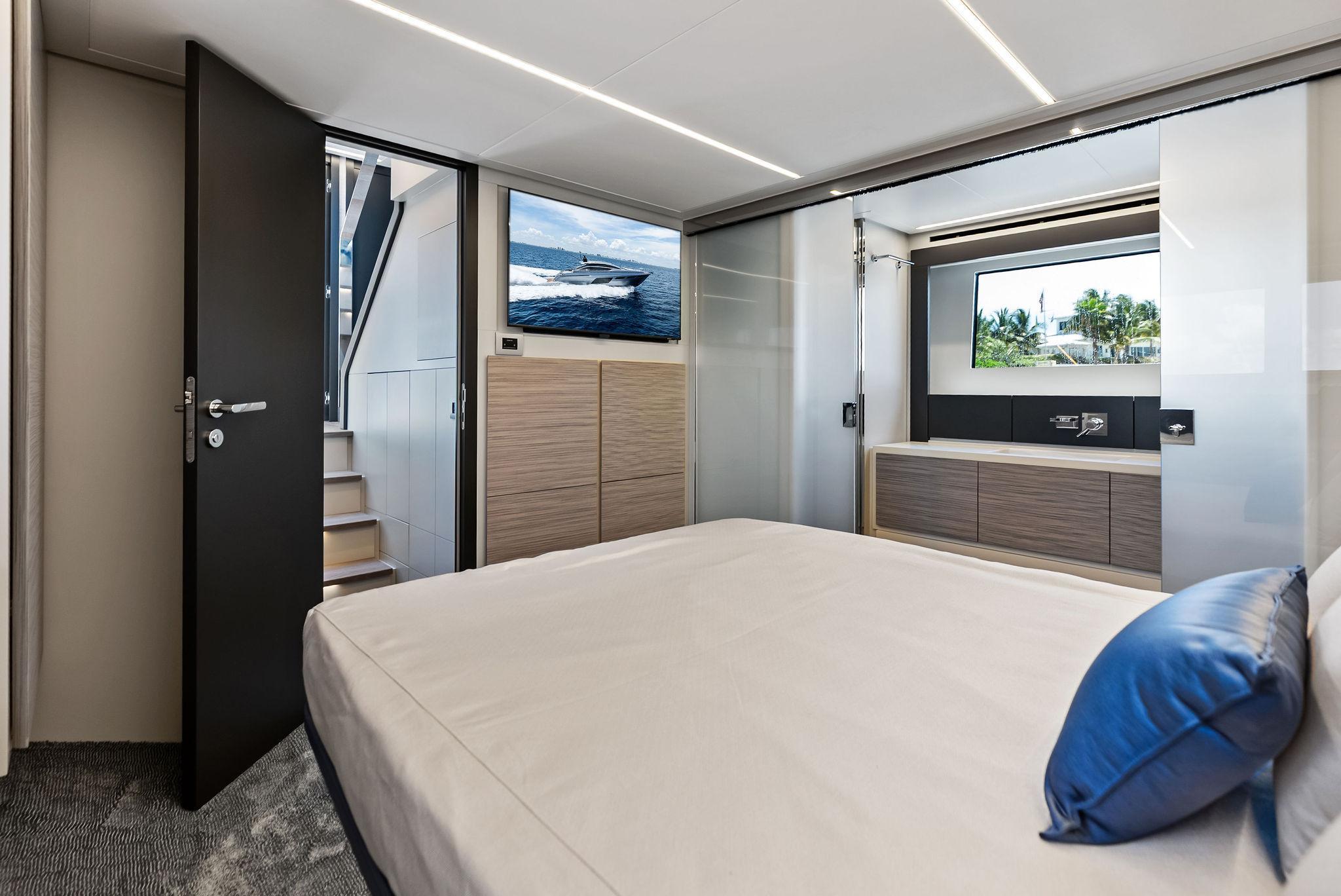 Built in LED ceiling lights • Digitally controlled A/C system • Double bed with drawers underneath • Bed frame upholstered in leather Lighting strip underneath the bed Mattress, bedspread, pillow Emergency exit to upper deck from circular hatchway and hideaway ladder • Fixed side windows in tempered glass and opening porthole in stainless steel and tempered glass (2) • Lacquered door • Chrome door stops for interiors Door handle with thumb lock Lacquered nightstand with door (2) • Lacquered wardrobe, internal light • Light switches soft touch panel • Manual fabric curtains • Mini Hi-Fi with speakers (2) • Mirror at aft bulkhead • Paneled ceiling upholstered in vinyl fabric with perimetral lacquered wood • Reading light (2) • Sliding blind for hatchway • Structural GRP floor covered with carpet • Walls covered in wallpaper