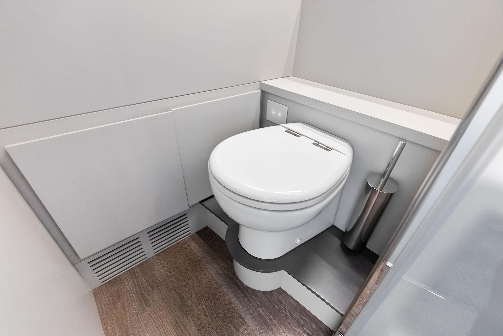 Ceiling upholstered in vinyl fabric • Lacquered and wallpaper walls • Lacquered furniture (with built-in washing/dryer machine opt) • LED ceiling lights • Light switches soft touch panel • Mirror • Structural GRP floor covered with parquet