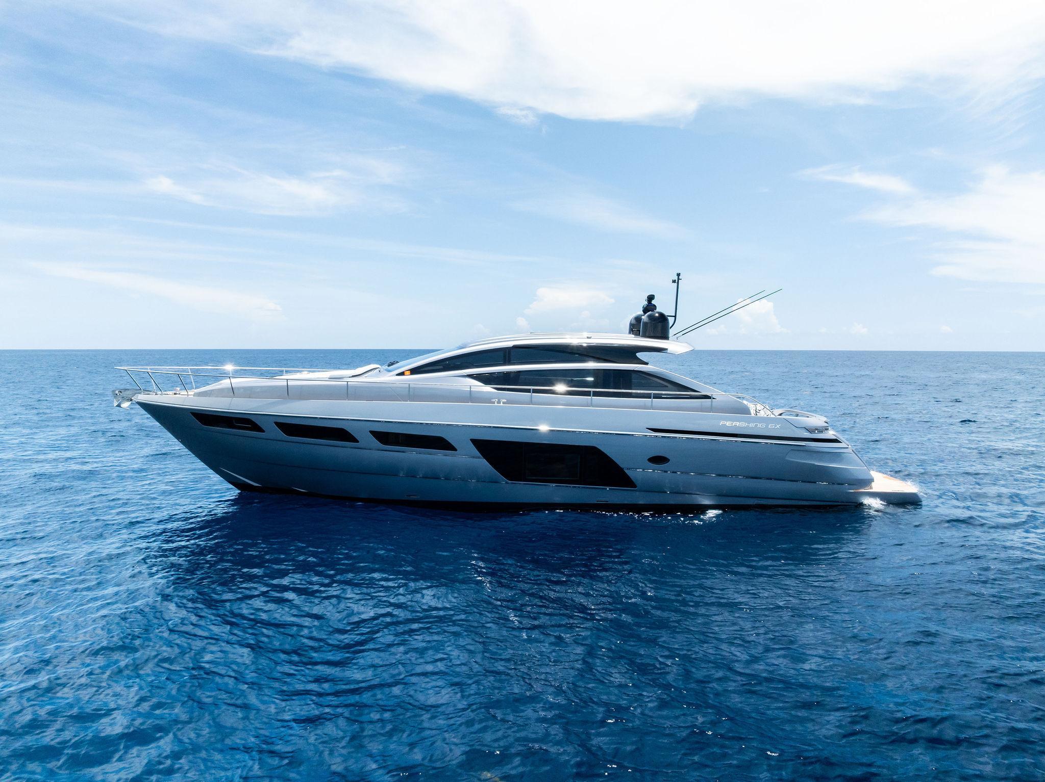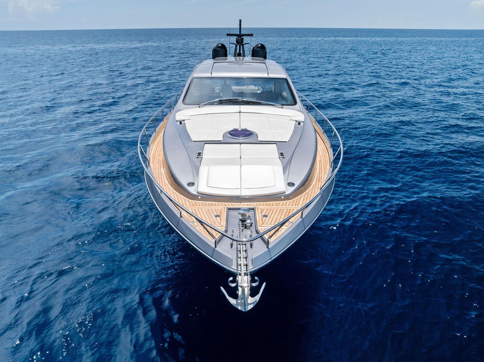 Black water pump out cap • Fresh water filling cap • Fuel filling cap • Side silicone Pershing Logo (2) • Stainless steel mooring cleat (2) • Stainless steel railing Ø40mm with stanchions Ø30mm and hooking points