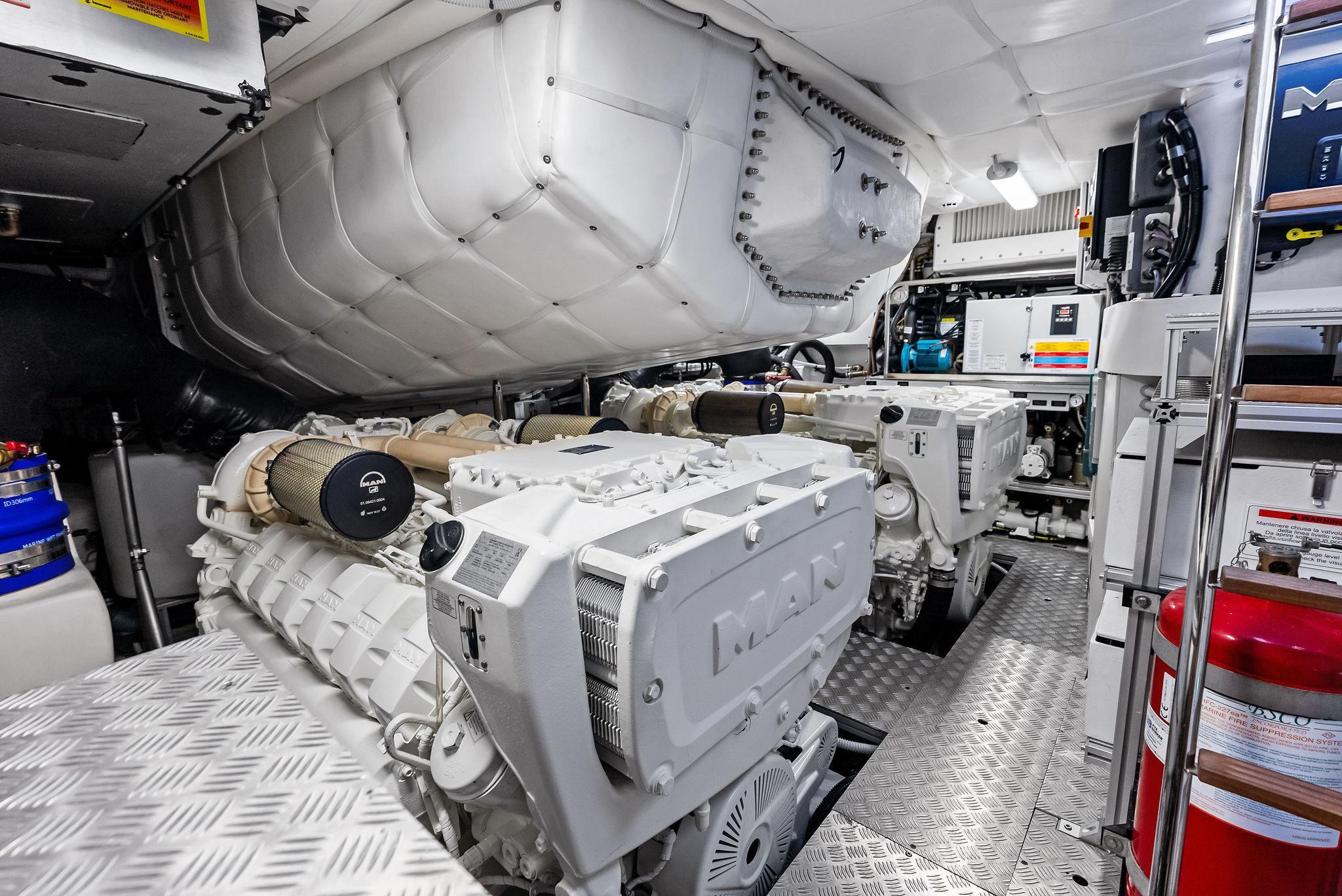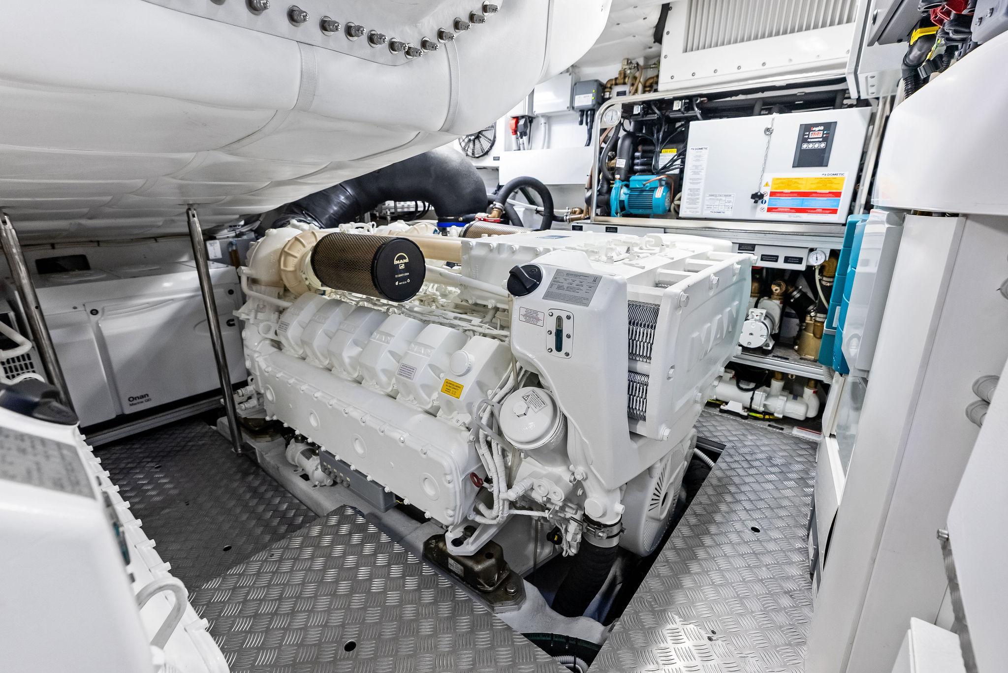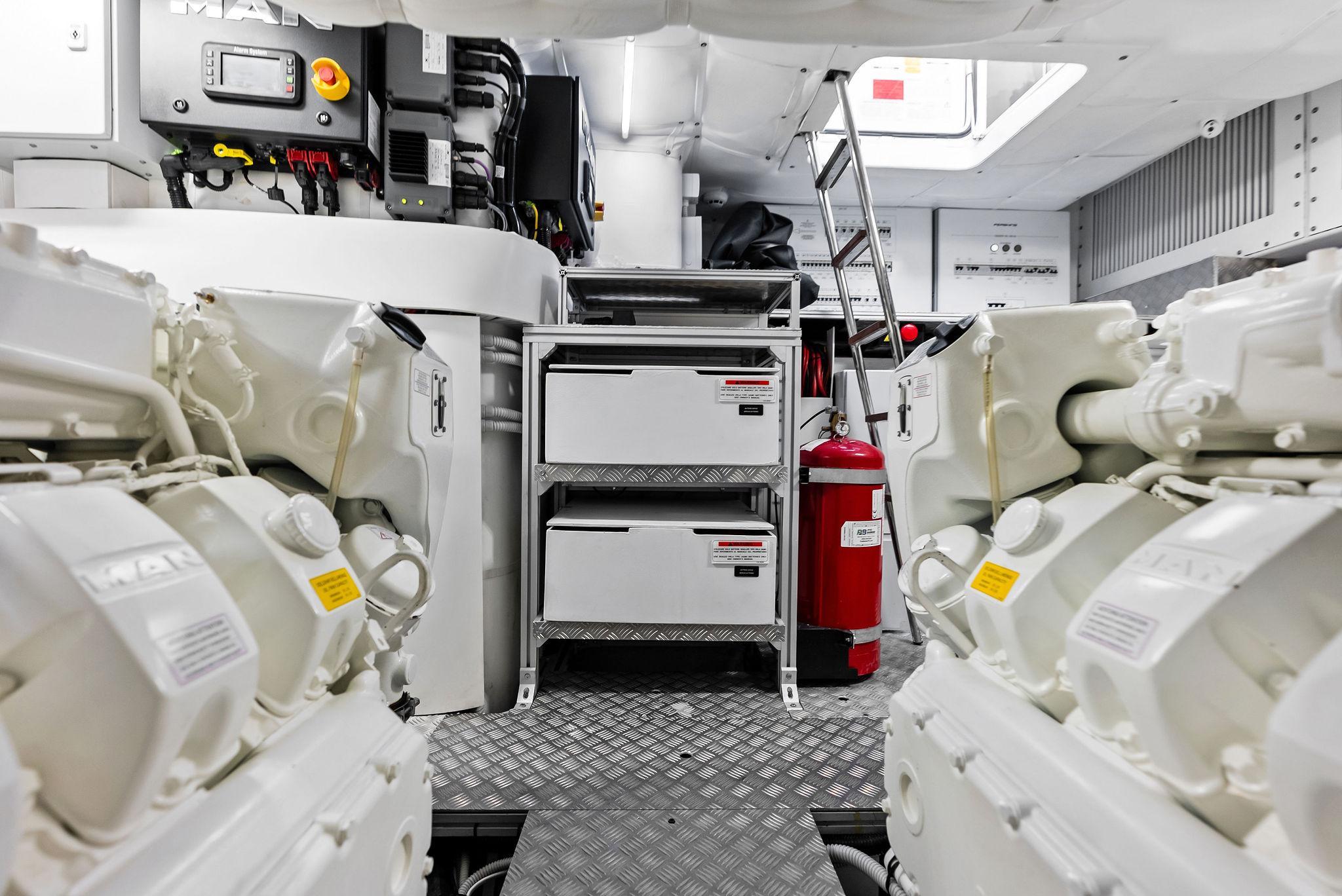 A/C unit • Acoustic insulation • Air intakes • Coupling joint between adaptor and flange (2) • Diesel engines MAN V12 1550mhp • E/pump A/C • Electric extractor (2) • Engine exhaust muffler (2) • Generator manifold and gas separator • Hydraulic steering oil tank • Hydraulic unit for gangway, swim ladder, garage hatch and aft door • Hydraulic unit for platform, trims, trim tabs and steering • Light switch • OBD (On Board Diagnostic) socket • Power generator 21,5kW 60Hz with soundproof housing • Protective cover added to coupling • Stainless steel engine exhaust raiser (2) • Waterproof camera interfaced with helm • Waterproof fixed explosion-proof neon light (4) • Wooden plank ribbing/PU covered in anti slip material