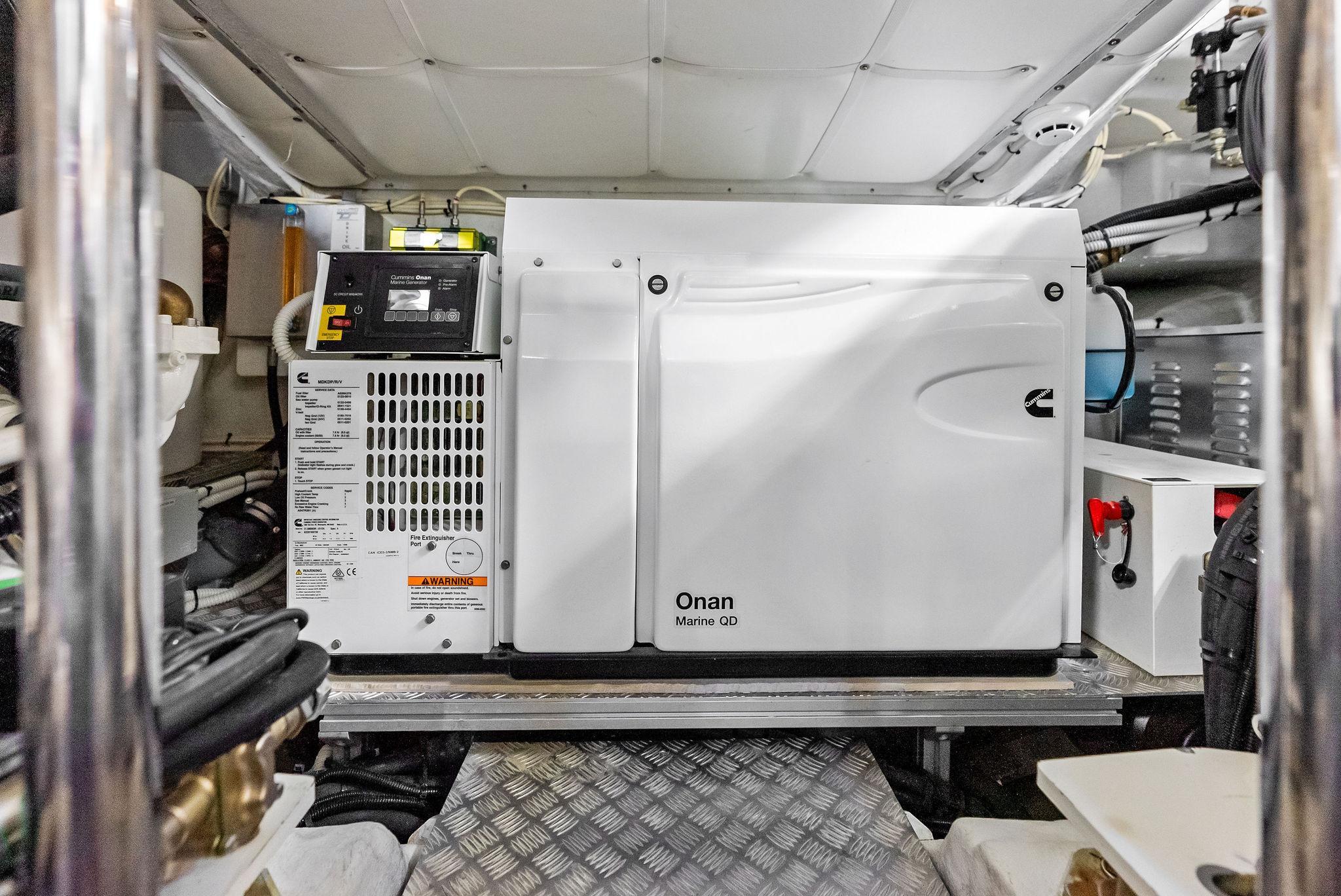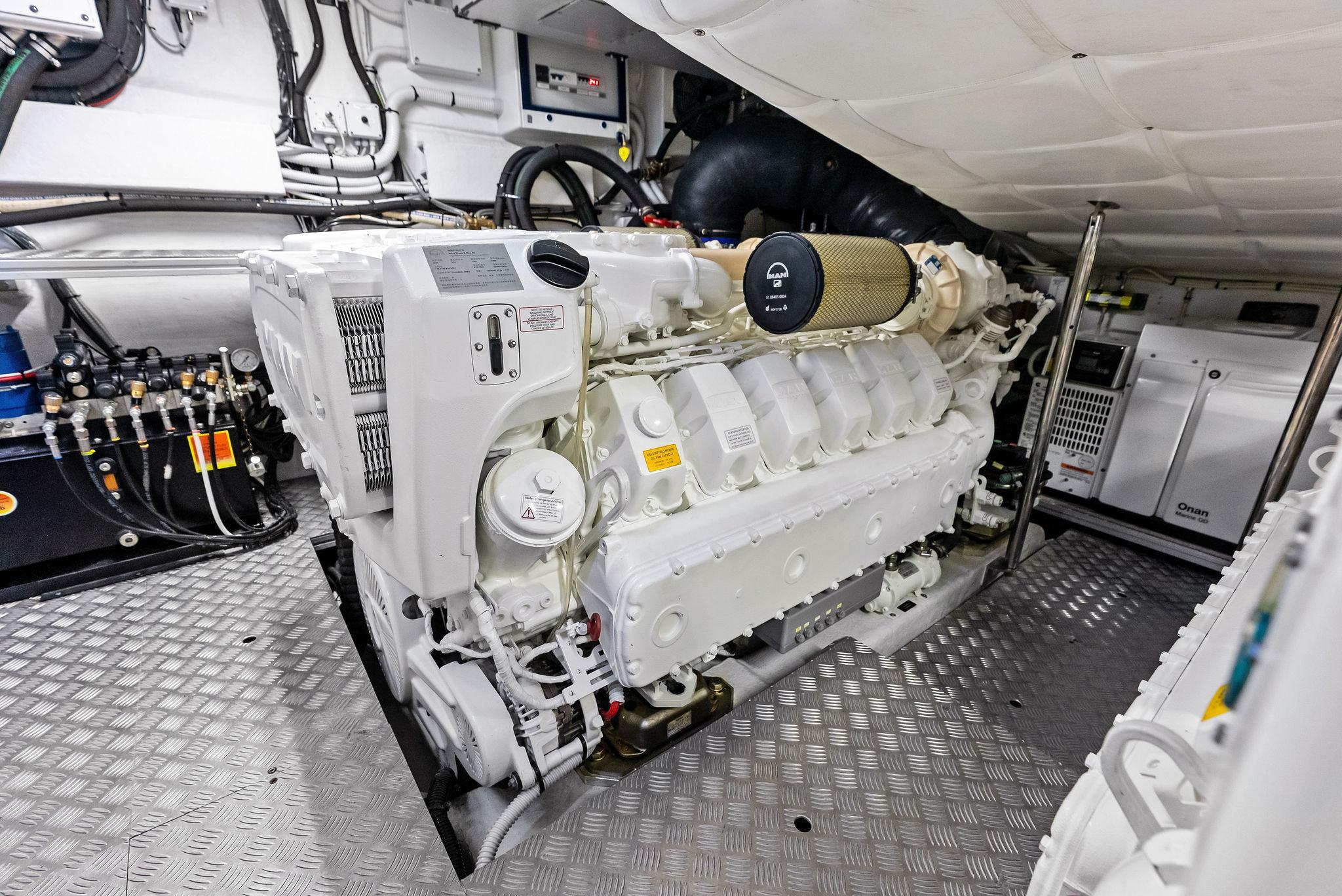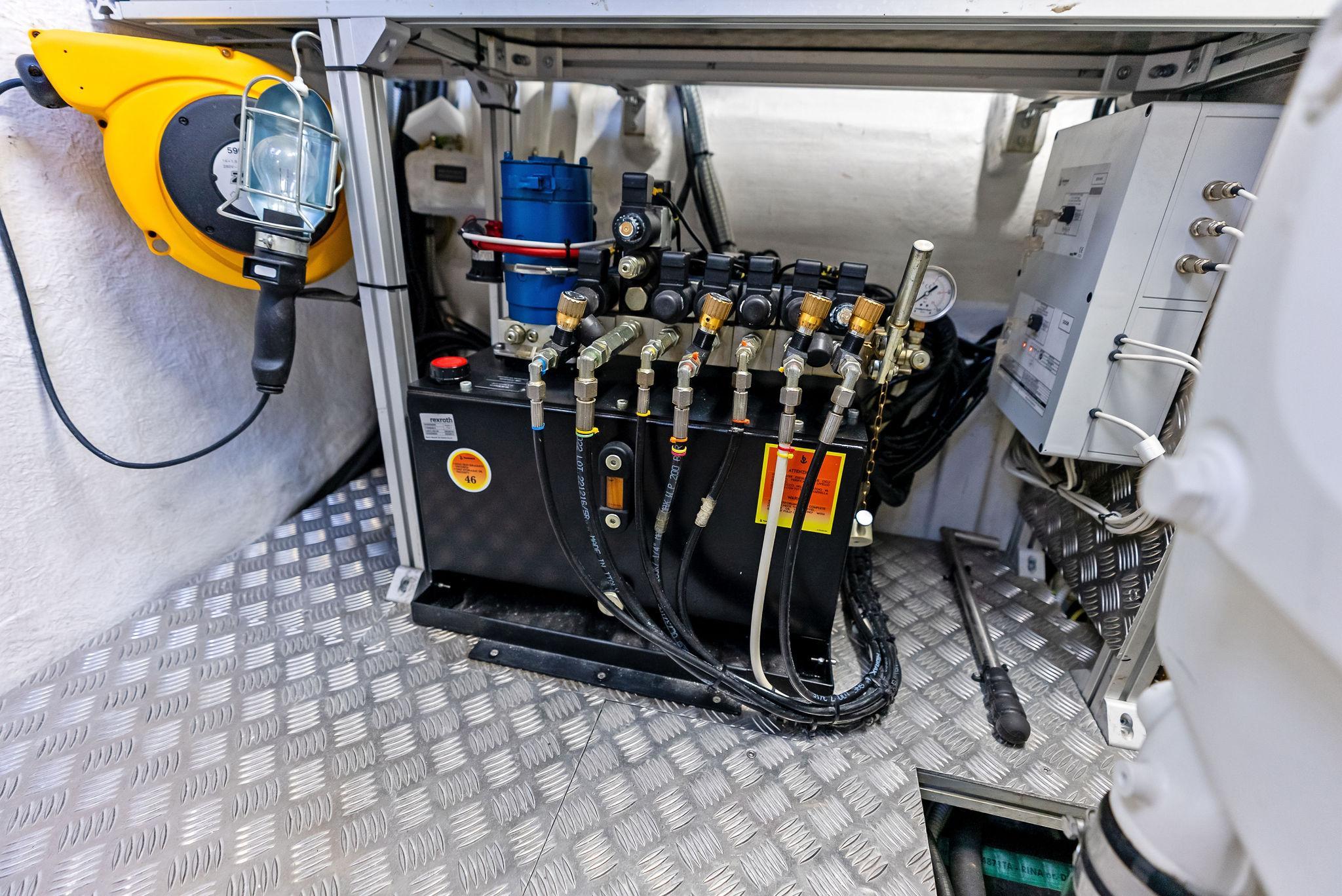 A/C unit • Acoustic insulation • Air intakes • Coupling joint between adaptor and flange (2) • Diesel engines MAN V12 1550mhp • E/pump A/C • Electric extractor (2) • Engine exhaust muffler (2) • Generator manifold and gas separator • Hydraulic steering oil tank • Hydraulic unit for gangway, swim ladder, garage hatch and aft door • Hydraulic unit for platform, trims, trim tabs and steering • Light switch • OBD (On Board Diagnostic) socket • Power generator 21,5kW 60Hz with soundproof housing • Protective cover added to coupling • Stainless steel engine exhaust raiser (2) • Waterproof camera interfaced with helm • Waterproof fixed explosion-proof neon light (4) • Wooden plank ribbing/PU covered in anti slip material
