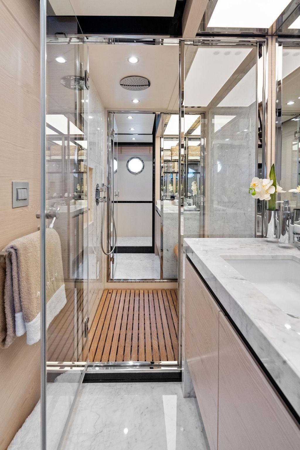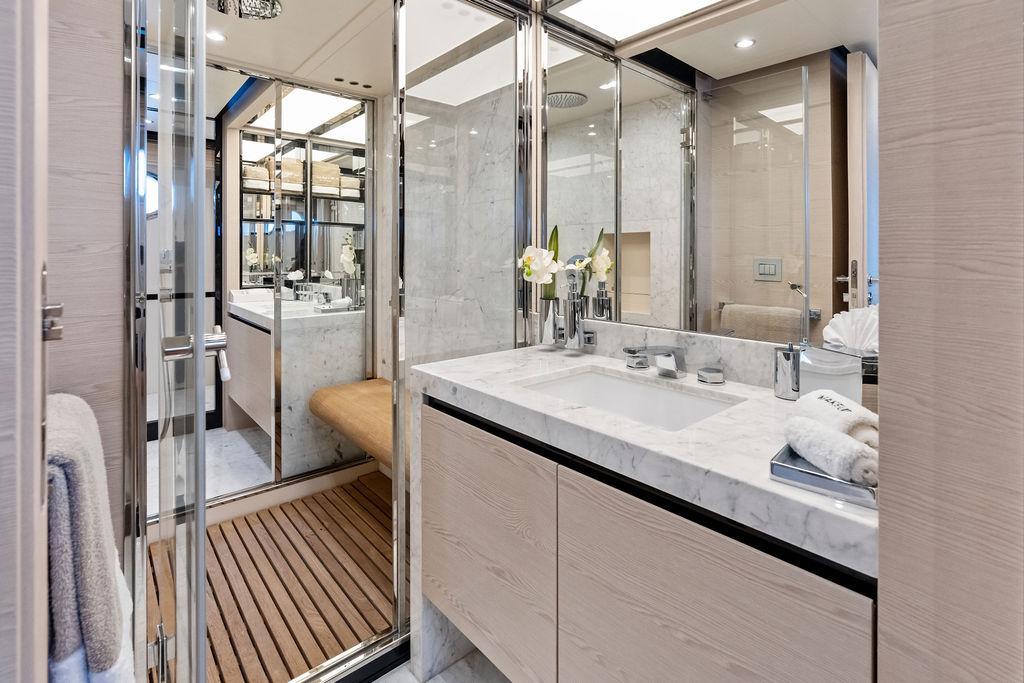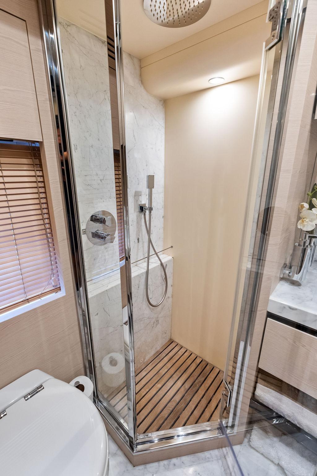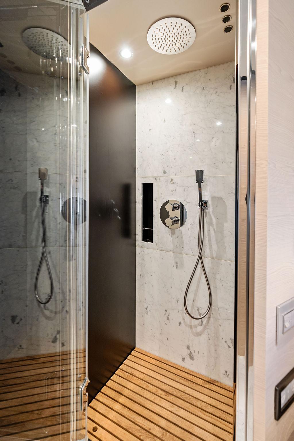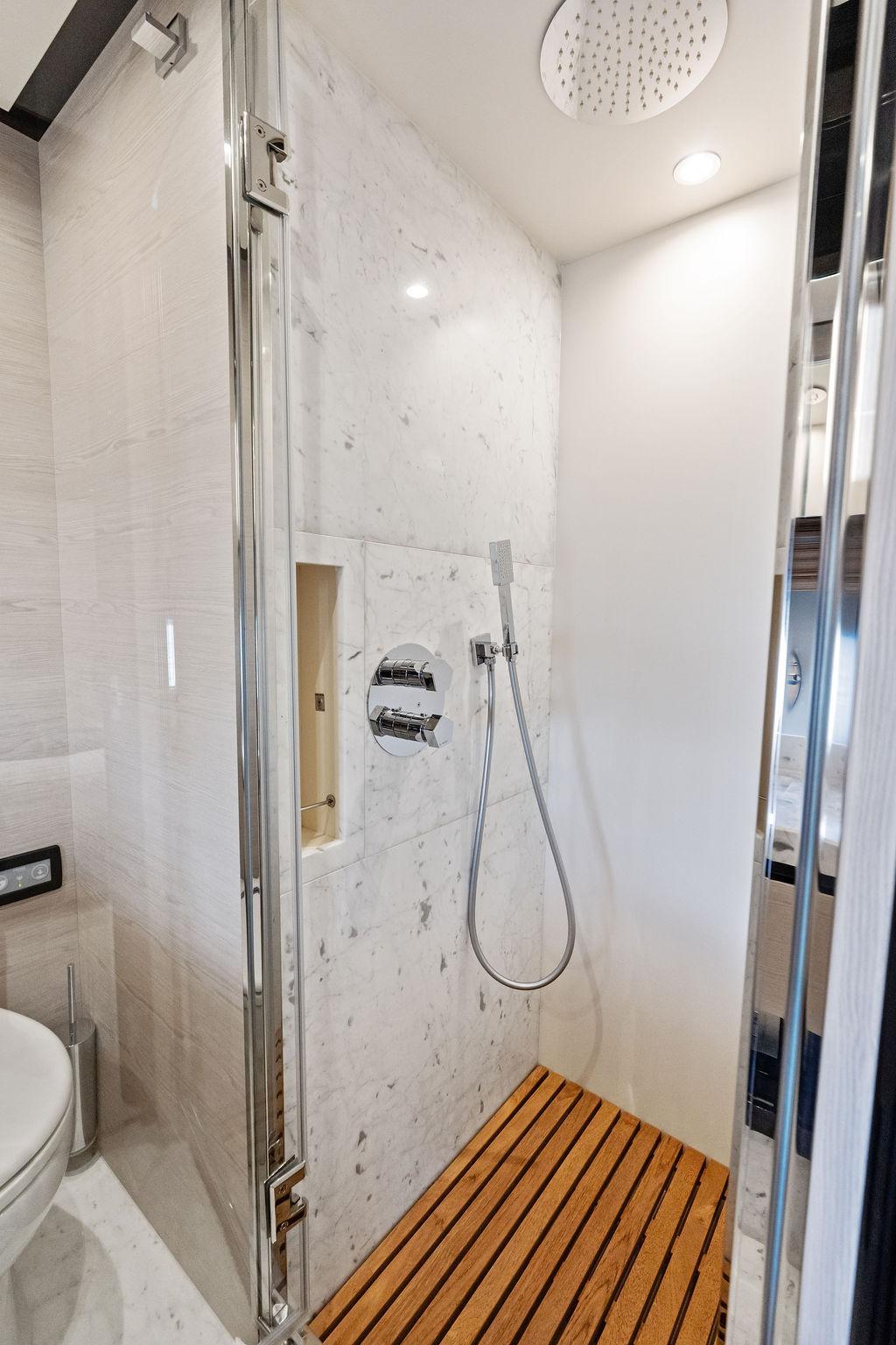 VIP Shower: Bulkheads with White Laminate and Carrara Marble