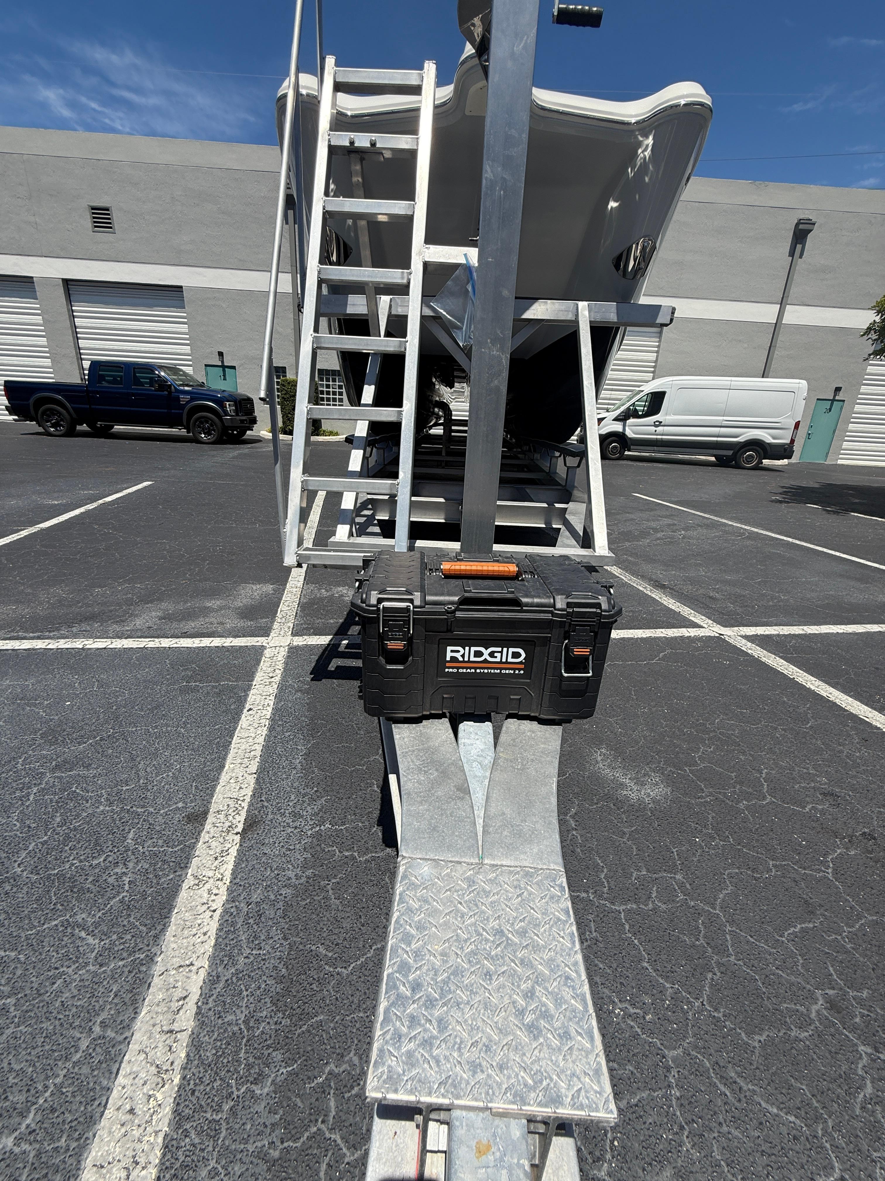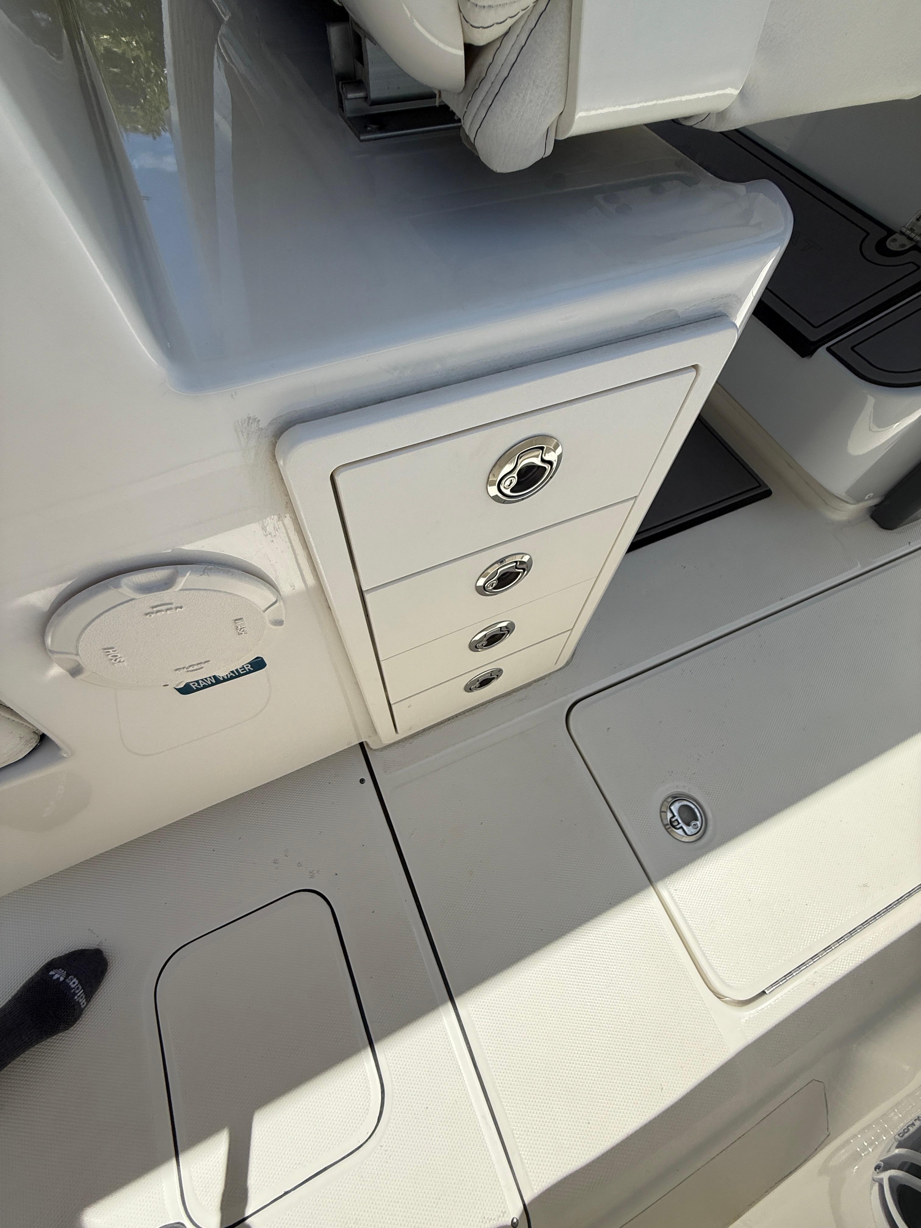 - Port and starboard gunwale-mounted lockable tackle and bulk storage (54”x16”x9” deep storage cabinet w/ 4/5” fiddle rail starboard; 24”x16”starboard tilt-out storage cabinet)