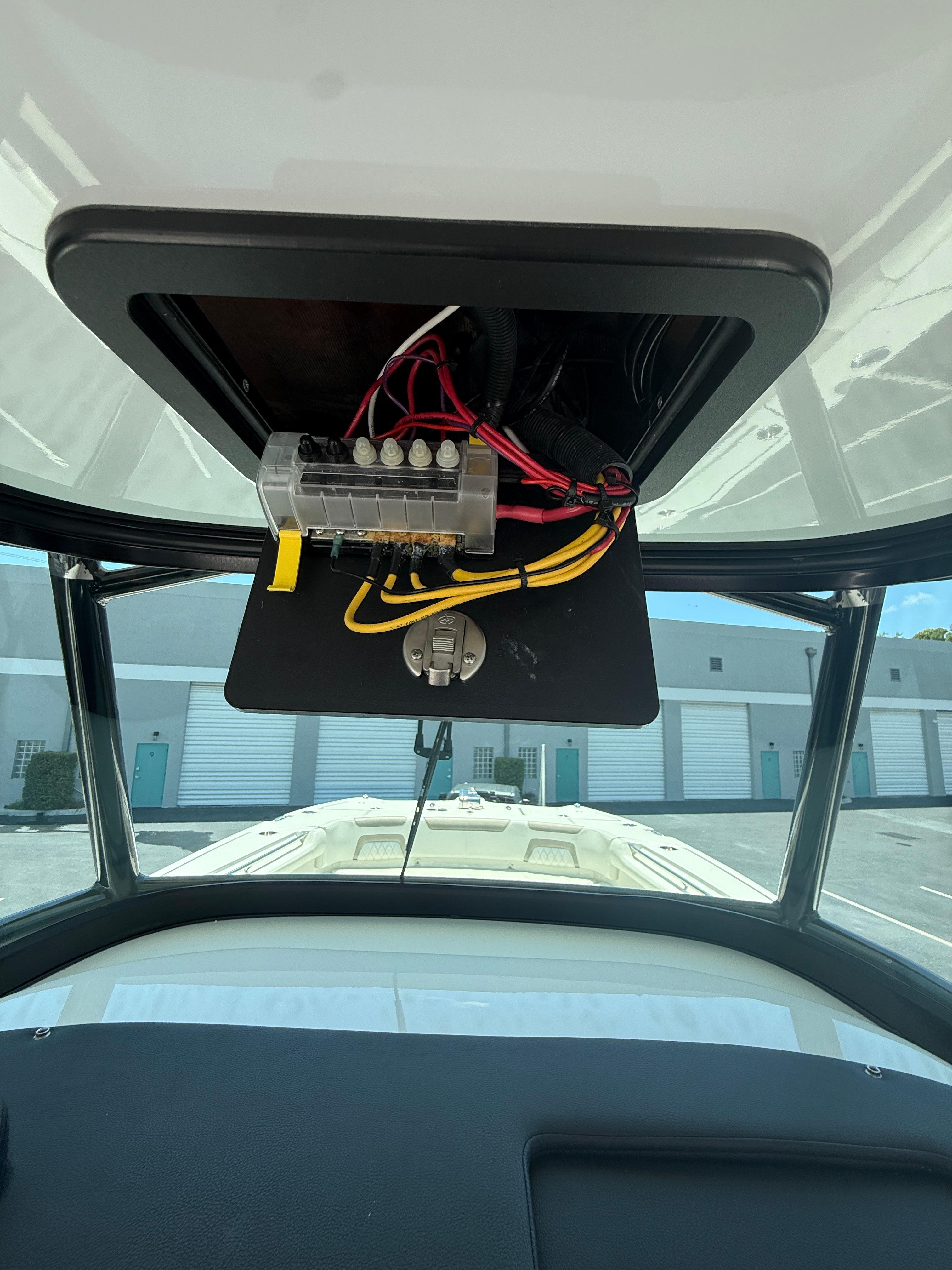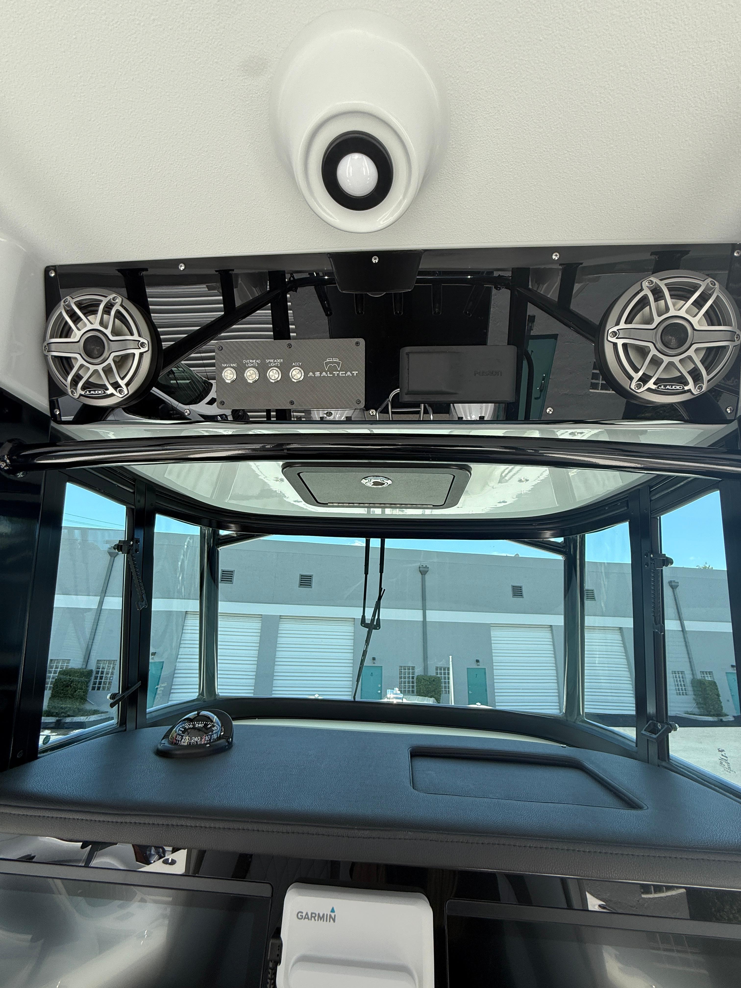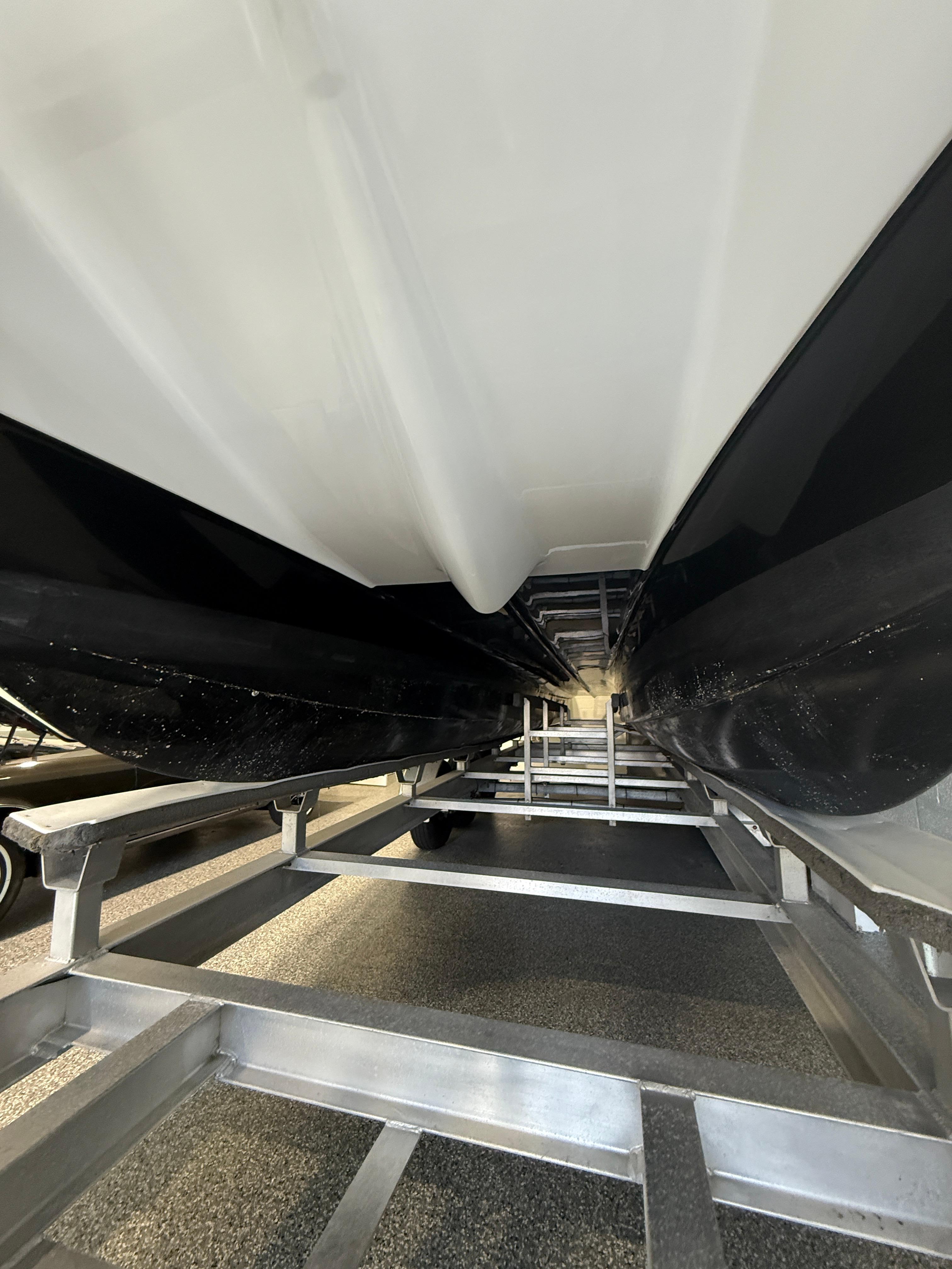 - Fiberglass console with electronics area, netted storage compartments, 2 stainless steel cup holders, passenger handrail, footrest, insulated storage compartment, & black dash brow