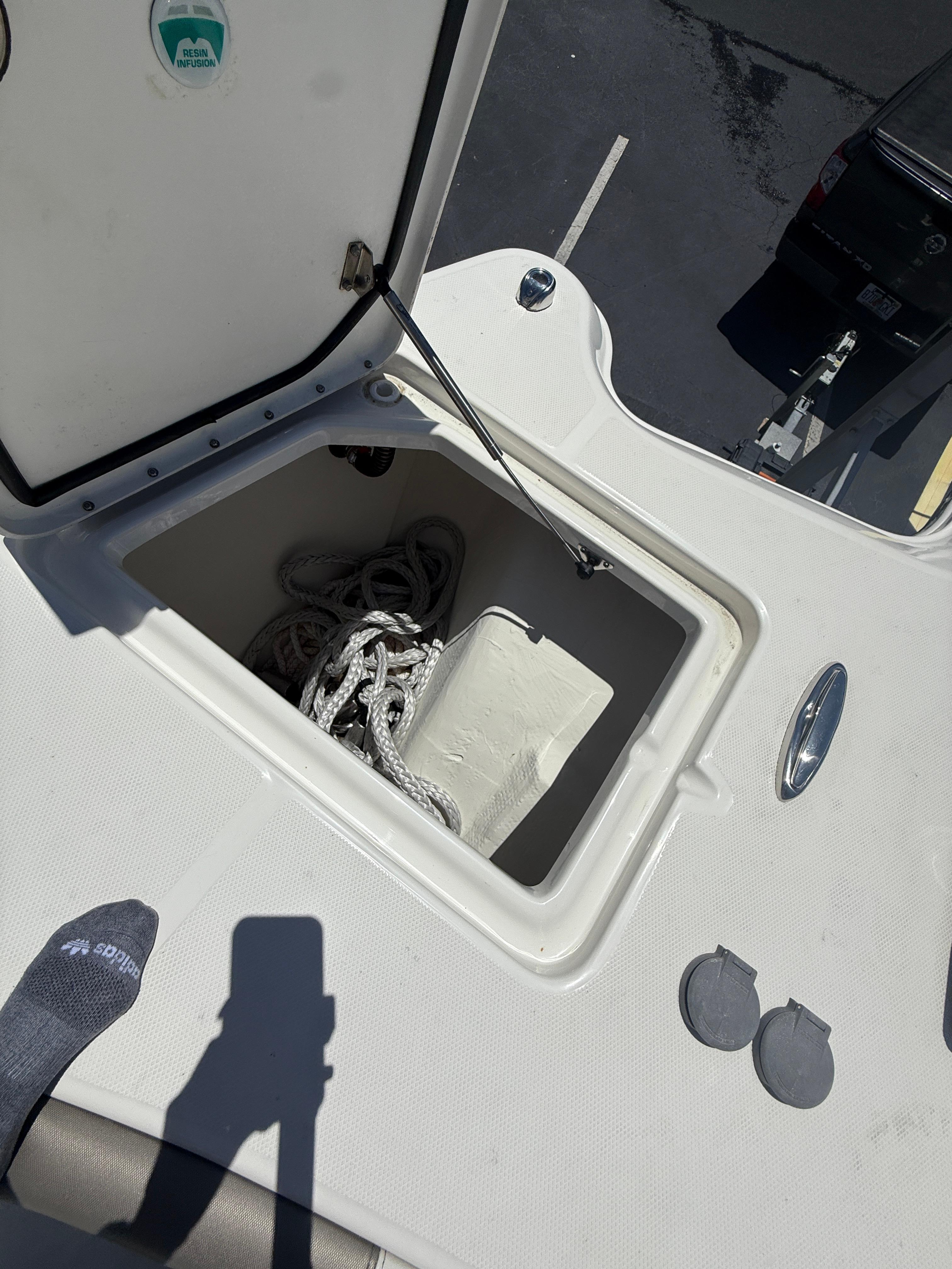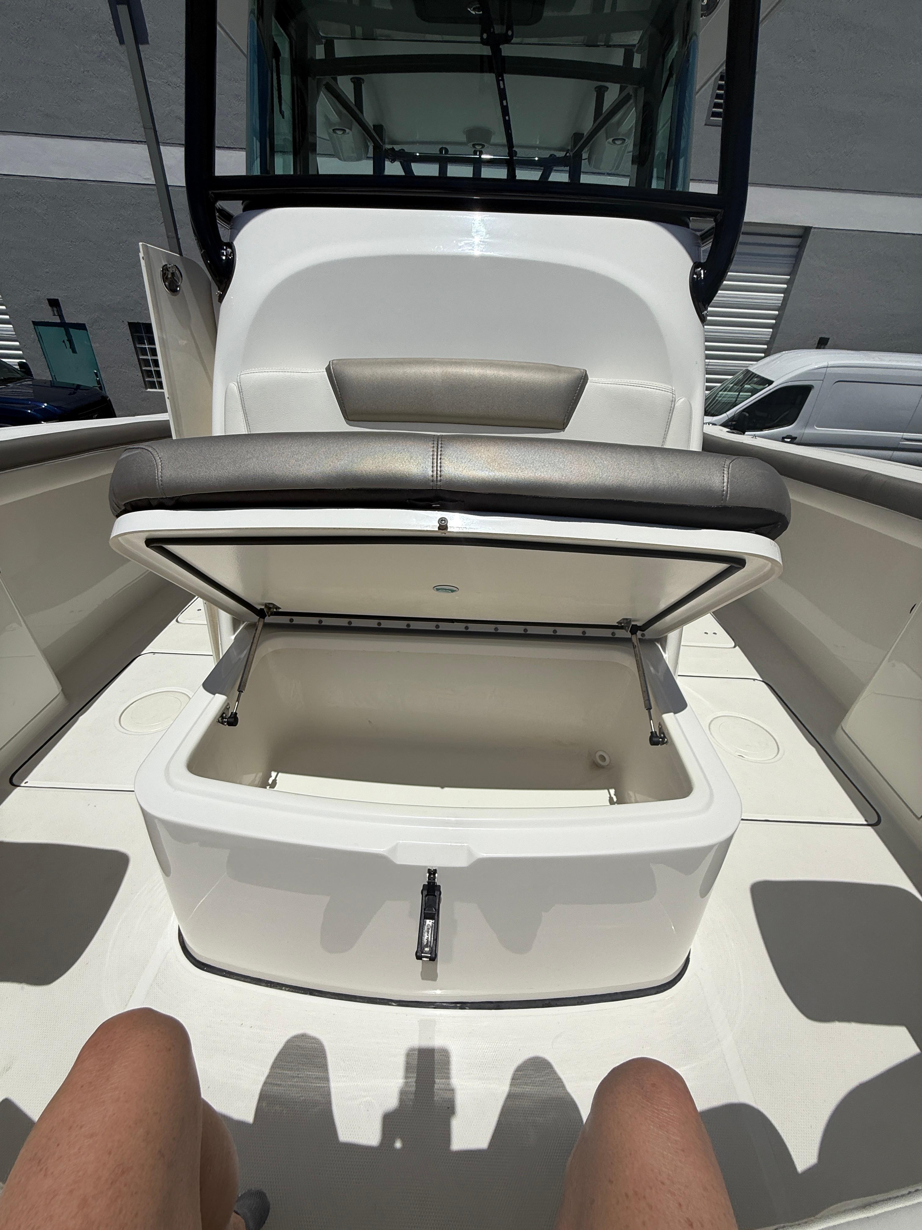 - Insulated 225-quart port and starboard storage compartments with overboard drains for use as fish boxes, coolers or dry storage