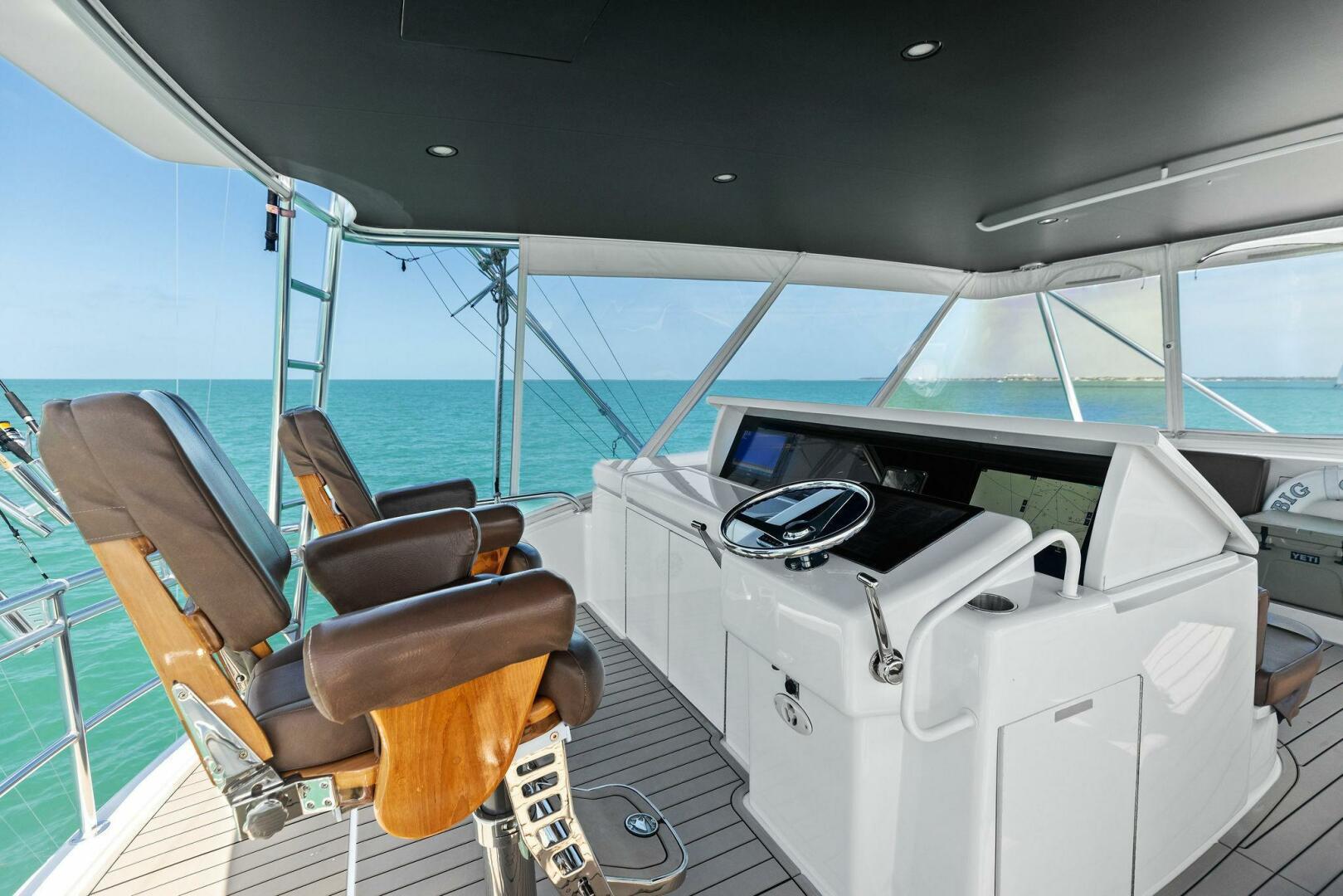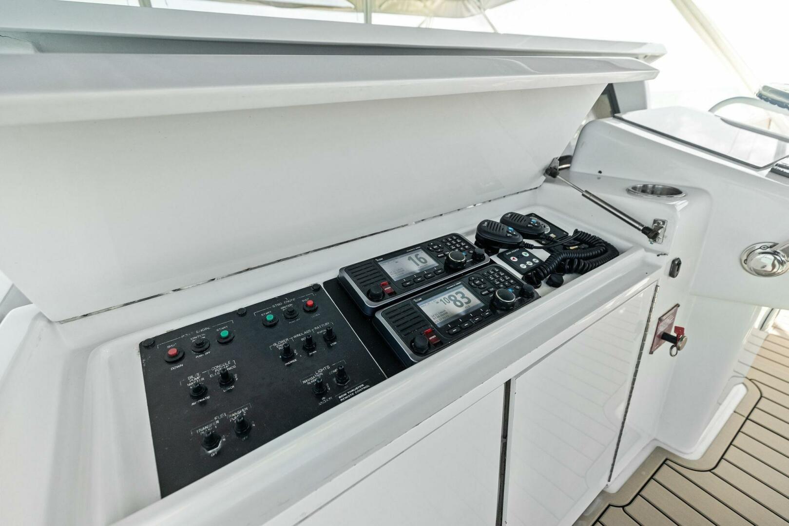 The standard open flybridge arrangement offers wrap-around seating forward of the console along with a deep freeze and insulated chill box. The extended overhang is topped with two Murray Products helm chairs, though there is room (and a backing plate) for an optional third chair. A rear-facing jump seat provides quick access to the cockpit ladder. Hatteras' computer-based touch-screen system monitor is standard, and a generous electronics allowance will easily outfit the power-actuated electronics console. The pod-style helm station includes single-lever controls with emergency backup controls standard. An optional enclosed flybridge arrangement is also available.