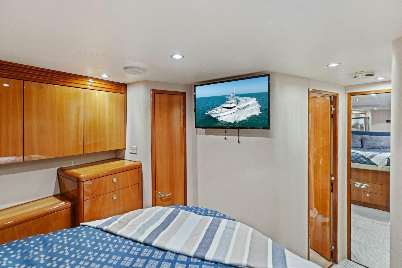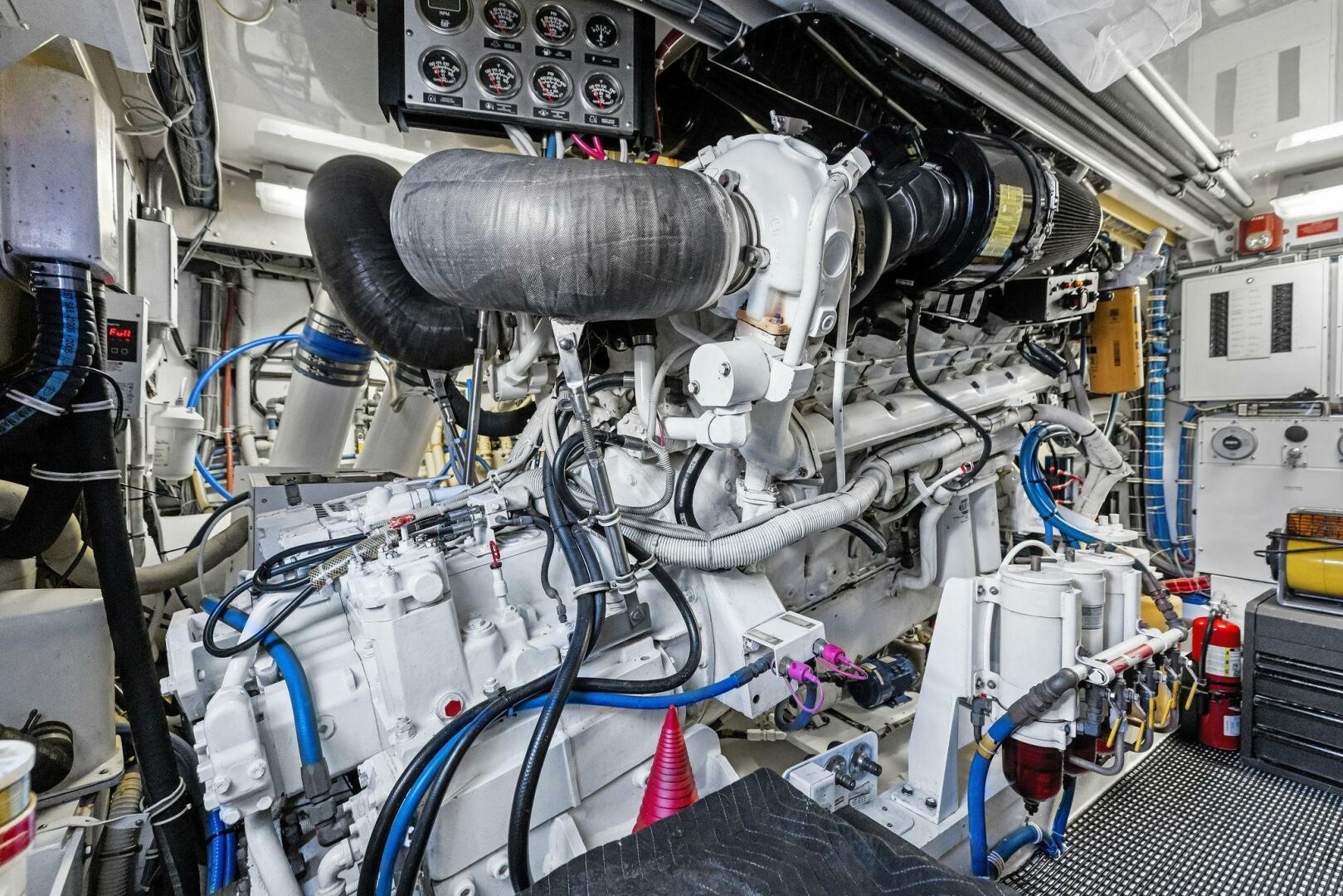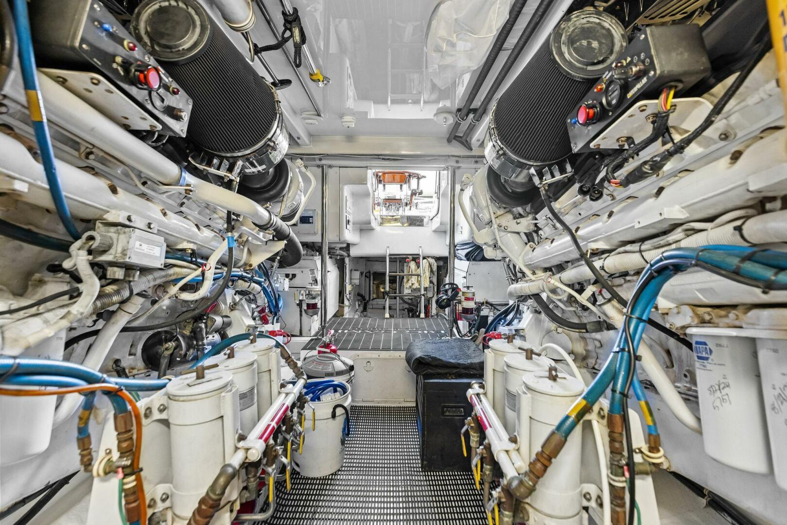 The Hatteras 68 Convertible sports a 192-square-foot cockpit that includes a mezzanine deck for superior seating and amenities. The mezzanine houses double- size bait freezer, insulated storage tubs, tackle drawers, insulated drink storage and more. The mezzanine is designed in modular fashion, which allows each owner to customize the location of various components such as freezer, ice box or optional baitwell. Below the cockpit deck is a large, open lazarette accessible through the engine room hatch. The compartment provides an excellent location for equipment and gear storage, while an aft isolation bulkhead with door allows easy inspection of steering components. The engine room contains no space-stealing air boxes on the hull sides or air-induction vents on the exterior. That's because the 68 features a forced ventilation system that draws air from beneath the cockpit coaming.