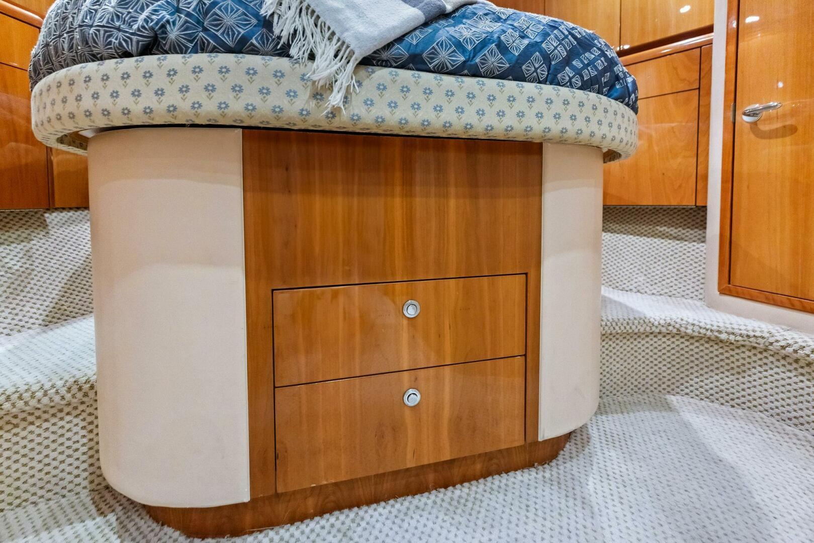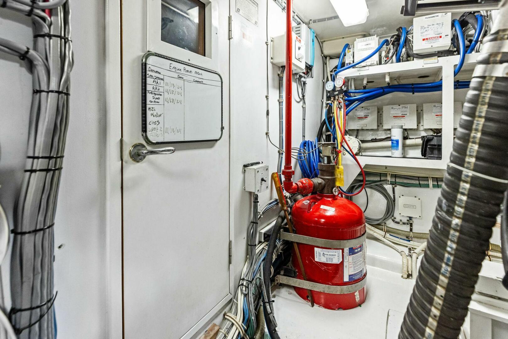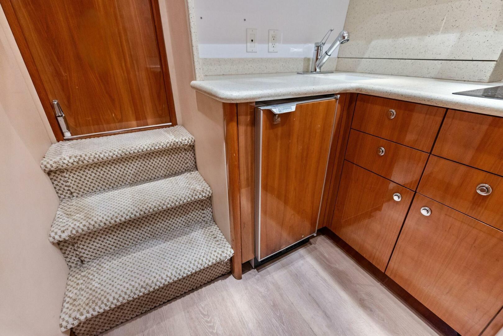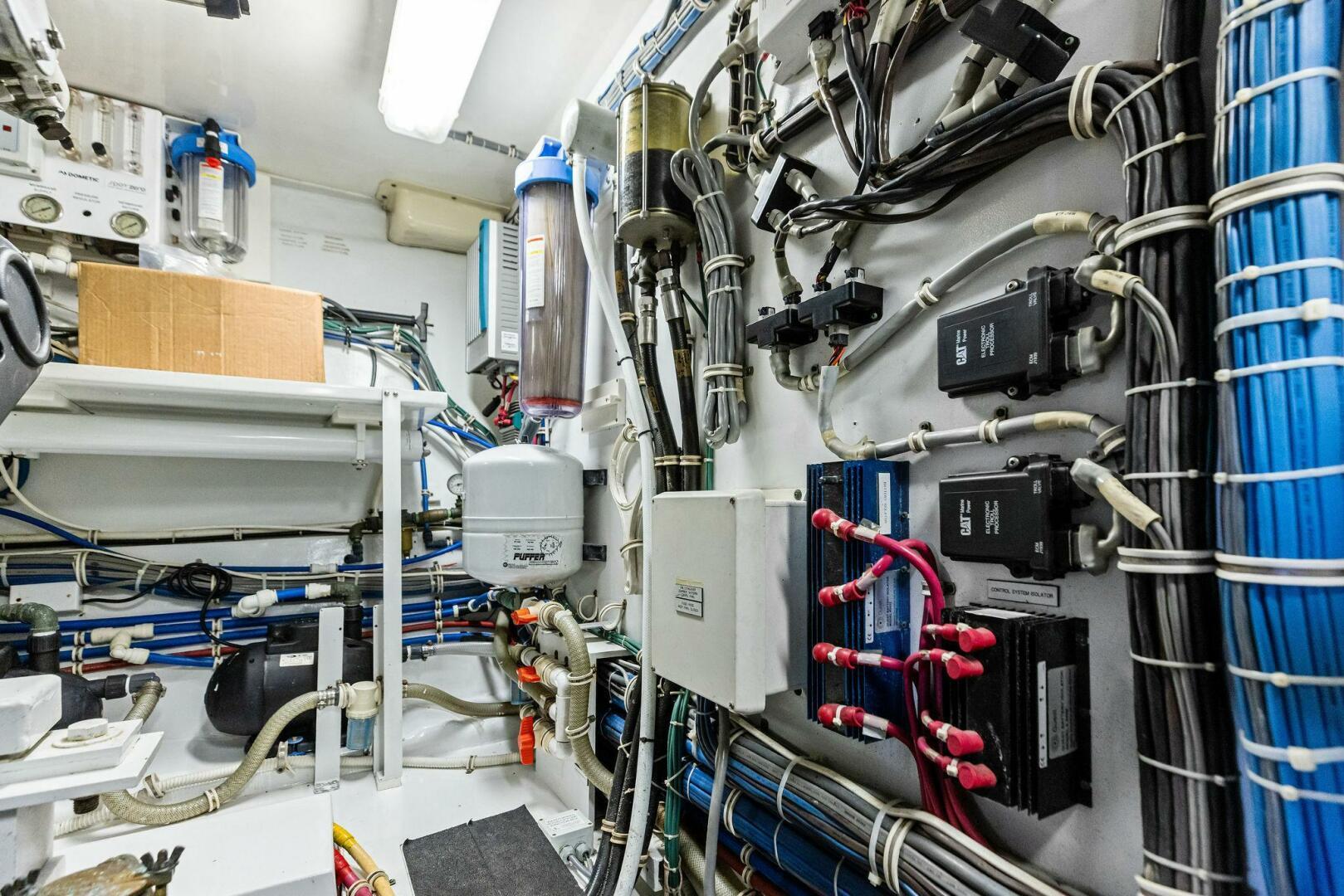 The Hatteras 68 Convertible sports a 192-square-foot cockpit that includes a mezzanine deck for superior seating and amenities. The mezzanine houses double- size bait freezer, insulated storage tubs, tackle drawers, insulated drink storage and more. The mezzanine is designed in modular fashion, which allows each owner to customize the location of various components such as freezer, ice box or optional baitwell. Below the cockpit deck is a large, open lazarette accessible through the engine room hatch. The compartment provides an excellent location for equipment and gear storage, while an aft isolation bulkhead with door allows easy inspection of steering components. The engine room contains no space-stealing air boxes on the hull sides or air-induction vents on the exterior. That's because the 68 features a forced ventilation system that draws air from beneath the cockpit coaming.