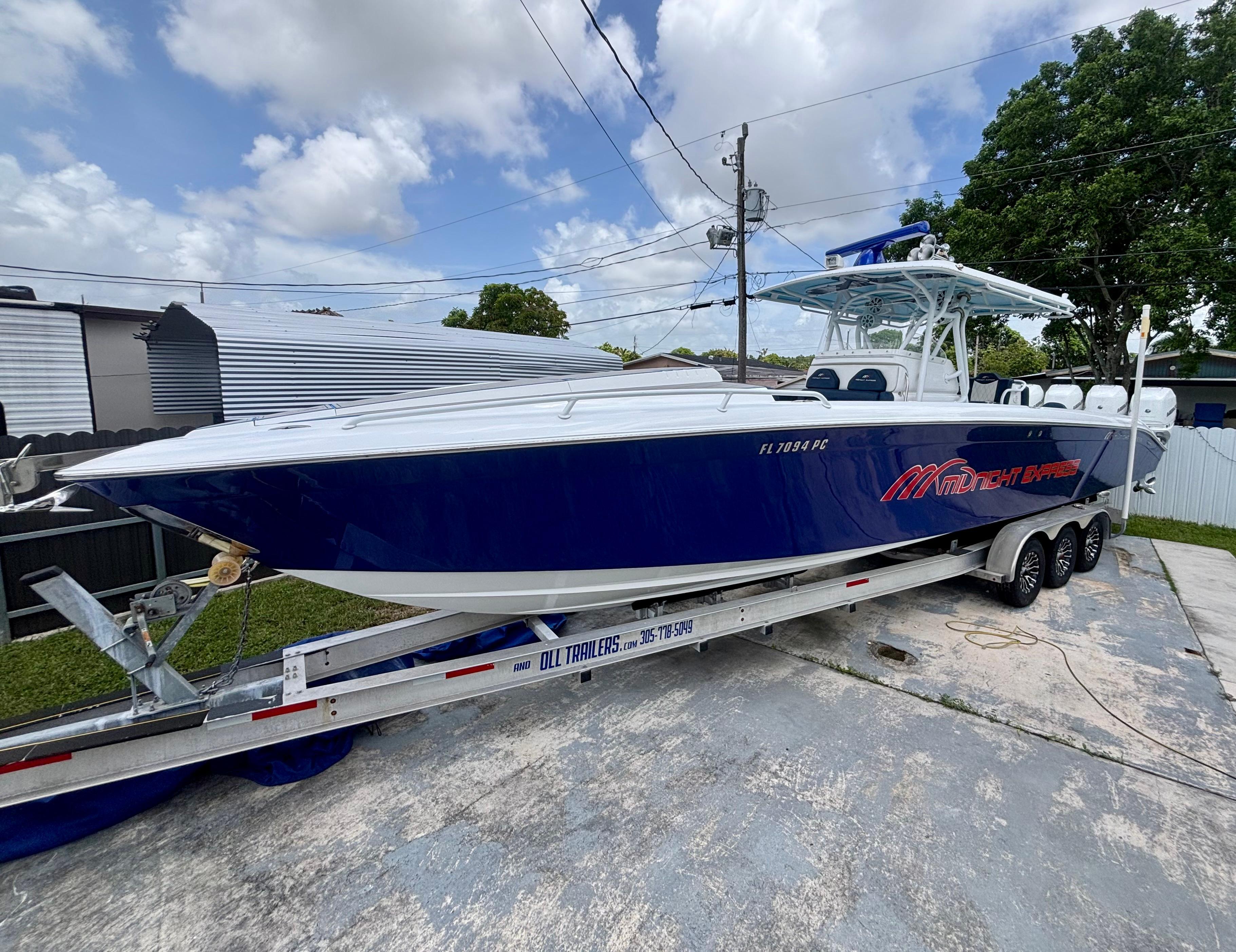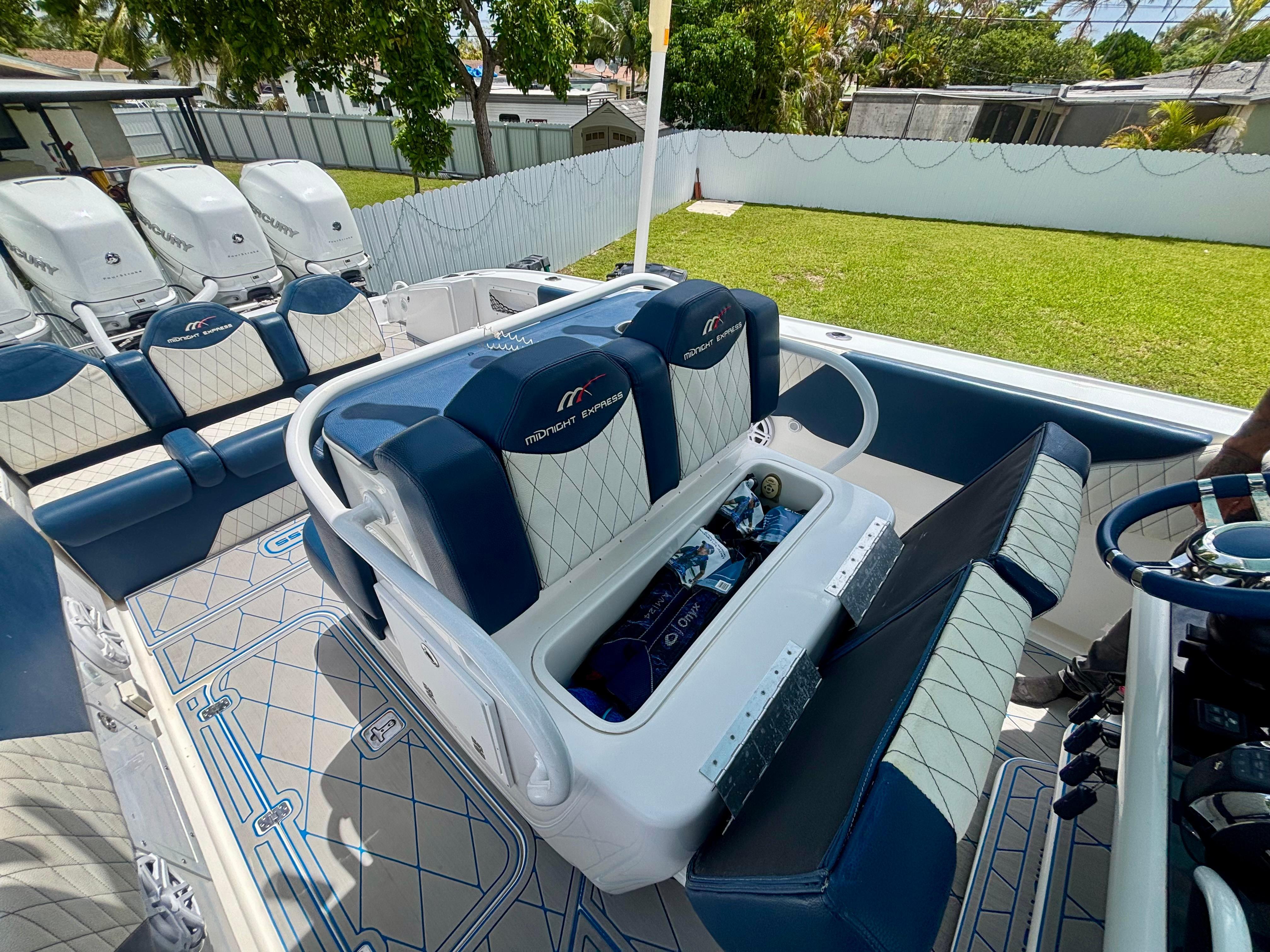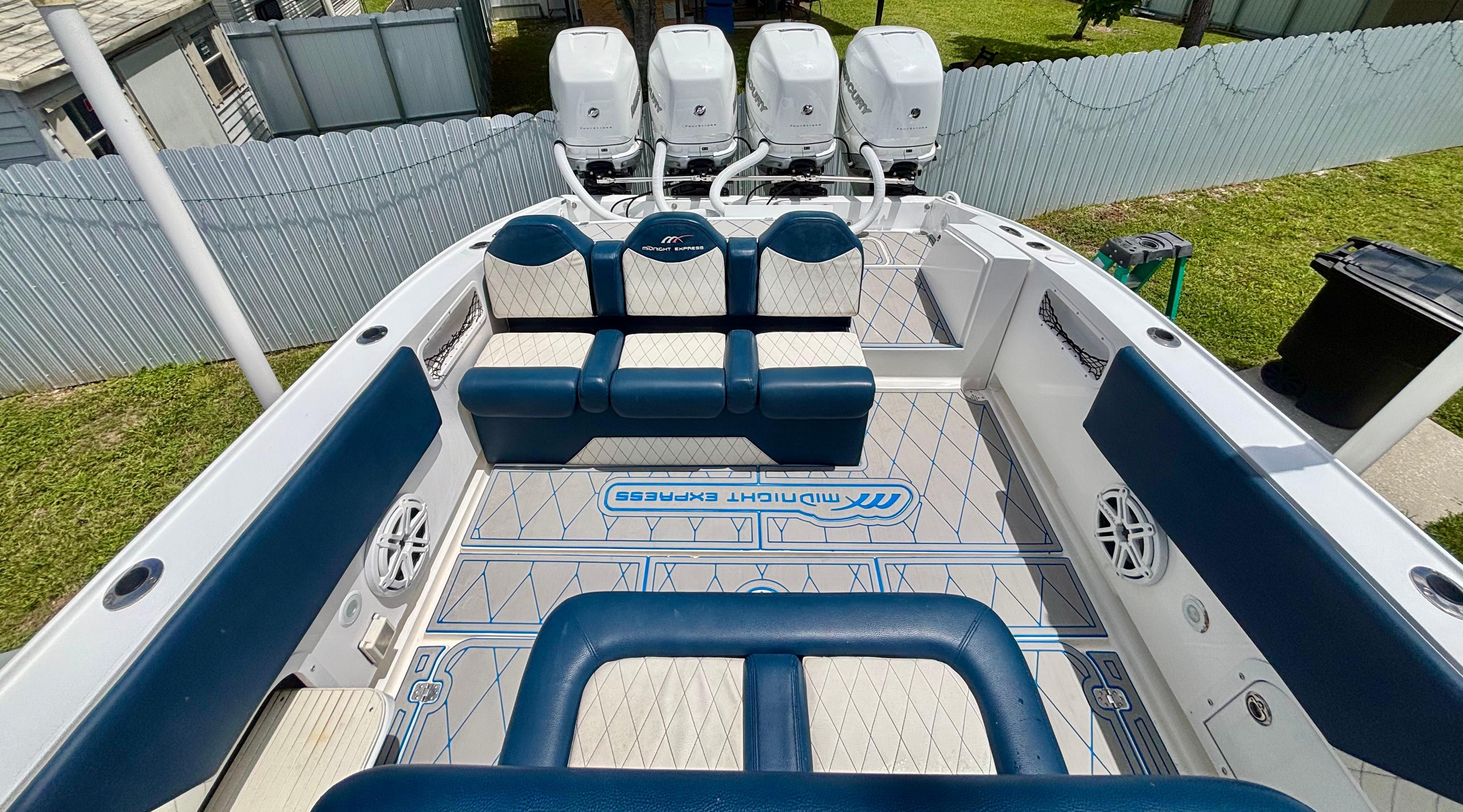 Completely refit in 2021, this 2007 Midnight Express 39 Center Console shines like new with all the upgrades that matter. Fresh paint, new marine decking throughout, modernized wiring and electronics, plus powerful quad Mercury 350 engines with only 30 hours. Midnight Express is renowned for building boats that blend cutting-edge technology with rugged durability and sleek style — making this 39-footer a rare chance to own a premium offshore machine that’s turnkey, meticulously cared for, and ready to take on any adventure.Power & PerformanceQuad Mercury 350sMercury Digital Throttle & Shift Integrated engine data via GarminHelm & ElectronicsDual Garmin GPSMAP touchscreen multifunction displaysGarmin open-array radar (custom-painted blue dome)Garmin VHF marine radioACR URP-102 Point Pad spotlight controlTrim tabs with LED indicatorsCustom Midnight Express switch panel with backlightingJL Audio amplifier housed in forward console bayCustom blue & white steering wheelFeatures & LayoutFull JL Audio sound system with tower speakers and subwoofersBluetooth marine stereo with helm accessLED cockpit, accent, and underwater lightingSpreader lights integrated into the hardtopFlush-mounted deck switches, battery selectors, and breaker panelsBattery ChargerTriple helm bolsters with diamond-stitched upholsteryForward console loungeTransom jump seatsWide walkaround layout with deep gunnels and toe railsDual-tone marine decking with blue accents throughoutOversized hardtop with powder-coated frame and custom-painted blue undersideLarge in-deck storage lockersAft livewellForward anchor locker with stainless chute (windlass-ready)Under-helm tackle drawers and rigging accessFold-down swim ladderStainless cleats, rod holders, grab rails, and cup holders throughout