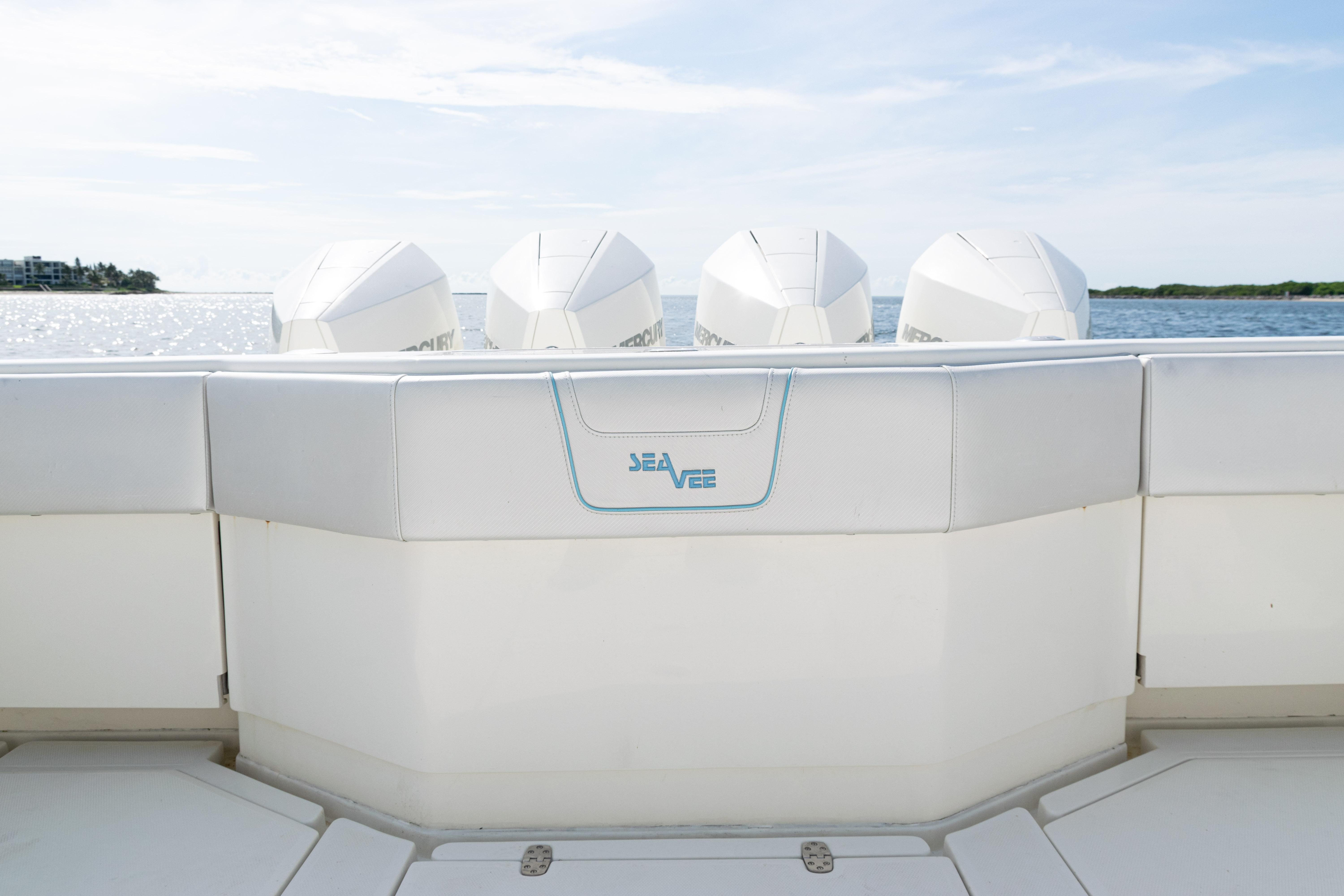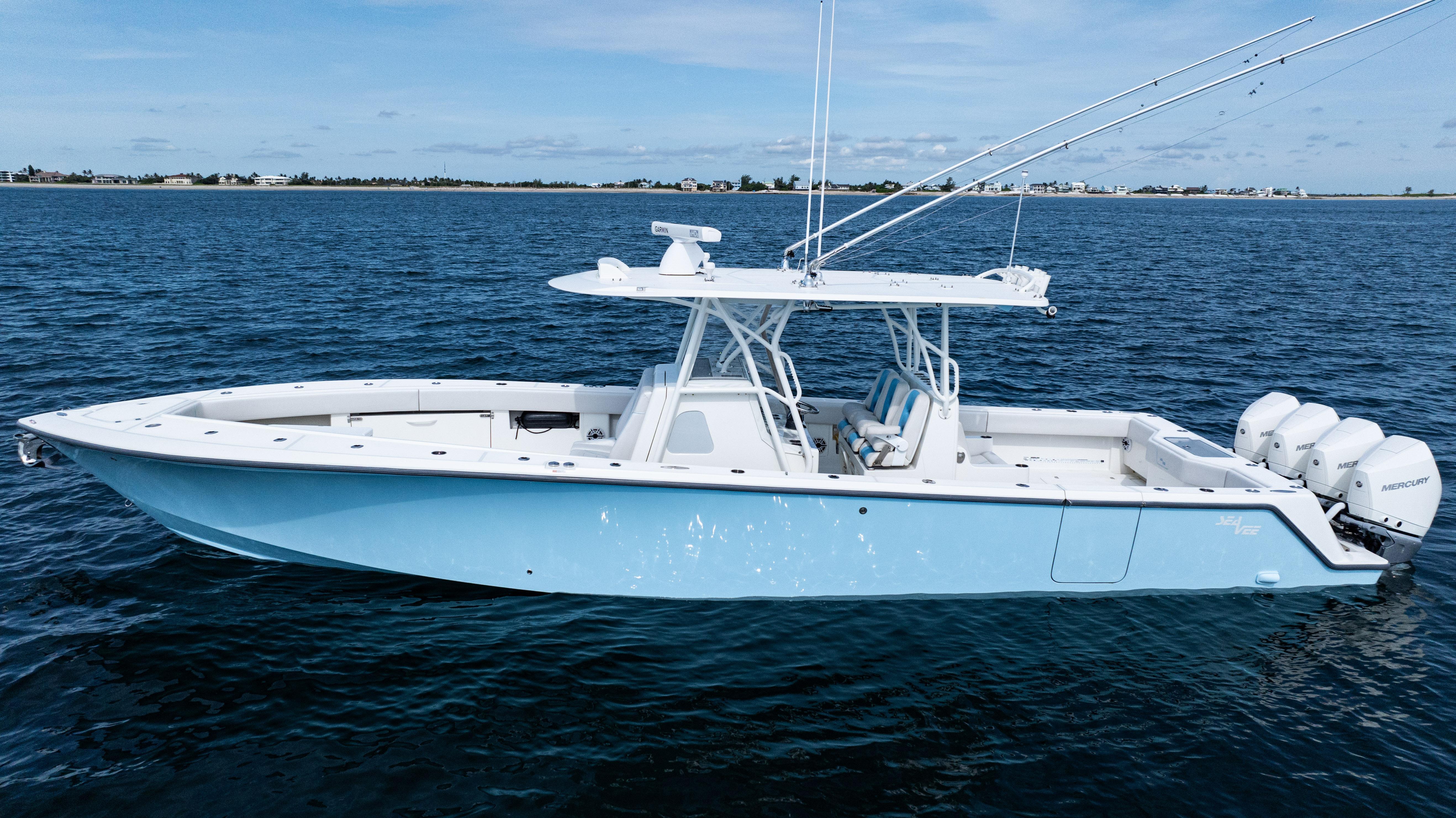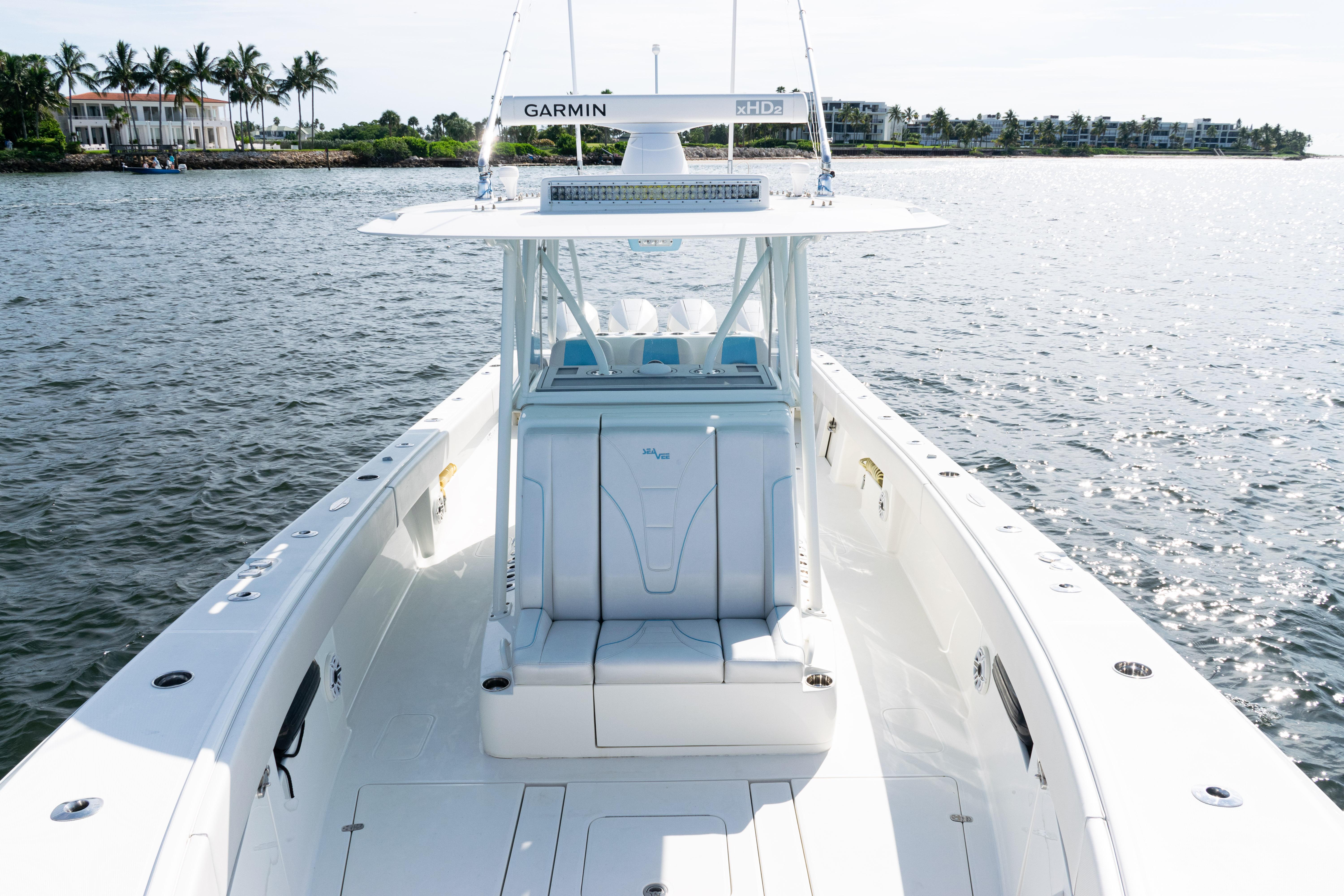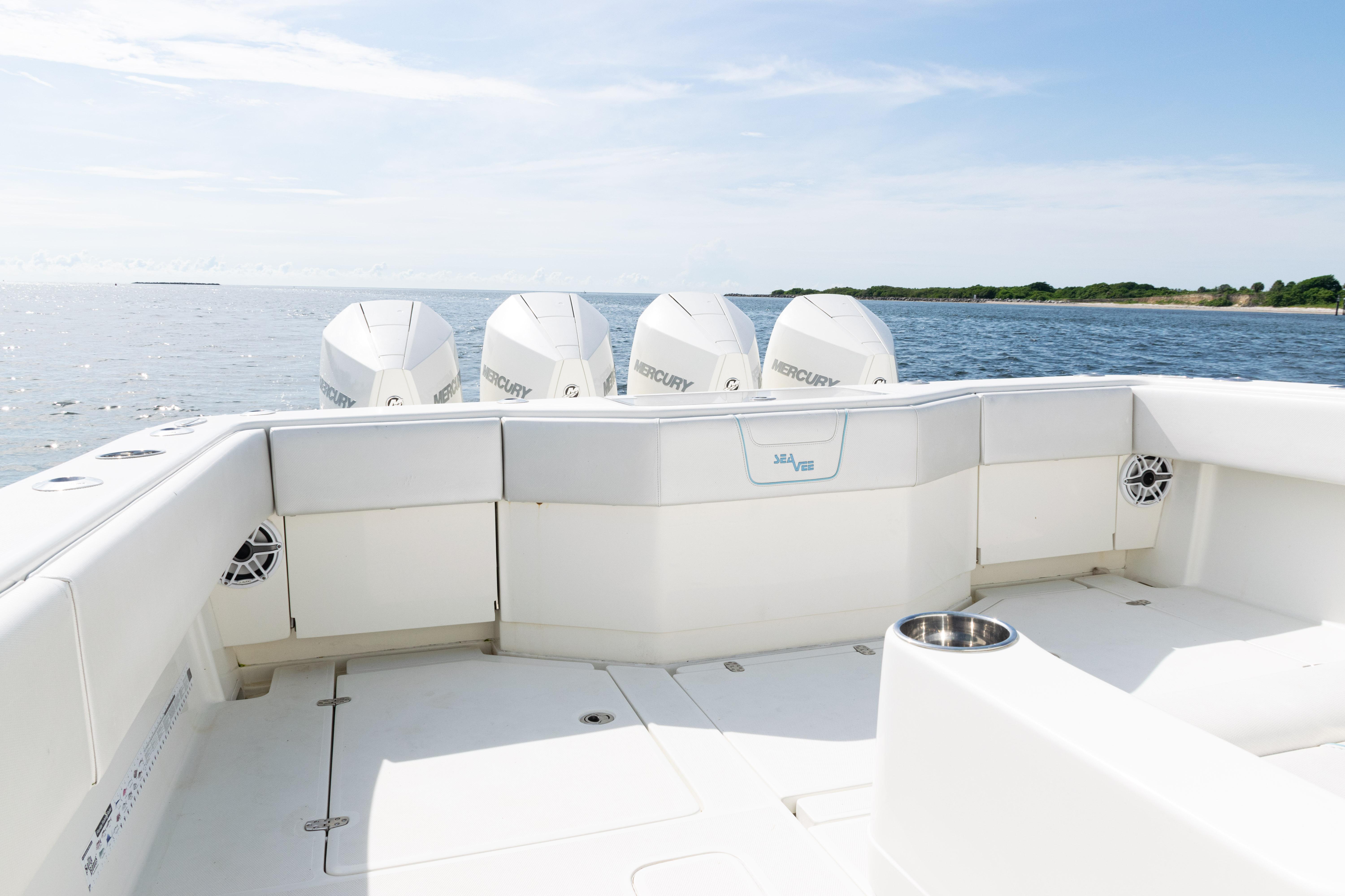 2021 SeaVee 390B – Quad Mercury Power – Lift KeptThis 2021 SeaVee 390B is a highly customized, lift-kept center console built for the serious angler who demands performance, reliability, and comfort. Powered by quad Warm White Fusion Mercury engines, this boat delivers speed and efficiency while offering an incredible array of features for both offshore fishing and luxury cruising. Every detail has been carefully spec’d — from upgraded Garmin electronics and JL Audio sound to custom baitwell systems, dive door, and premium seating.Highlights2021 SeaVee 390B – Lift KeptQuad Warm White Fusion Mercury EnginesCustom Hull Color: Entire Hull Light Blue with matching Hardtop UndersideOversized Powder-Coated T-Top with aft sun-shade, 6 rod holders, molded spreader lights & multicolor LED lightingBow Thruster for precise handlingFully loaded Garmin electronics package with dual 22" displays, radar, autopilot, CHIRP transducer & AISDeluxe Triple Helm Chairs with tackle station + rear-facing mezzanine seat w/ cooler & storageSea Chest Baitwell System with triple 1500 GPH pumps, forward baitwell & extensive rod holder setupJL Audio Premium Sound System with subs, amps, molded pods & Fusion Apollo MS-RA770 head unitCustom SeaVee Dive Door with integrated ladderEZ Anchor Puller Rebel 5 Winch with upgraded rode packageUnderwater Lights, Under-Gunnel Lighting, and Spot Trace GPS Security SystemDeck & SeatingTriple helm chair tackle station with power slidesDeluxe rear-facing mezzanine seat with cooler & tackle storageFold-out aft jump seats (Port & Starboard)Integrated forward seating with optional removable backrests & armrestsCoaming bolsters throughoutFishing EquipmentCustom SS Sea Chest Baitwell System – three 1500 GPH pumpsAdditional forward baitwellSliding door console rod holder + kingfish rod holders (set of 2)15° gunnel-mounted rod holders plus 4 swivel rod holders for electric reels4 electric reel 30A outlets with covers & breakersDual manual pancake teaser reels (anodized aluminum)Tilt shotgun rod holder on hardtop (custom)Rigged outriggers to customer spec (Taco Grand Slam 390 bases, 18’ telescoping poles)Washdowns & PlumbingFreshwater washdown with hose, nozzle & console sink/showerAdditional pull-out freshwater shower headFreshwater washdown in windlass compartmentSaltwater washdown with coiled hose (forward shelf)Manual freshwater flush for outboardsElectric head with holding tank & maceratorFishbox pump-out strainer system (dual box) with Y-valveElectronics & Navigation(2) Garmin 8622 GPS 22” displays with card readerGarmin 1204 X HD Open Array Radar (12kW, 4’)Garmin GSD-26 Network Sounder ModuleGarmin GHC-20 Autopilot with shadow drive & pumpGarmin GXM54 Marine Weather/Audio Satellite ReceiverGarmin AIS 800 Transmit/ReceiveGarmin GMS-10 Port ExpanderSimrad B275LHW 1kW CHIRP Thru-Hull TransducerICOM M400BB VHF Radio with 8’ antenna & mountPoly-Planar external VHF speakerSpot Trace GPS Security SystemLighting & ComfortUnder-gunnel lighting (blue)(3) Lumitec SeaBlaze X2 underwater lights (white/blue)Rigid Marine 30” LED Light Bar (fiberglass molded cover)Oversized hardtop with molded speaker pod and integrated JL speakersSeadek organizer (light grey)Audio & EntertainmentJL Audio M6 system:(3) pairs 7.7” coaxial(1) pair 8.8” coaxial(1) pair 10” subsJL Audio 400w, 600w, and 800w amplifiersFusion Apollo MS-RA770 entertainment system w/ AM/FM antennaElectrical & PowerQuad engine battery charger w/ galvanic isolator, 30A inlet, triple bank w/ echo chargeAdditional AGM batteryDual USB charger socketsOther NotablesCustom cutting board for transom rod holdersKing board dividers for rod storageCustom tackle storage + removable trash bin in leaning postPull-out divider for forward fishboxAft-facing Garmin VIRB cameraThis lift-kept 2021 SeaVee 390B is turnkey, tournament-ready, and built to the highest standards. It represents an incredible opportunity to own a fully loaded 39’ center console without the wait.