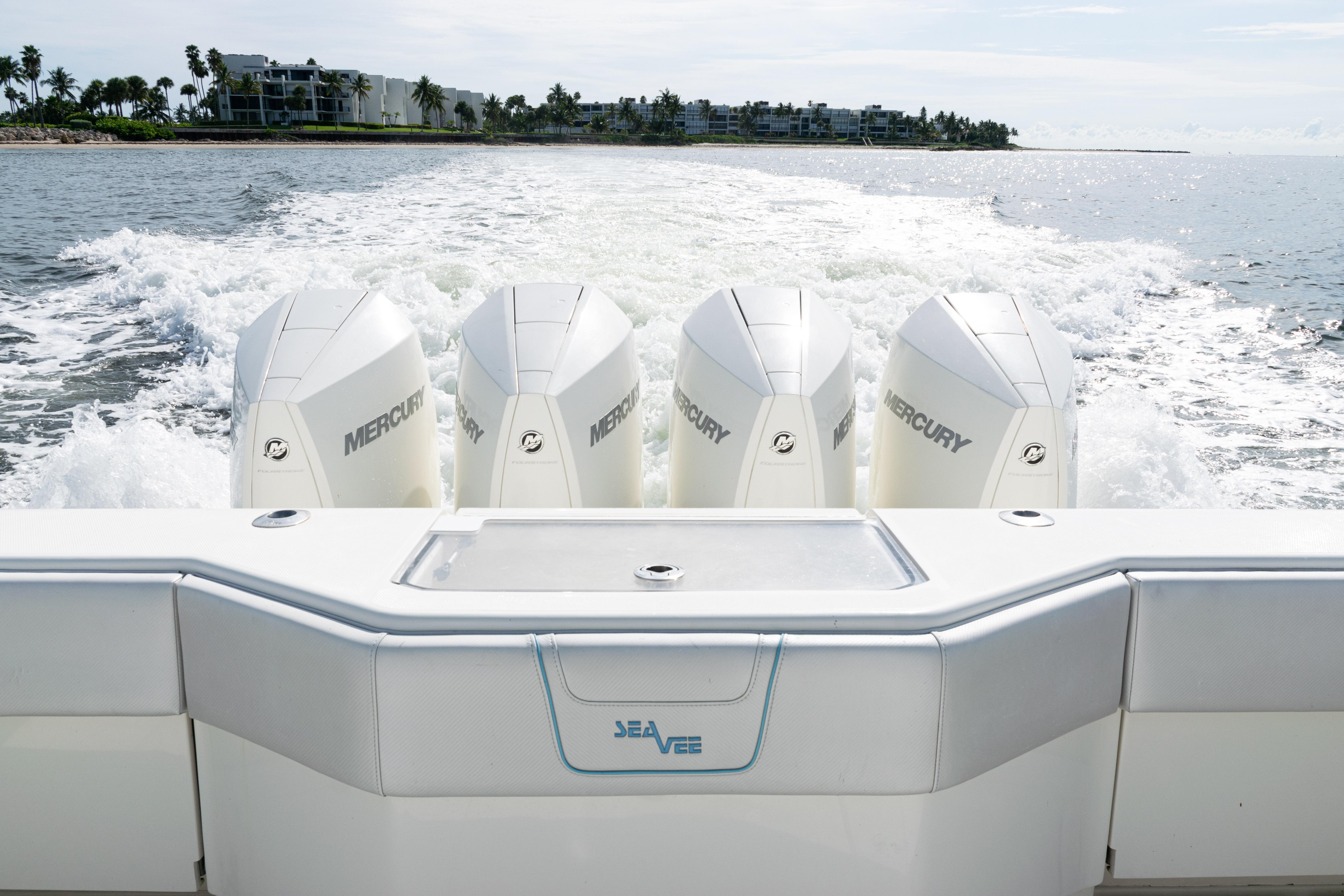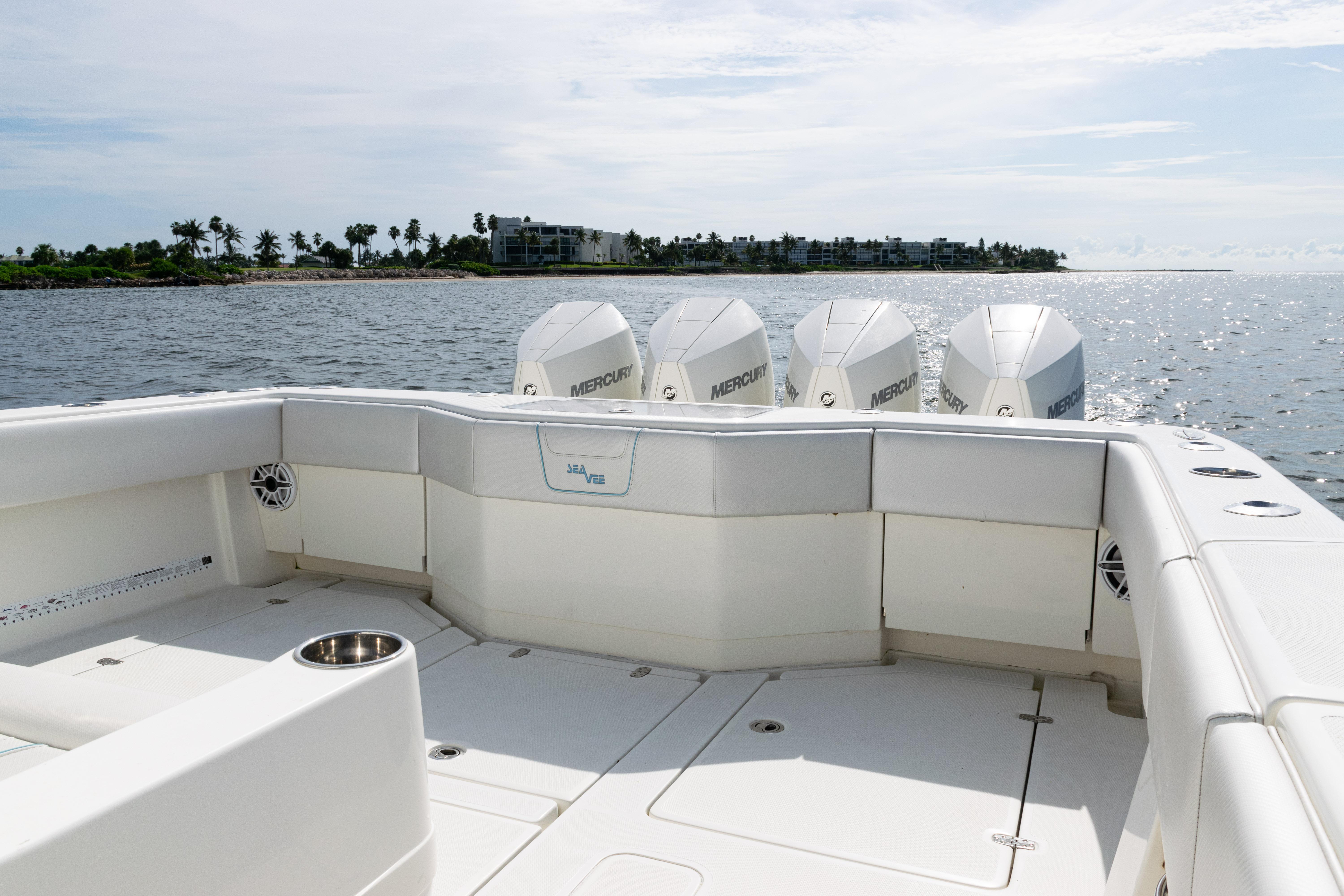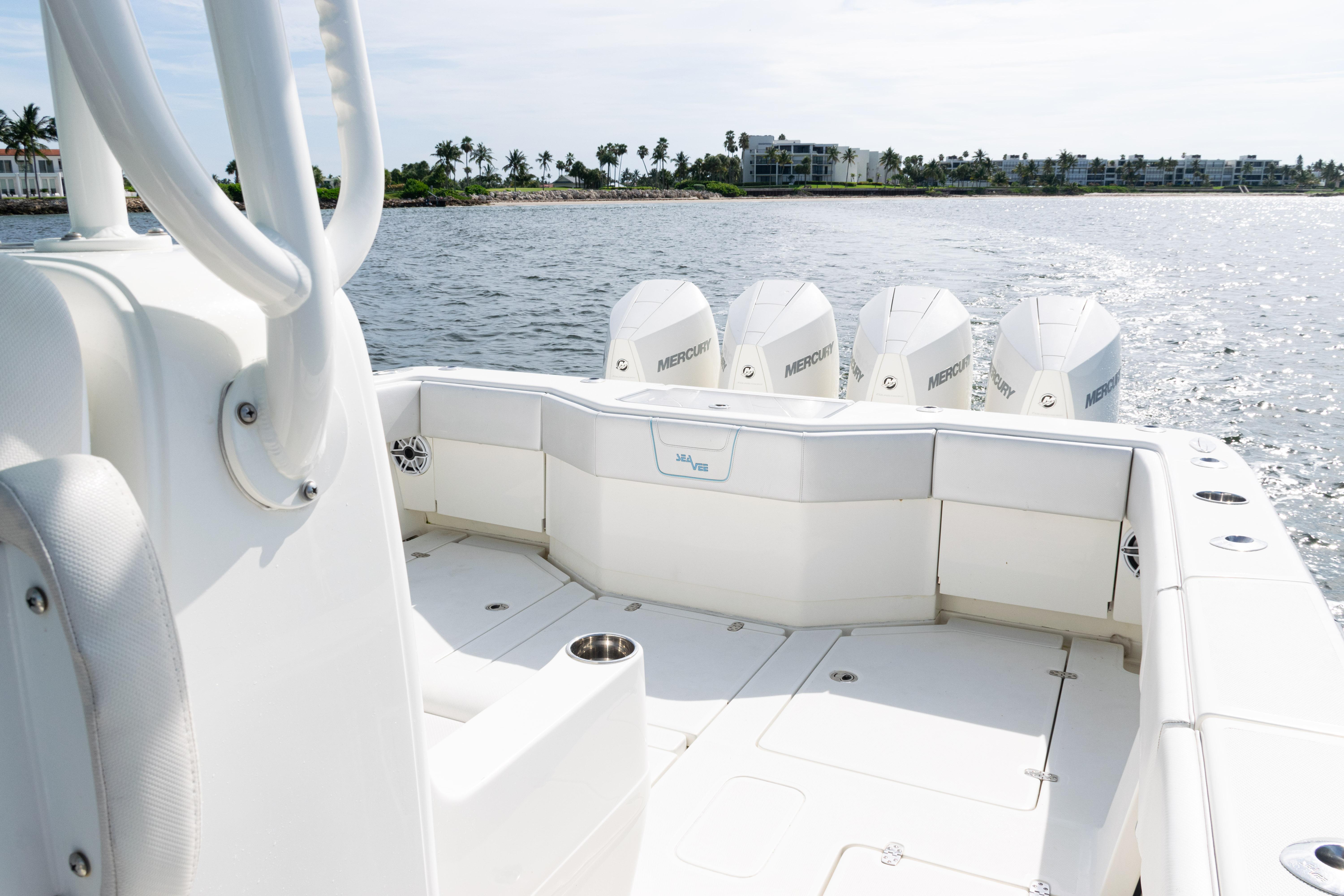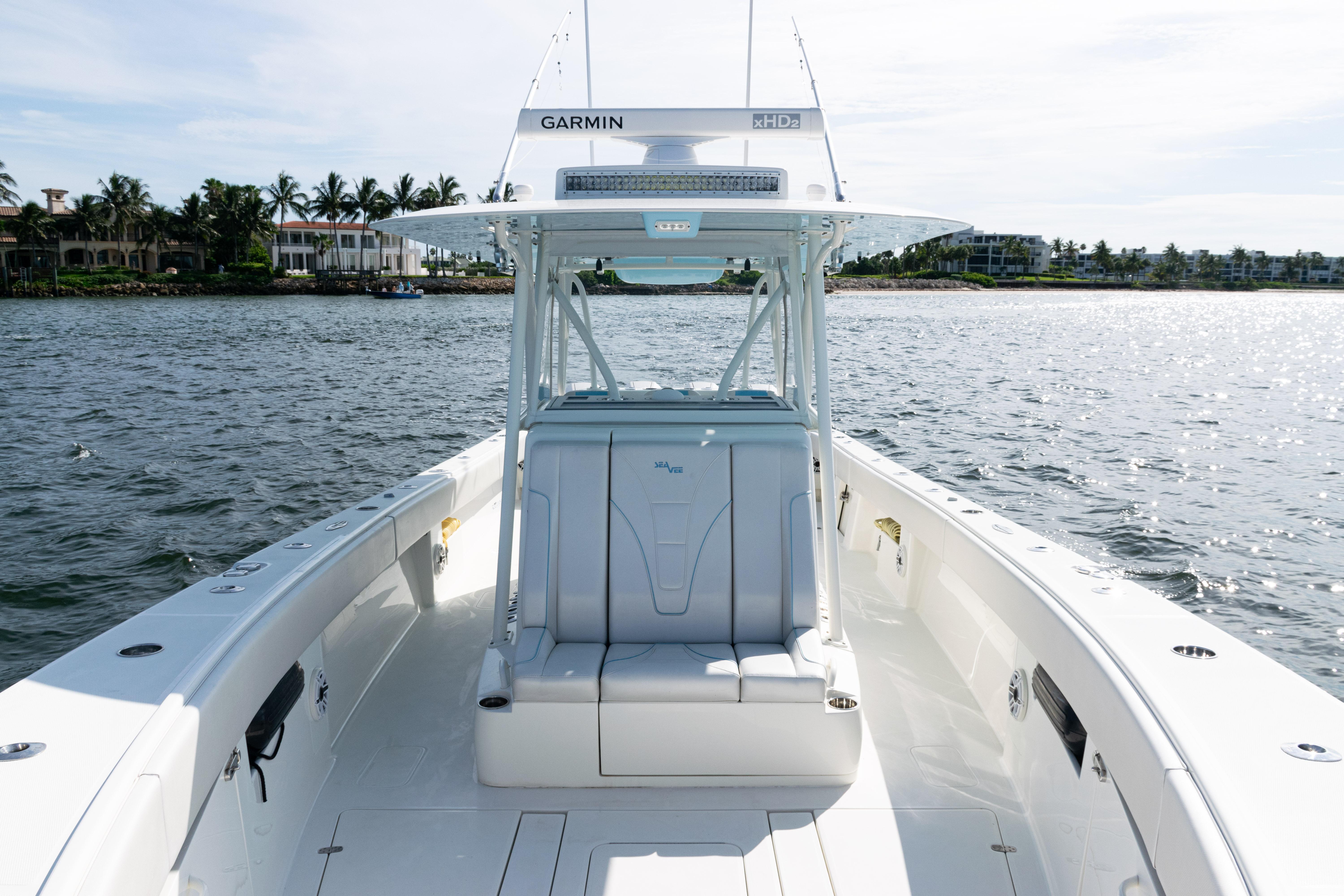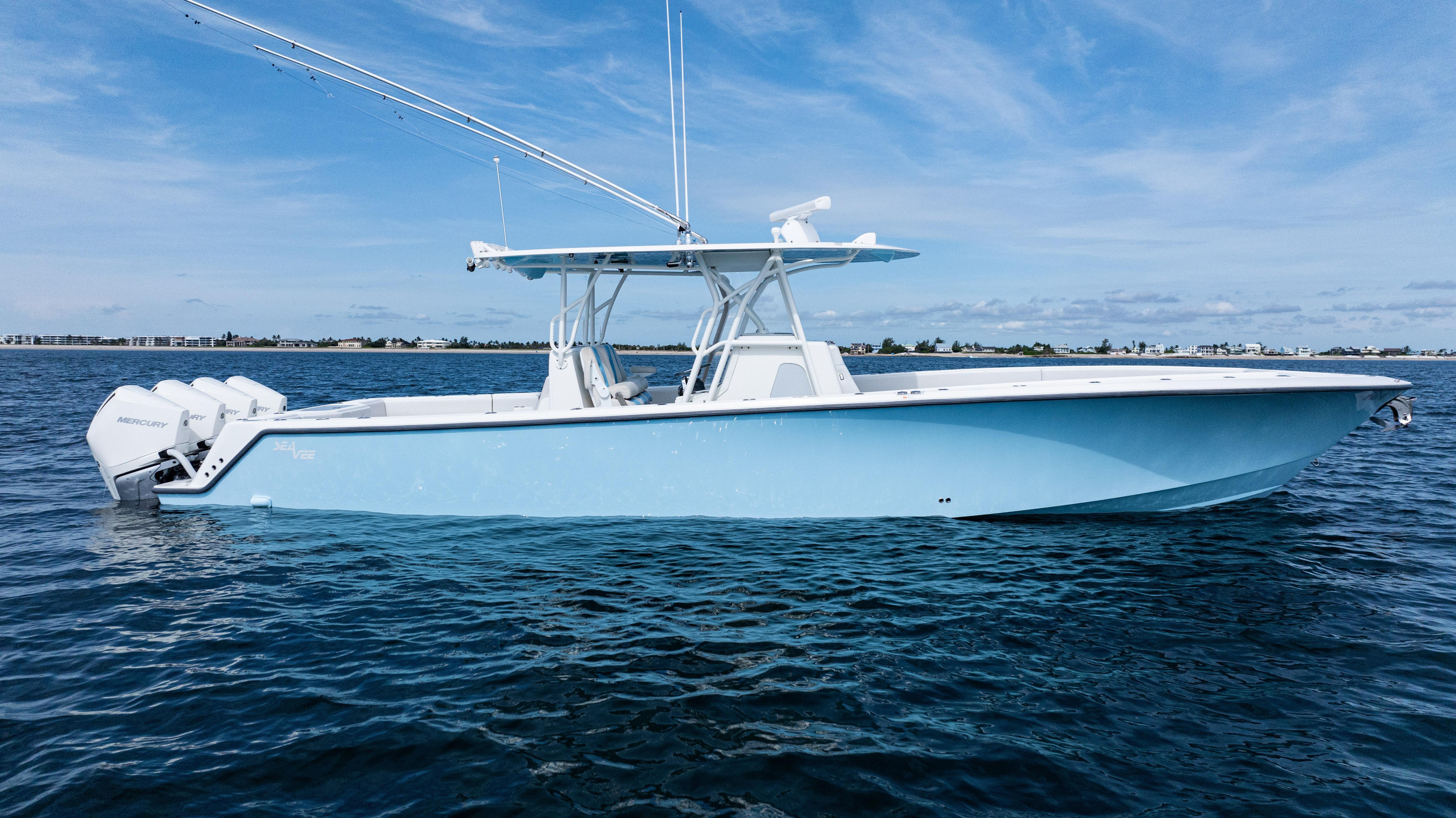 2021 SeaVee 390B – Quad Mercury Power – Lift KeptThis 2021 SeaVee 390B is a highly customized, lift-kept center console built for the serious angler who demands performance, reliability, and comfort. Powered by quad Warm White Fusion Mercury engines, this boat delivers speed and efficiency while offering an incredible array of features for both offshore fishing and luxury cruising. Every detail has been carefully spec’d — from upgraded Garmin electronics and JL Audio sound to custom baitwell systems, dive door, and premium seating.Highlights2021 SeaVee 390B – Lift KeptQuad Warm White Fusion Mercury EnginesCustom Hull Color: Entire Hull Light Blue with matching Hardtop UndersideOversized Powder-Coated T-Top with aft sun-shade, 6 rod holders, molded spreader lights & multicolor LED lightingBow Thruster for precise handlingFully loaded Garmin electronics package with dual 22" displays, radar, autopilot, CHIRP transducer & AISDeluxe Triple Helm Chairs with tackle station + rear-facing mezzanine seat w/ cooler & storageSea Chest Baitwell System with triple 1500 GPH pumps, forward baitwell & extensive rod holder setupJL Audio Premium Sound System with subs, amps, molded pods & Fusion Apollo MS-RA770 head unitCustom SeaVee Dive Door with integrated ladderEZ Anchor Puller Rebel 5 Winch with upgraded rode packageUnderwater Lights, Under-Gunnel Lighting, and Spot Trace GPS Security SystemDeck & SeatingTriple helm chair tackle station with power slidesDeluxe rear-facing mezzanine seat with cooler & tackle storageFold-out aft jump seats (Port & Starboard)Integrated forward seating with optional removable backrests & armrestsCoaming bolsters throughoutFishing EquipmentCustom SS Sea Chest Baitwell System – three 1500 GPH pumpsAdditional forward baitwellSliding door console rod holder + kingfish rod holders (set of 2)15° gunnel-mounted rod holders plus 4 swivel rod holders for electric reels4 electric reel 30A outlets with covers & breakersDual manual pancake teaser reels (anodized aluminum)Tilt shotgun rod holder on hardtop (custom)Rigged outriggers to customer spec (Taco Grand Slam 390 bases, 18’ telescoping poles)Washdowns & PlumbingFreshwater washdown with hose, nozzle & console sink/showerAdditional pull-out freshwater shower headFreshwater washdown in windlass compartmentSaltwater washdown with coiled hose (forward shelf)Manual freshwater flush for outboardsElectric head with holding tank & maceratorFishbox pump-out strainer system (dual box) with Y-valveElectronics & Navigation(2) Garmin 8622 GPS 22” displays with card readerGarmin 1204 X HD Open Array Radar (12kW, 4’)Garmin GSD-26 Network Sounder ModuleGarmin GHC-20 Autopilot with shadow drive & pumpGarmin GXM54 Marine Weather/Audio Satellite ReceiverGarmin AIS 800 Transmit/ReceiveGarmin GMS-10 Port ExpanderSimrad B275LHW 1kW CHIRP Thru-Hull TransducerICOM M400BB VHF Radio with 8’ antenna & mountPoly-Planar external VHF speakerSpot Trace GPS Security SystemLighting & ComfortUnder-gunnel lighting (blue)(3) Lumitec SeaBlaze X2 underwater lights (white/blue)Rigid Marine 30” LED Light Bar (fiberglass molded cover)Oversized hardtop with molded speaker pod and integrated JL speakersSeadek organizer (light grey)Audio & EntertainmentJL Audio M6 system:(3) pairs 7.7” coaxial(1) pair 8.8” coaxial(1) pair 10” subsJL Audio 400w, 600w, and 800w amplifiersFusion Apollo MS-RA770 entertainment system w/ AM/FM antennaElectrical & PowerQuad engine battery charger w/ galvanic isolator, 30A inlet, triple bank w/ echo chargeAdditional AGM batteryDual USB charger socketsOther NotablesCustom cutting board for transom rod holdersKing board dividers for rod storageCustom tackle storage + removable trash bin in leaning postPull-out divider for forward fishboxAft-facing Garmin VIRB cameraThis lift-kept 2021 SeaVee 390B is turnkey, tournament-ready, and built to the highest standards. It represents an incredible opportunity to own a fully loaded 39’ center console without the wait.