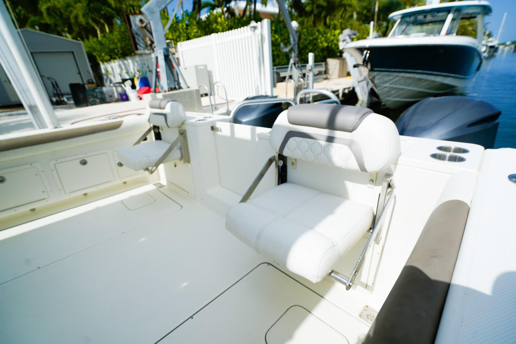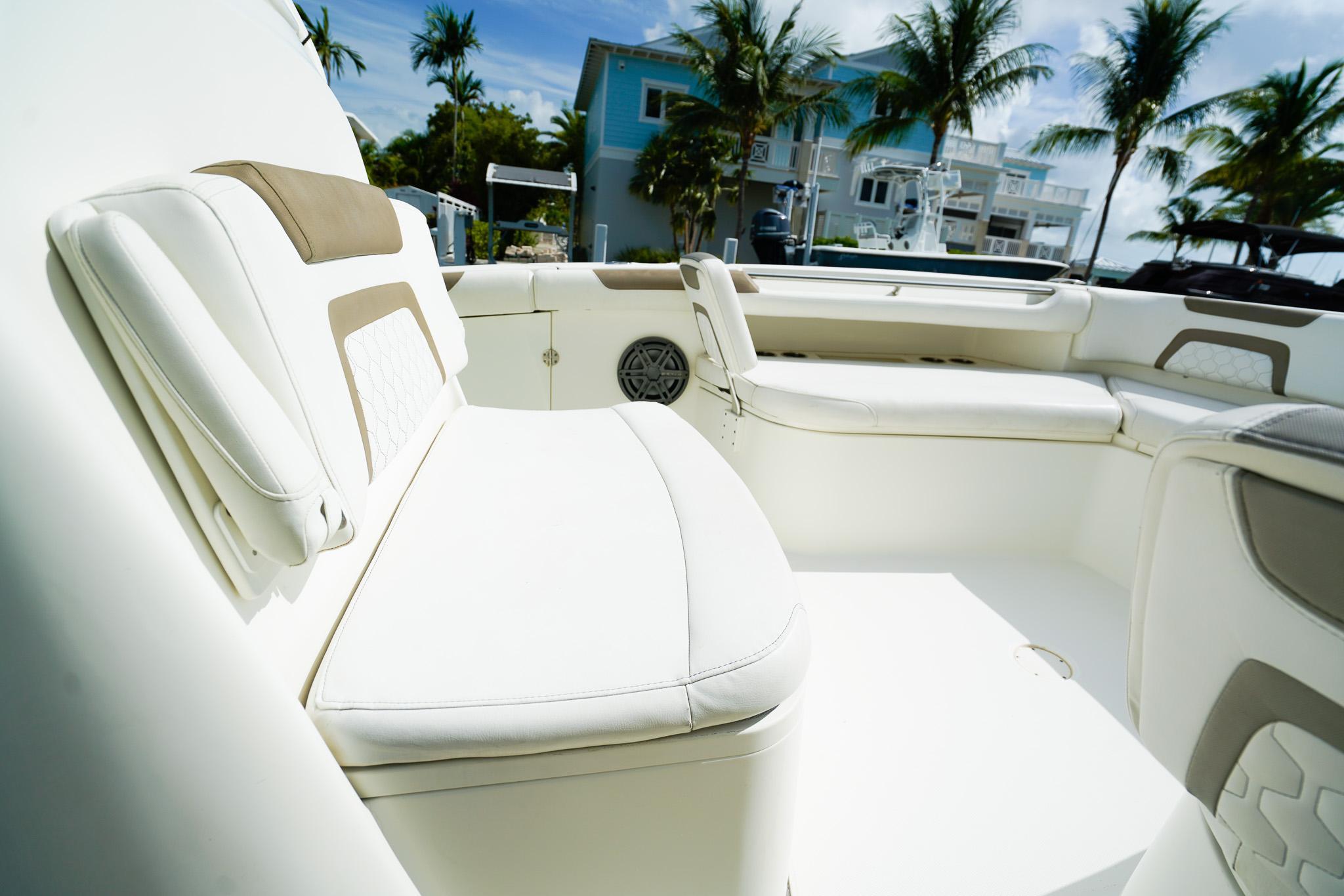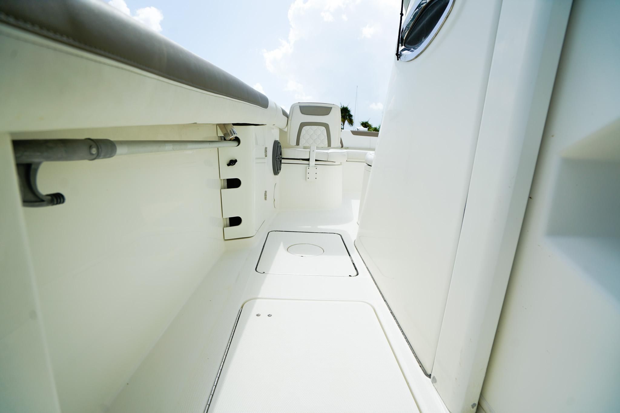 - Insulated 225-quart port and starboard storage compartments in seats with overboard drains for use as fish boxes, coolers or dry storage