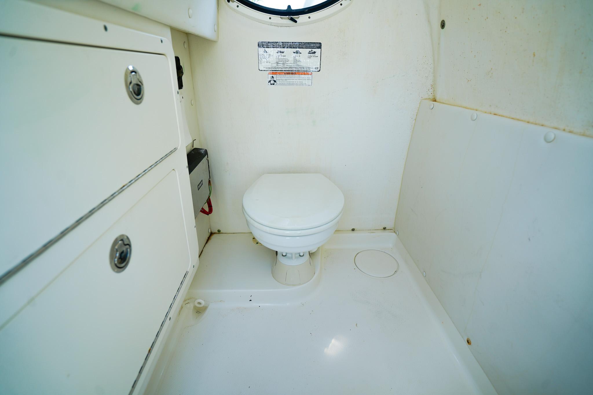 - Electric marine head under console with 15-gallon holding tank and overboard discharge