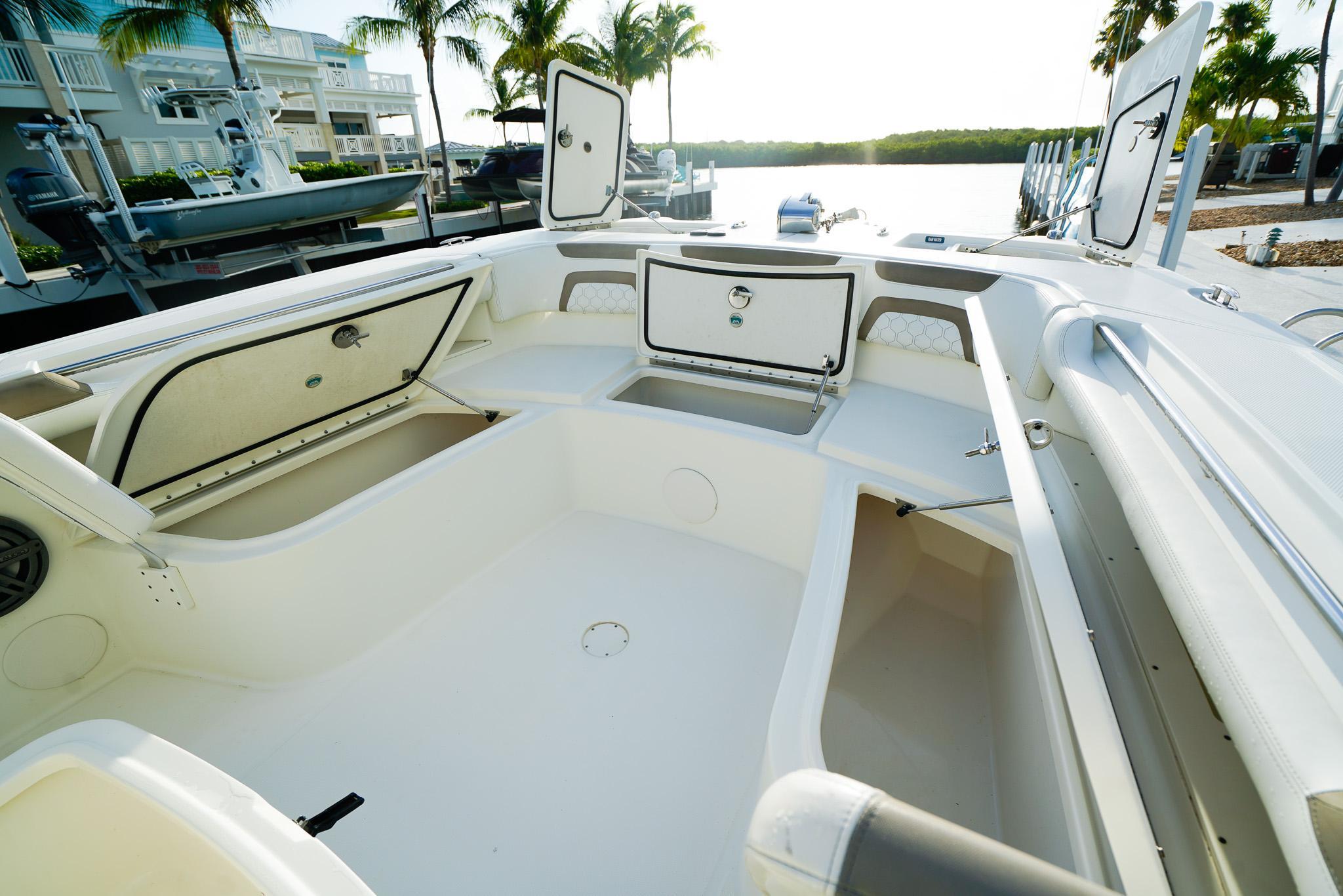 - Insulated 300-quart port and starboard in-deck fish boxes with diaphragm pumps