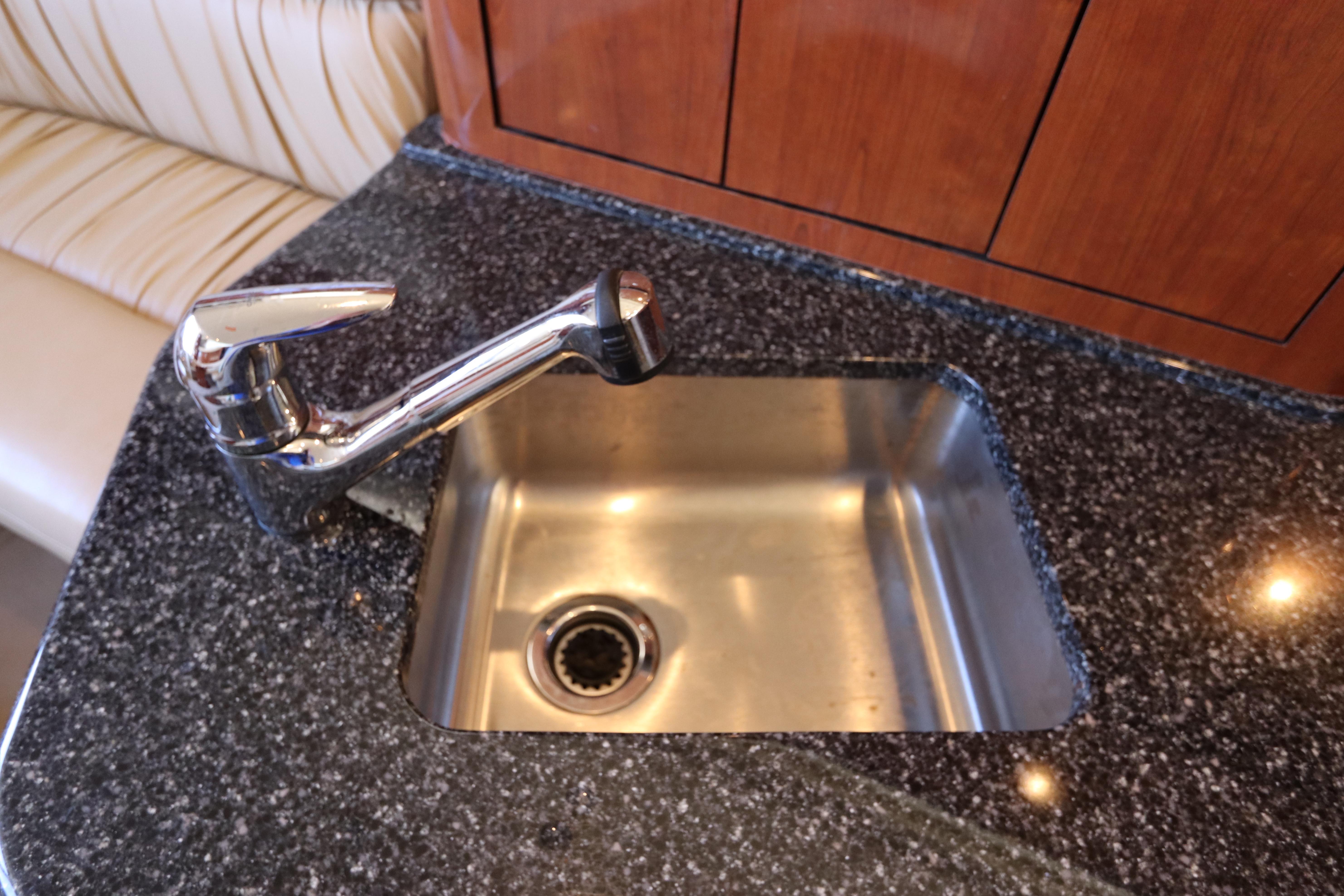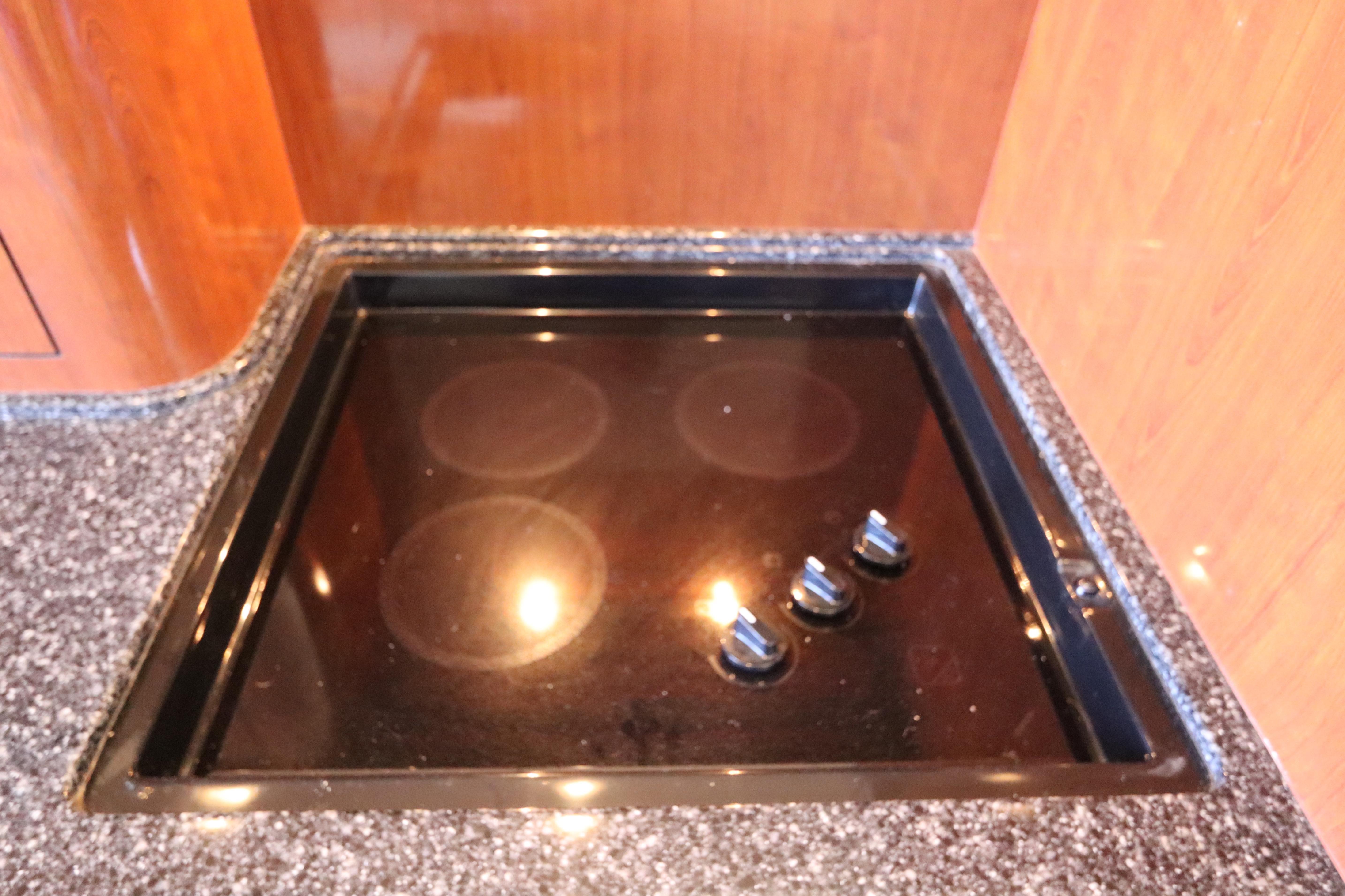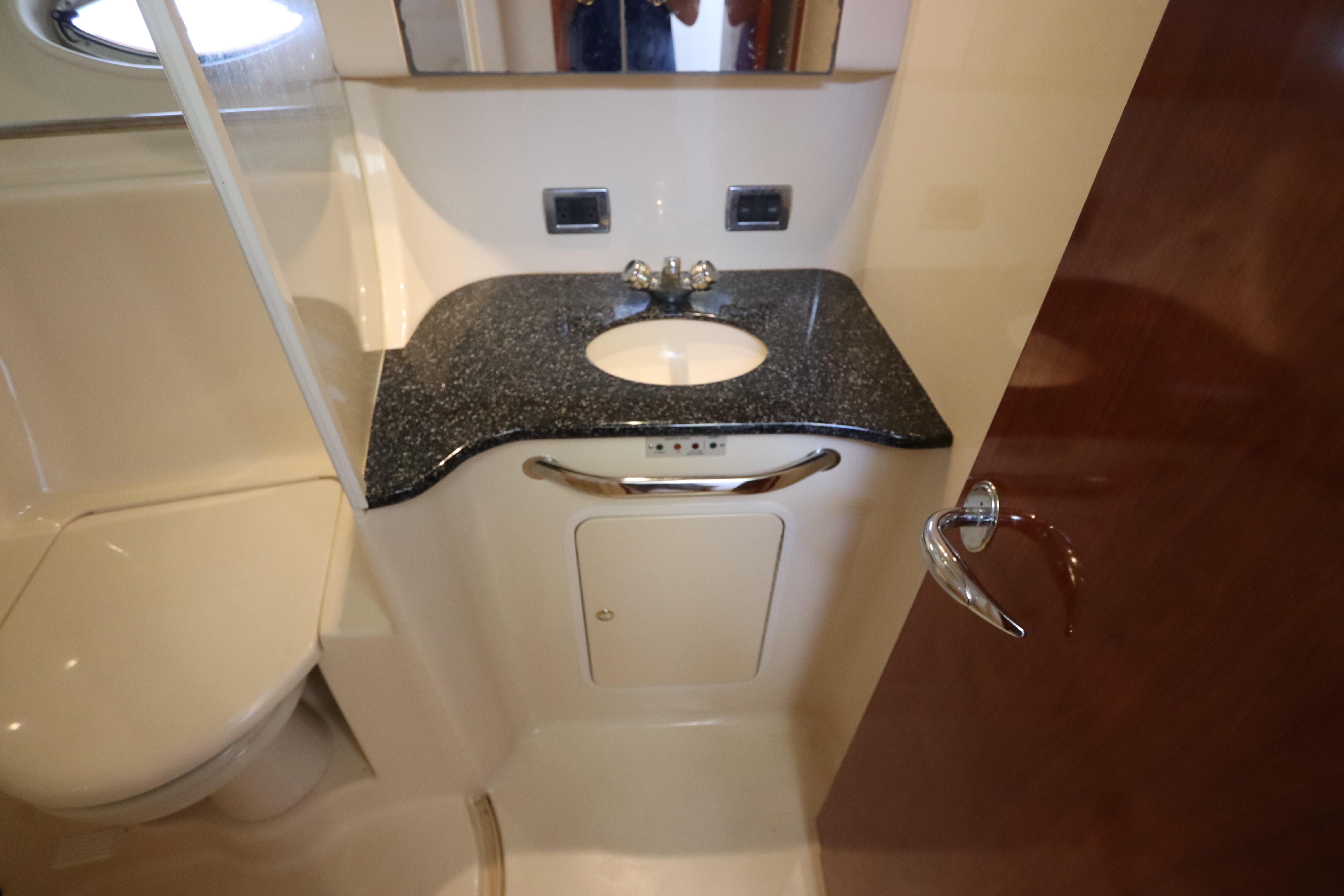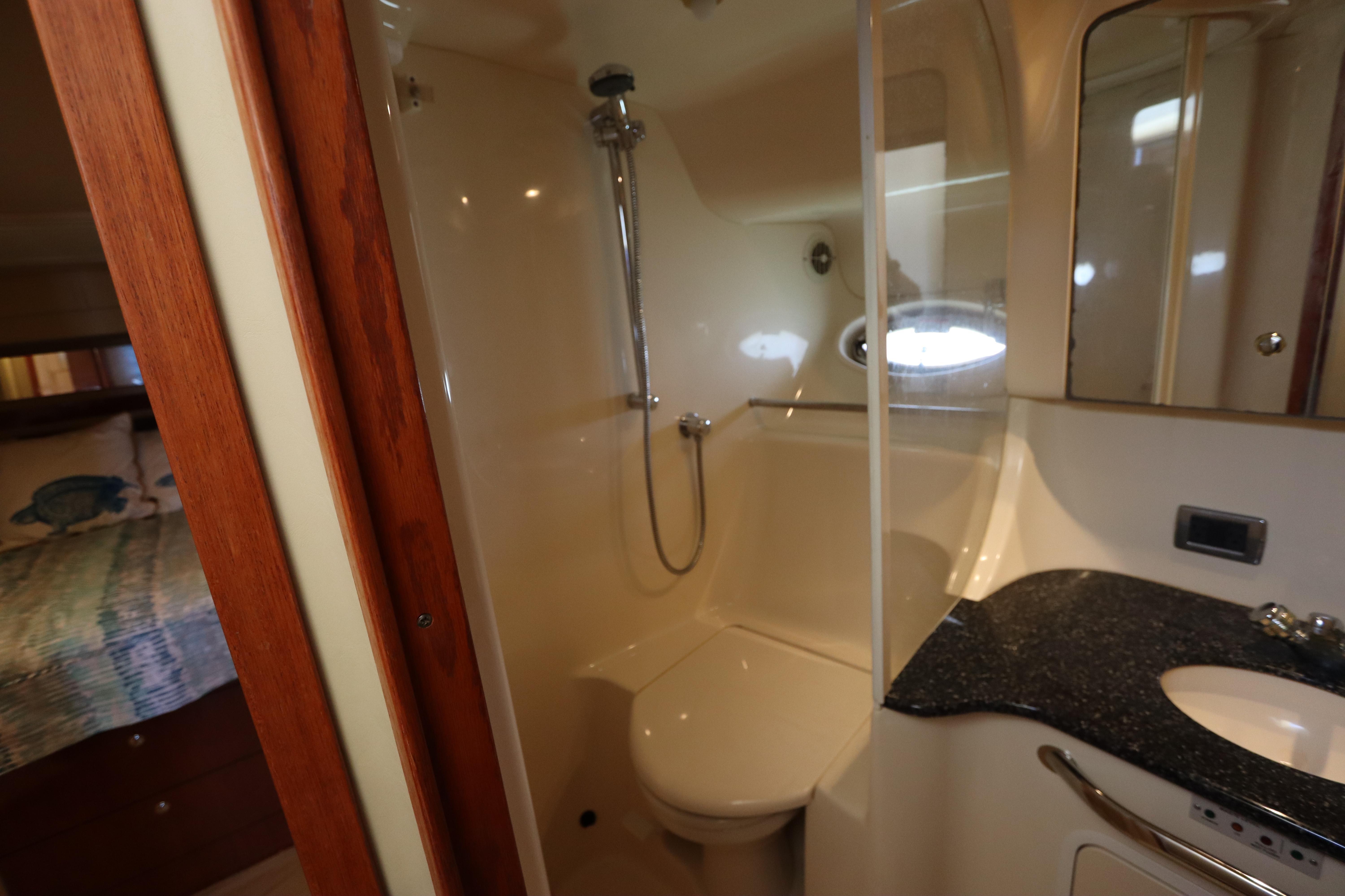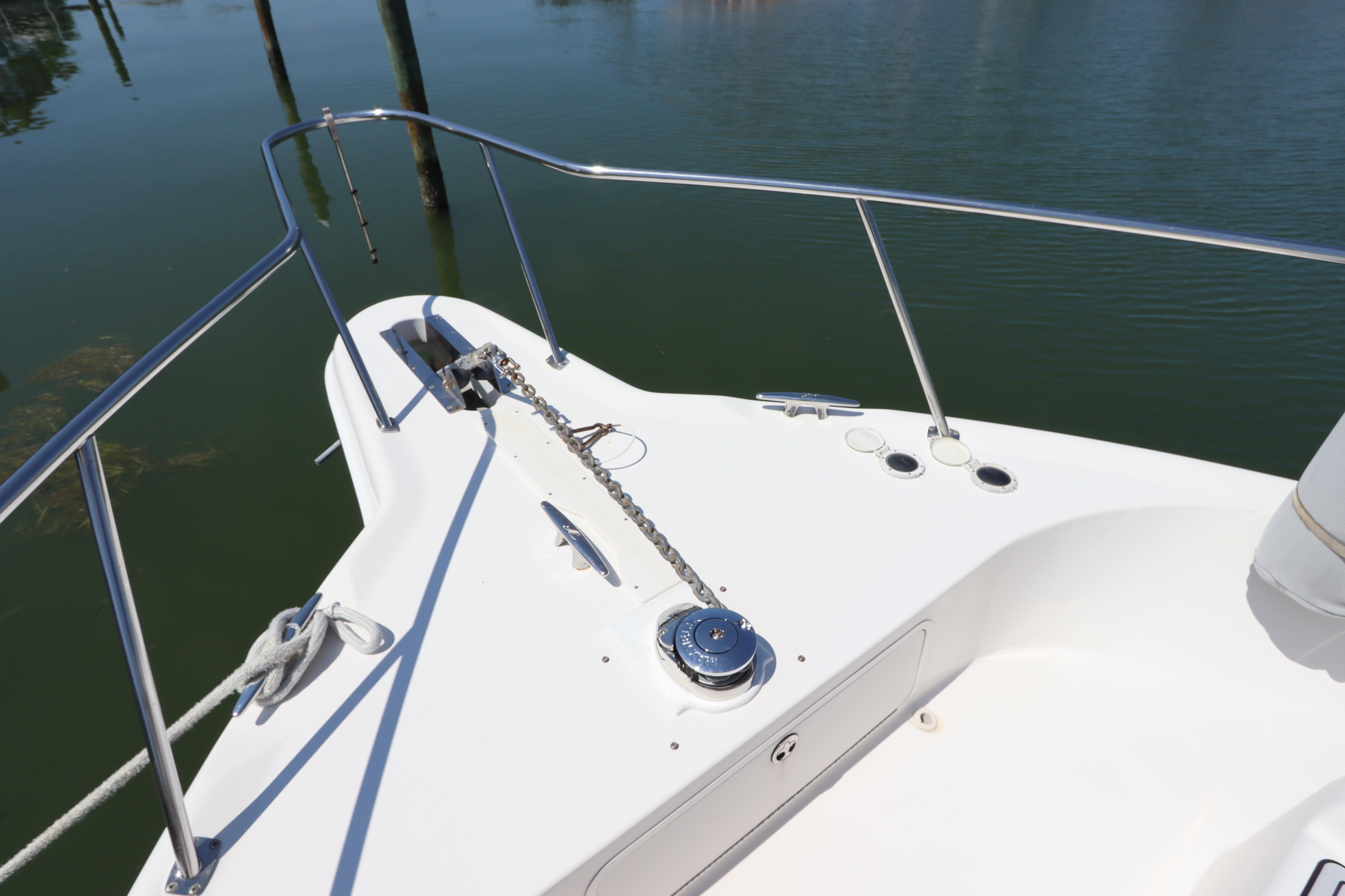 features a double berth with partial standing headroom and an opening port. An island bed is in the master stateroom forward, and both heads include separate stall showers. Across from the dinette (and aft of the galley) is a breakfast bar with two swing- out stools. High-gloss cherry cabinets, faux granite countertops, and vinyl overheads highlight this upscale interior, but small salon windows limit natural lighting below. Topside, the huge party-time flybridge has seating fore and aft of the wraparound helm console. Another unique feature of the 450 Express Bridge is the staircase descending from the flybridge to the foredeck. Cummins 450hp