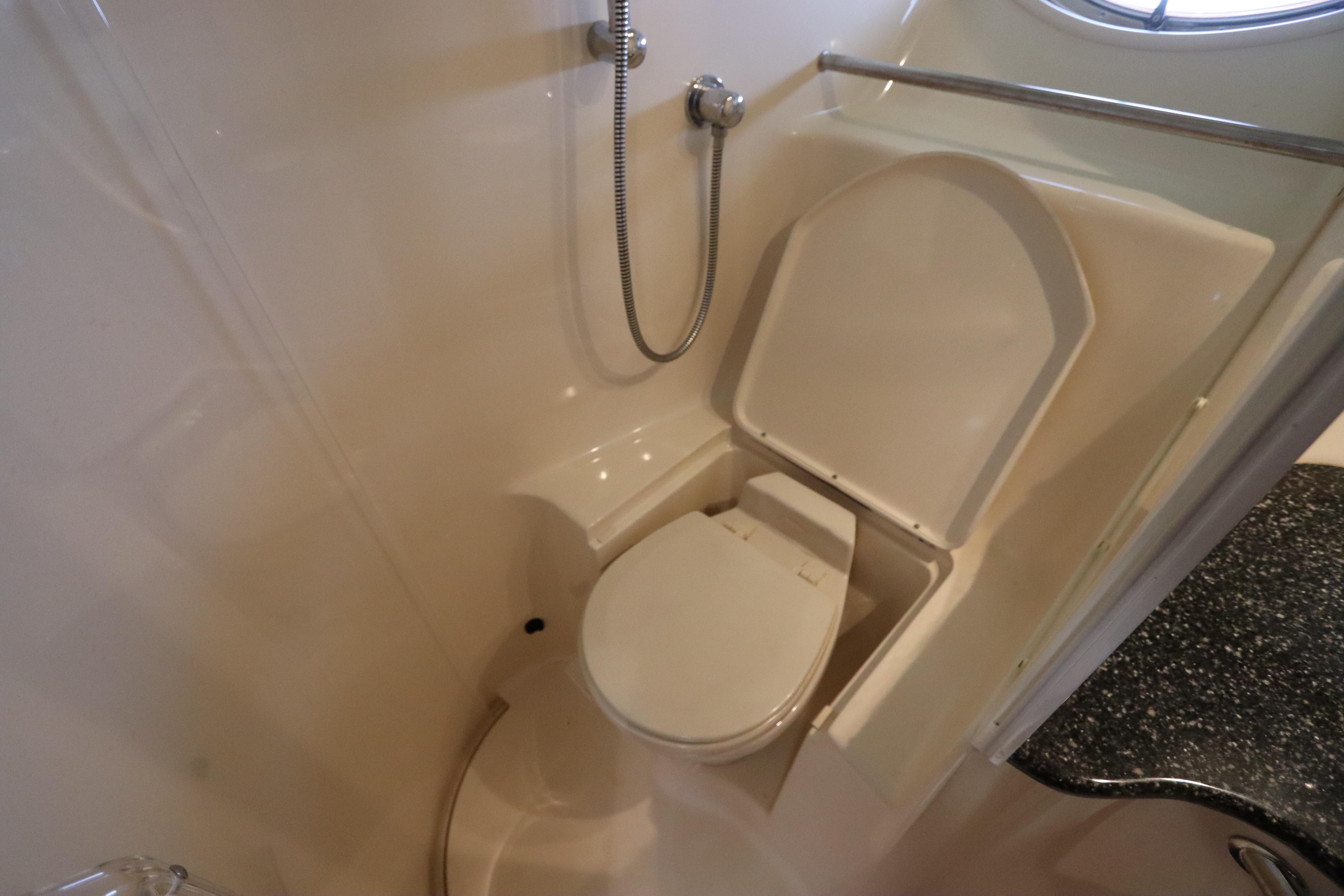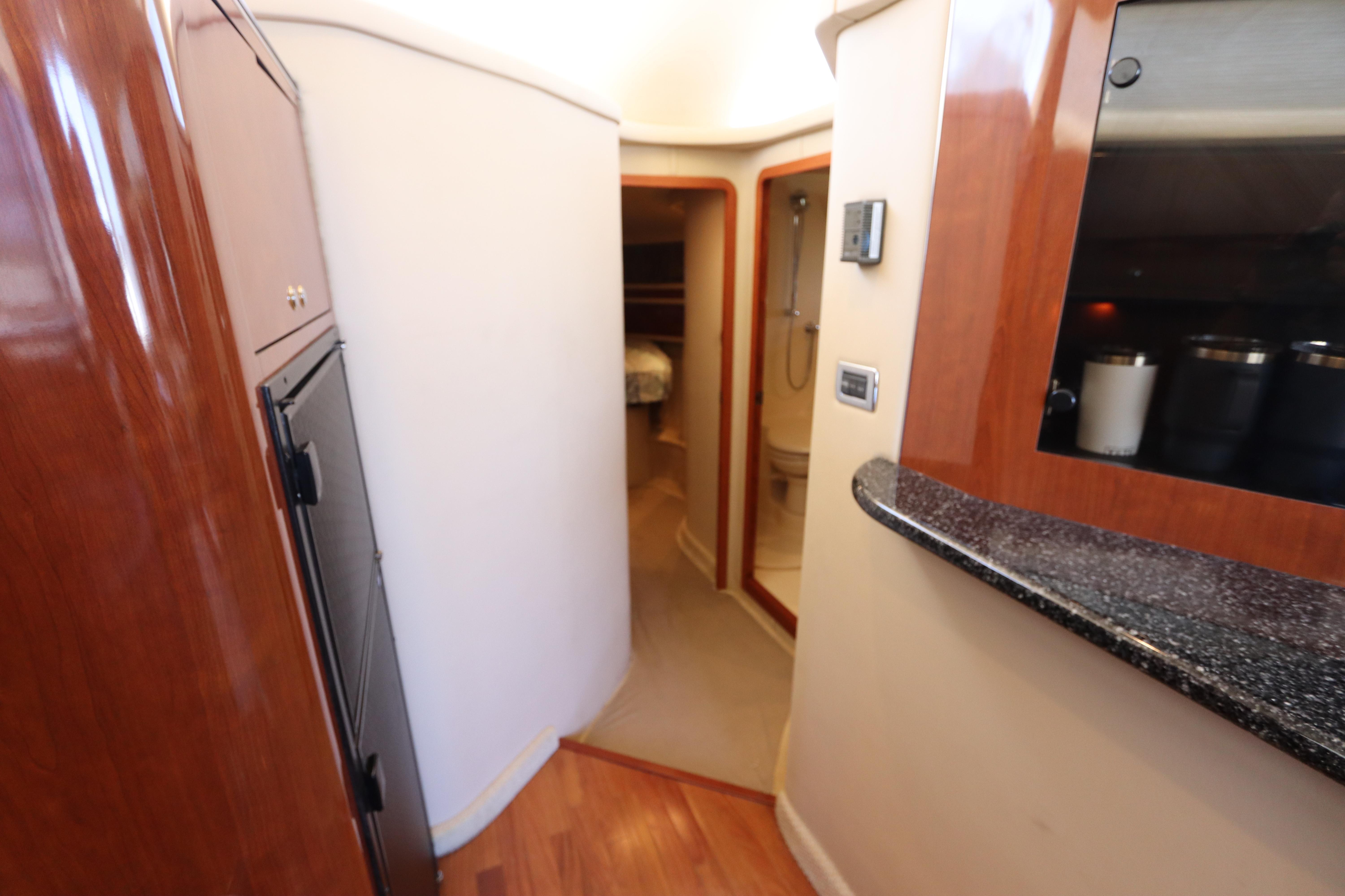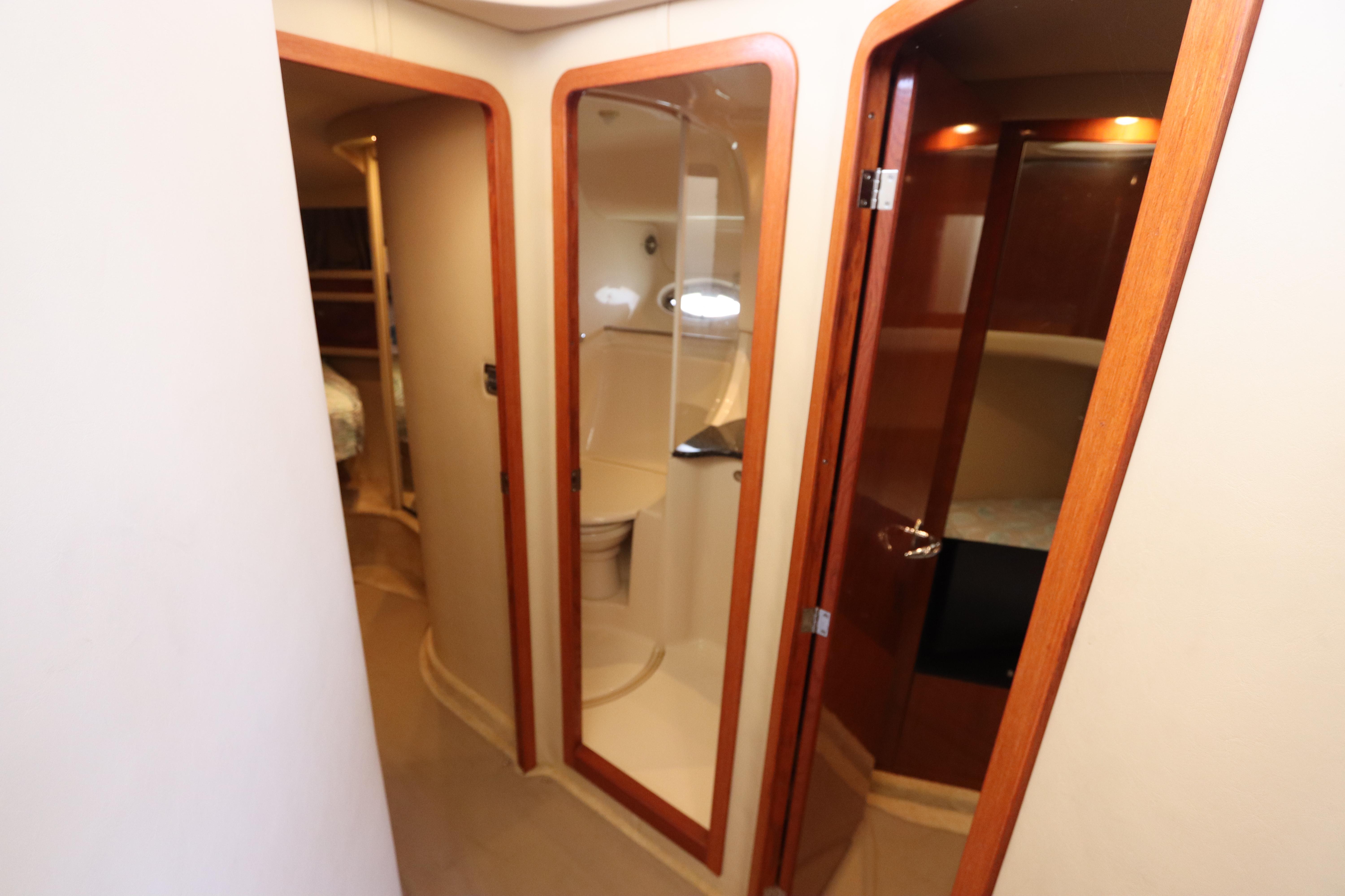 Sea Ray moved the innovation bar up a notch in 1998 with the introduction of the 450 Express Bridge. It wasn’t just the sleek, low-profile styling that drew attention; the real innovation is below where the 450’s spacious step-down interior conceals two small staterooms beneath the raised settee/dinette to starboard in the salon. The aft stateroom — accessed via a private entryway next to the salon door — includes a full-length bed with hanging locker and built-in washer/dryer. Forward of that, the amidships stateroom