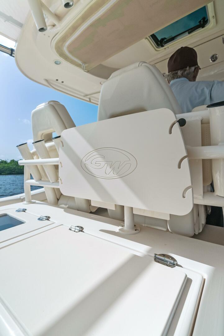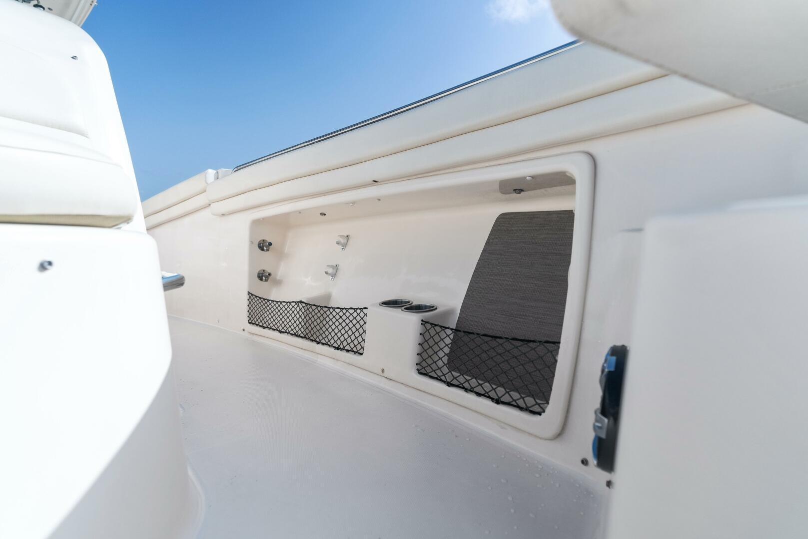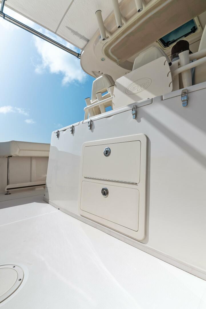 - Storage - rod pods with nets, LED lighting & drink holders (4) Transom door - fiberglass