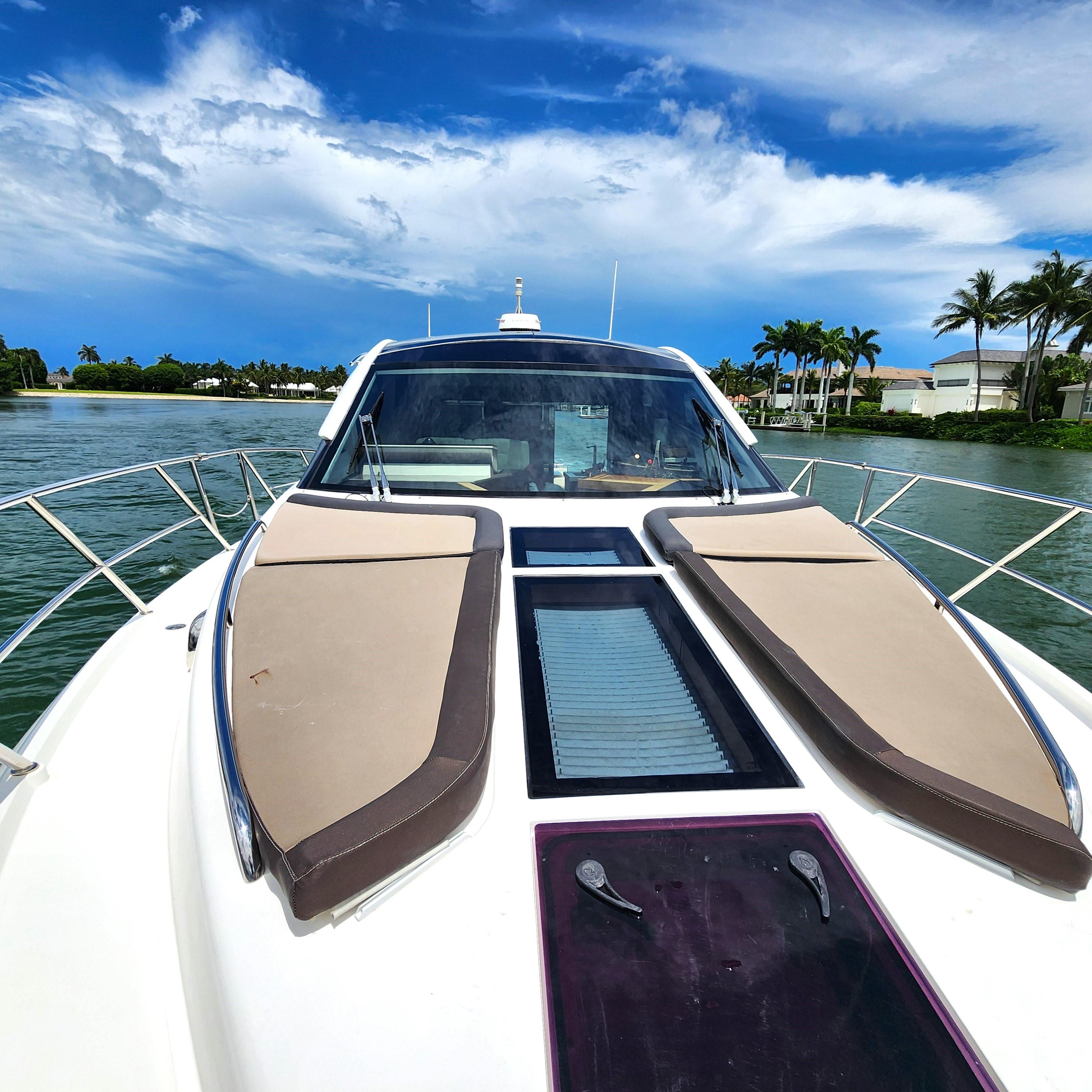 Bottom paint Bow deck rail, 316 stainless steel with side access Cleats, stainless steel 11.5” (6) Fiberglass engine room air intakes and stainless steel outputs Flooring, molded non-skid (bow and side deck) Handrails, 316 stainless steel (cockpit, side deck and sunpad) Hatch, foredeck square with integrated skylights Horn, electric Lights, navigation Mooring System • Reversible electric anchor winch • Anchor roller • Galvanized anchor, 44 LB (20 KG) with 197 FT (60 M) of 5/16” (8 MM) galvanized chain with leash protection • Fiberglass deck hatch to self-draining chain locker Rubrail, PVC with stainless steel insert Spotlight, remote-controlled Thru-hull fittings, stainless steel Windows, bonded tempered glass (hullside) with integrated opening rectangular portholes Windshield, tempered and tinted glass (bonded), single pane forward glass Windshield defroster
