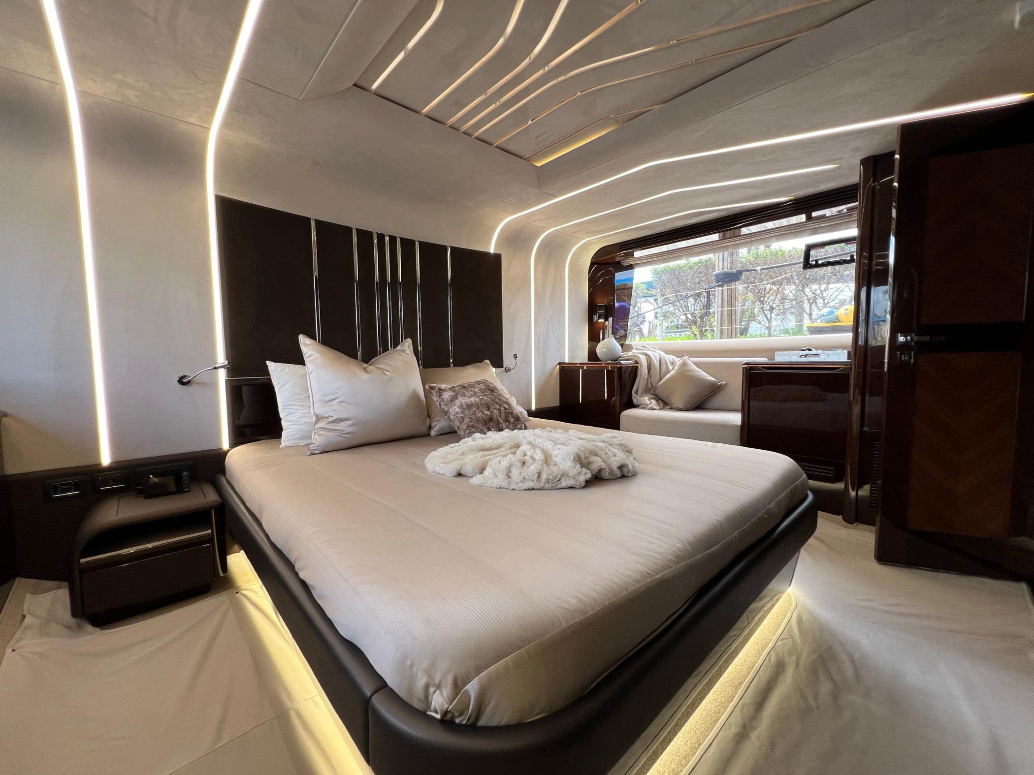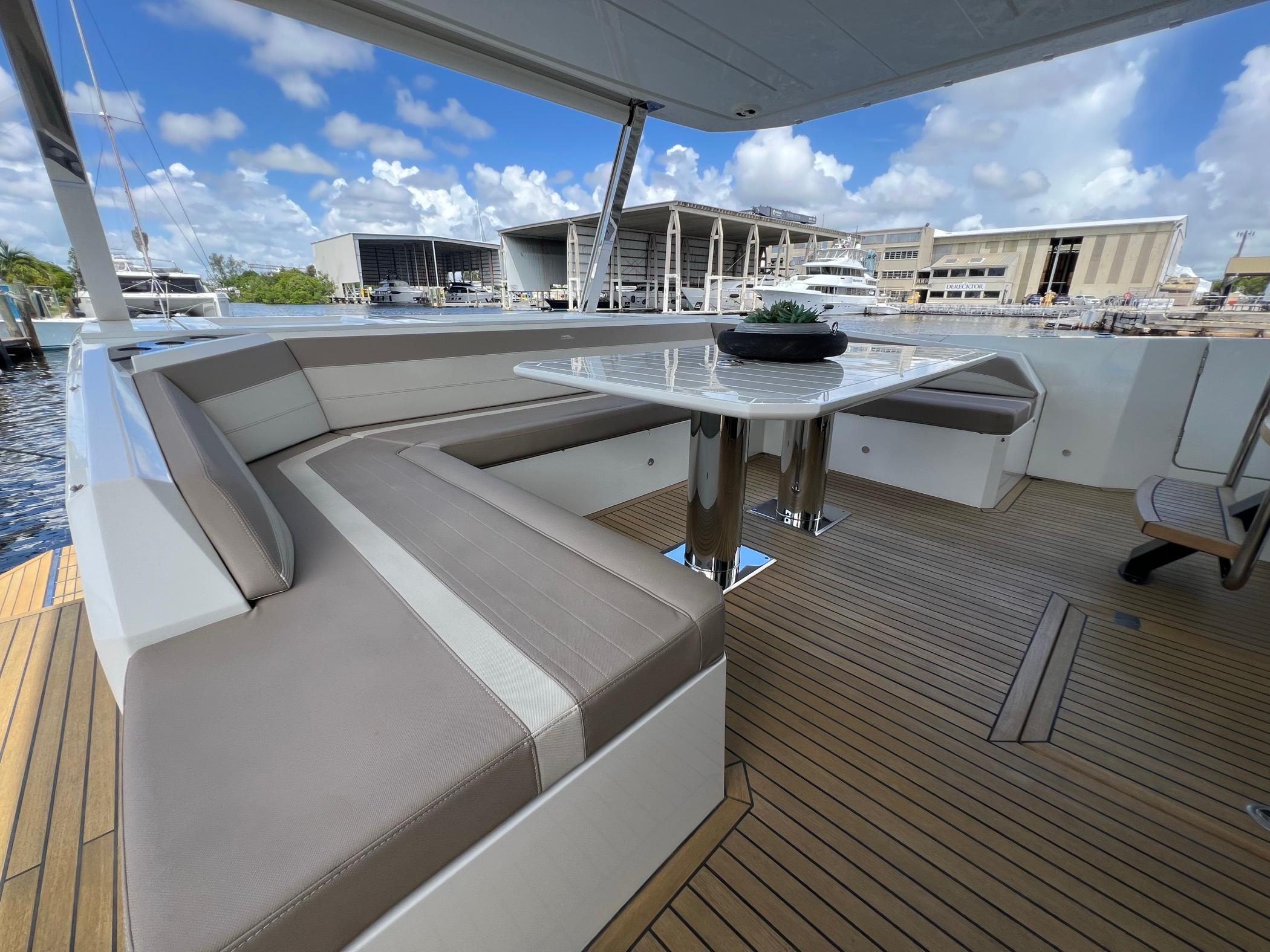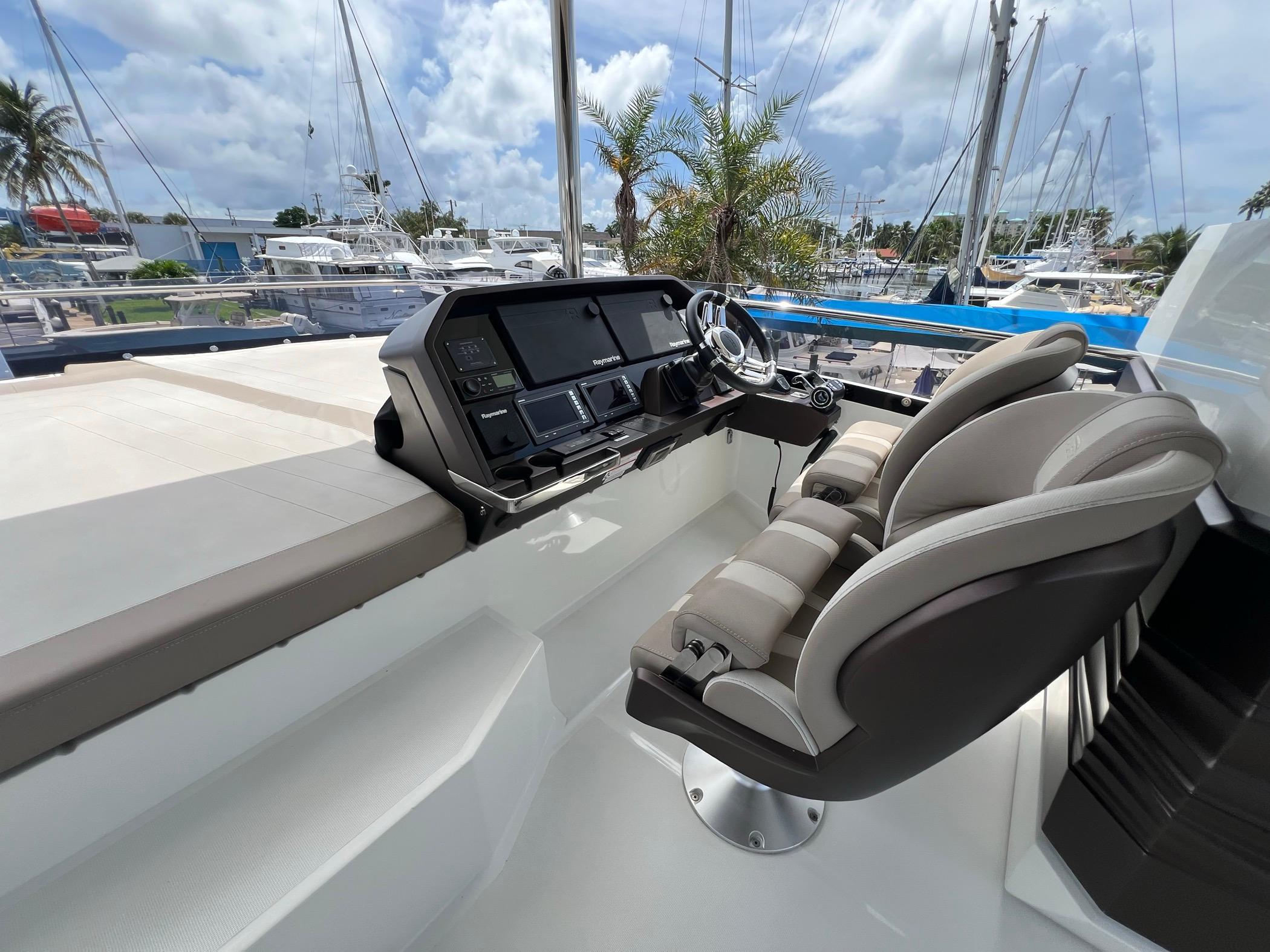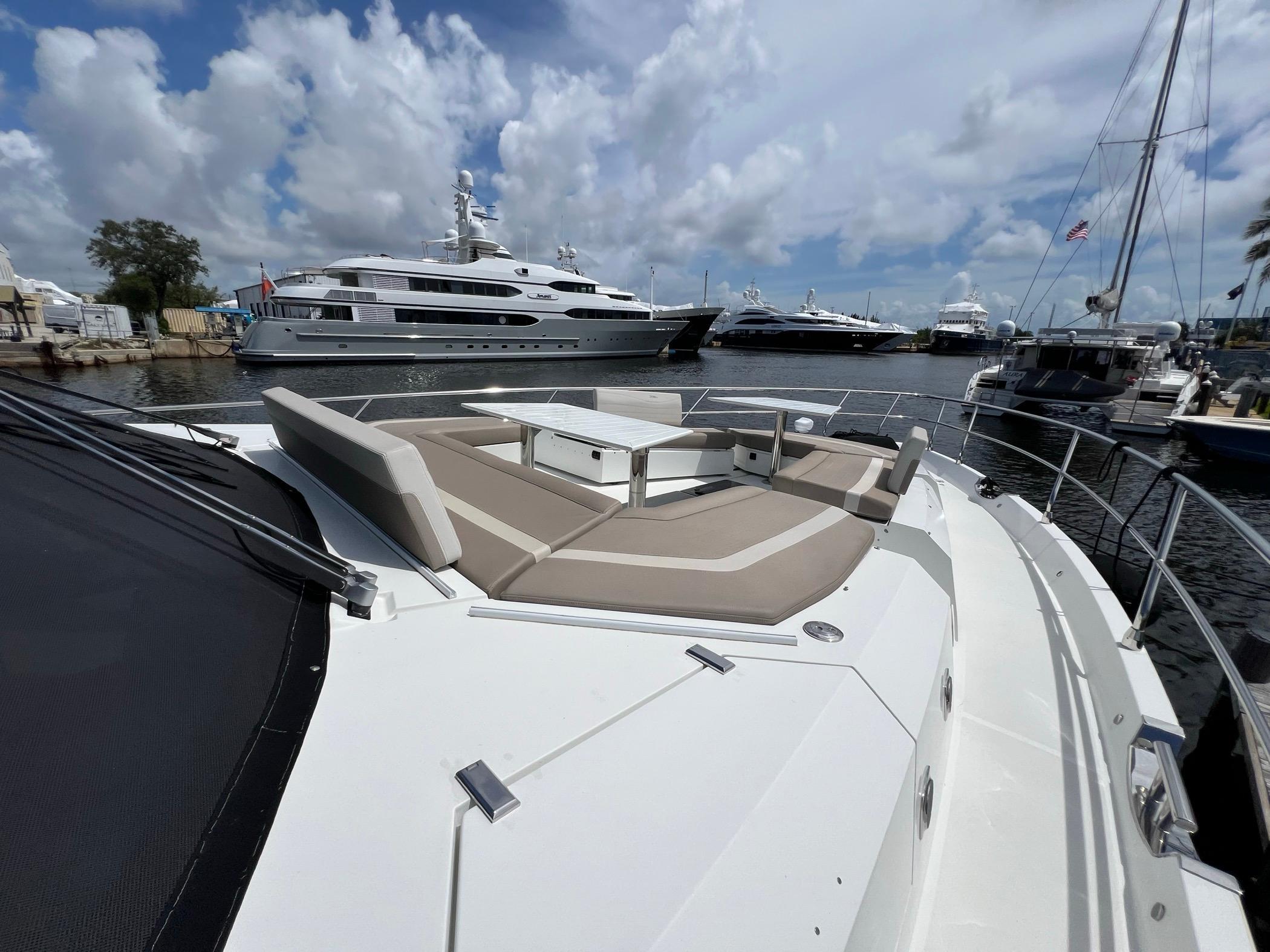 The foredeck can be transformed into an expansive seating area with a touch of a button for sunning or sunset cruising. The vast Flybridge is most impressive with plentiful seating, wet bar entertaining, and a carbon hardtop and the opening windows in the salon allow cool breezes to sinuously blend inside and outside spaces. With 4 cabins, 30+ knot performance, and amazing innovation the 680 FLY sets new benchmarks.