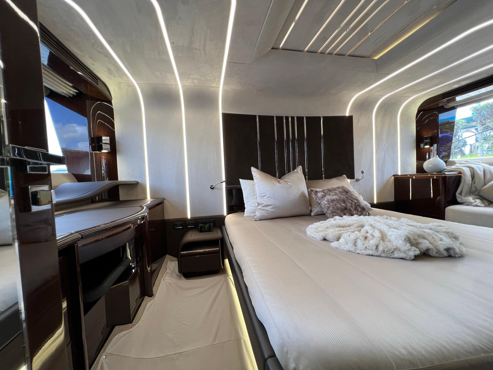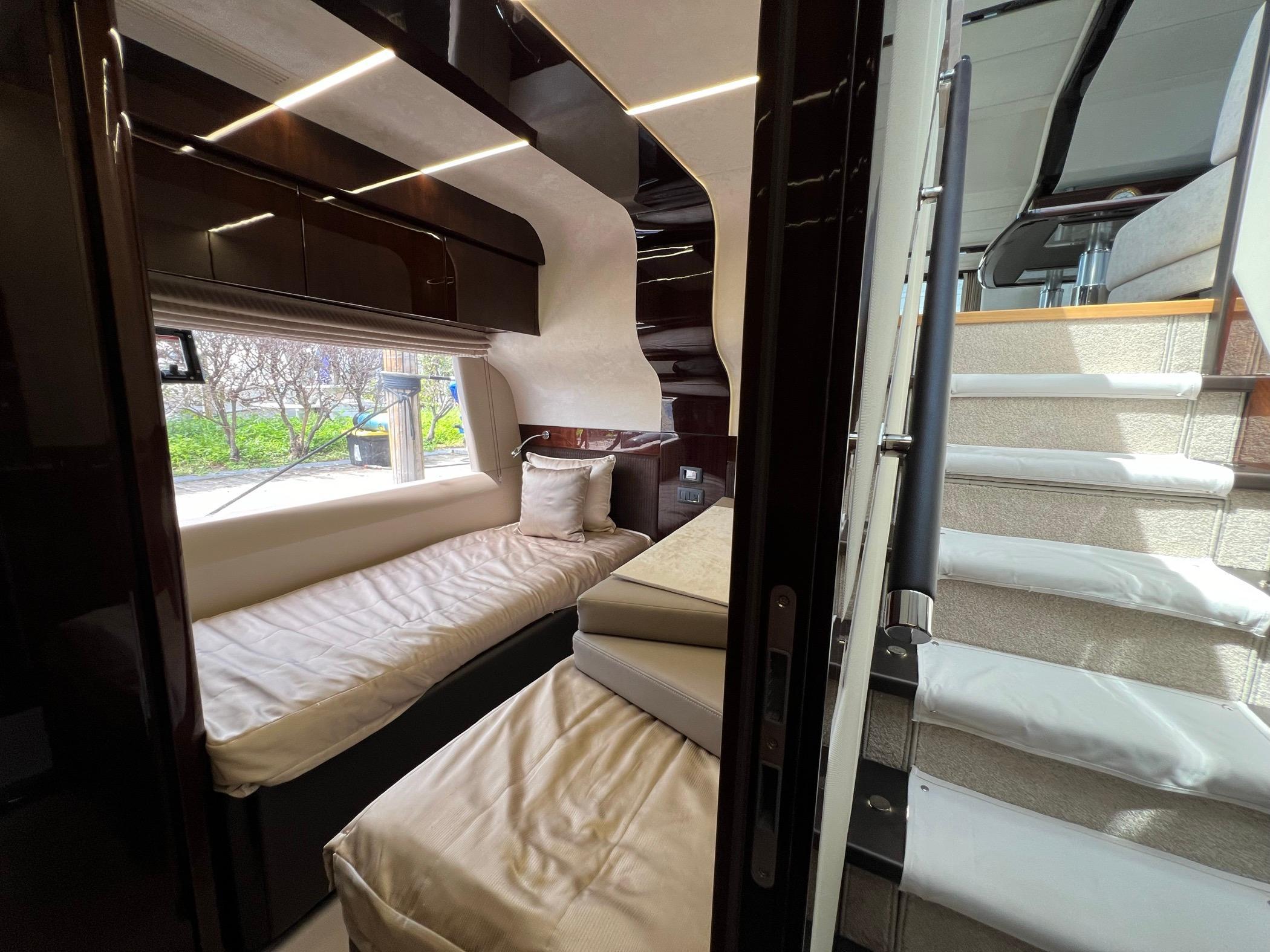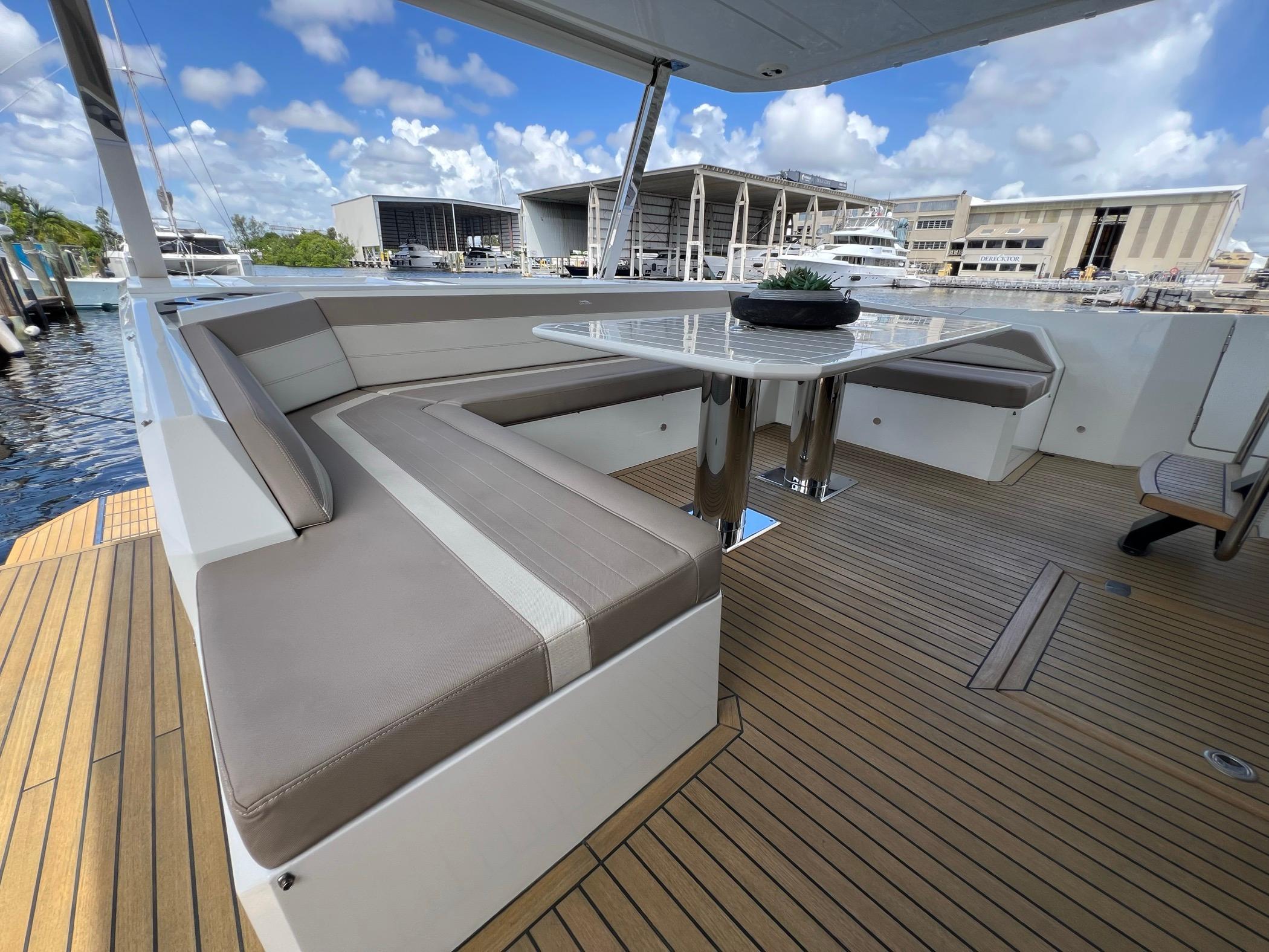 The foredeck can be transformed into an expansive seating area with a touch of a button for sunning or sunset cruising. The vast Flybridge is most impressive with plentiful seating, wet bar entertaining, and a carbon hardtop and the opening windows in the salon allow cool breezes to sinuously blend inside and outside spaces. With 4 cabins, 30+ knot performance, and amazing innovation the 680 FLY sets new benchmarks.